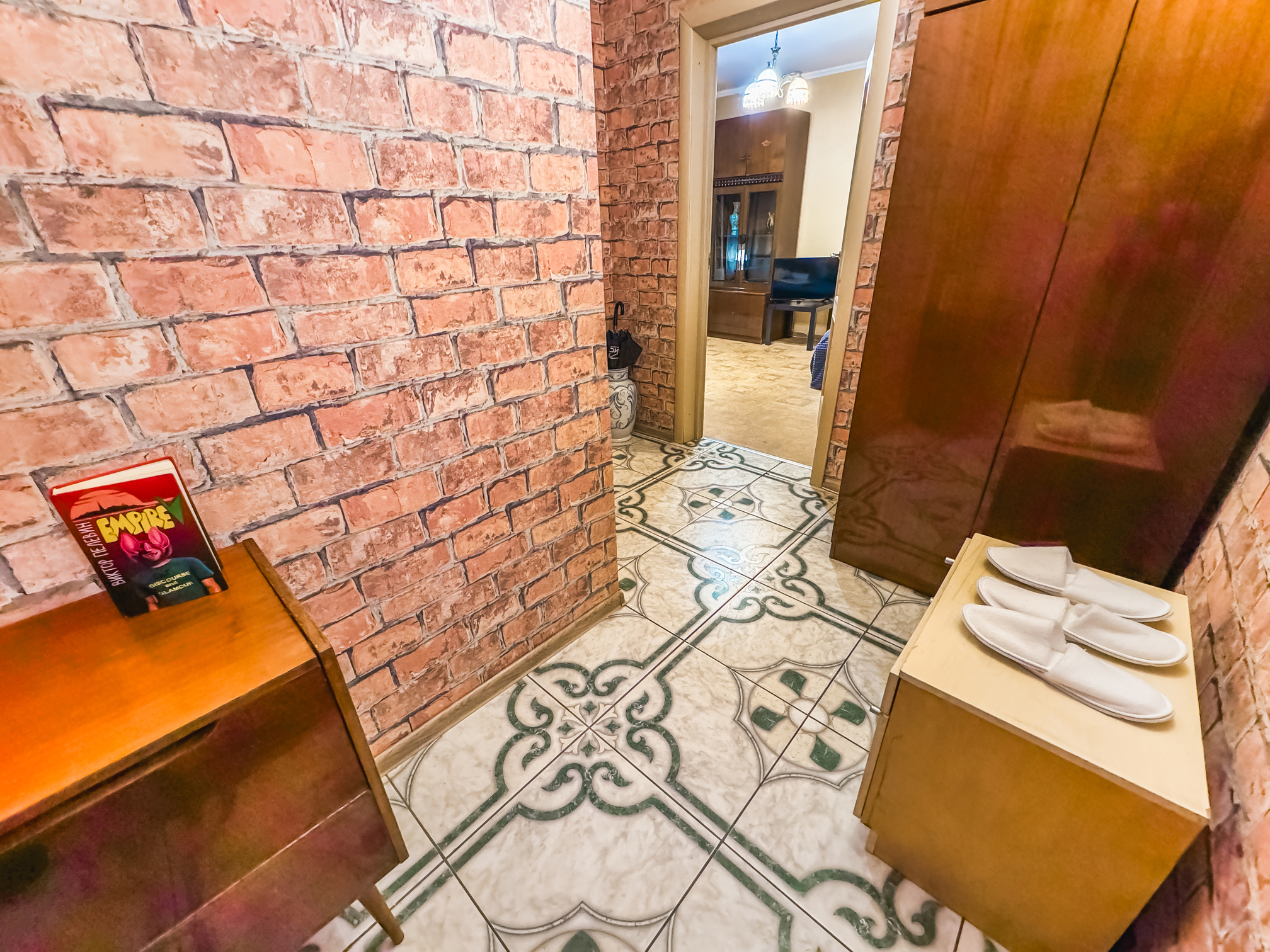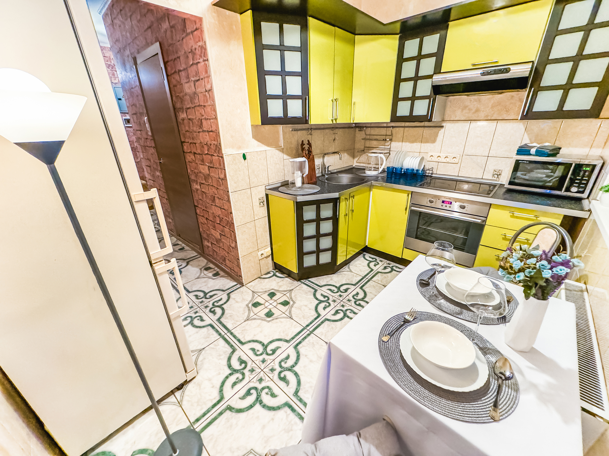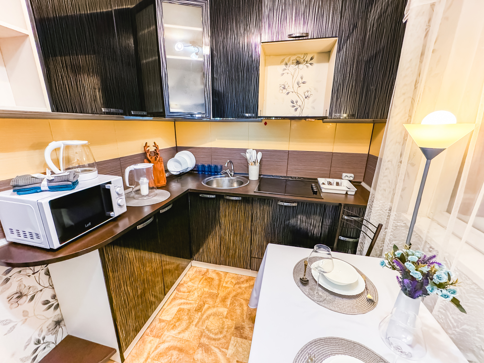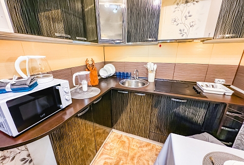 В номере: зеркало, кровать двуспальная, стол, стулья, шкаф, гладильная доска, микроволновая печь, набор посуды, плита электрическая, стиральная машина, сушилка для белья, телевизор ЖК, утюг, холодильник, чайный набор посуды, электрочайник