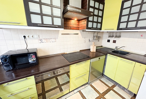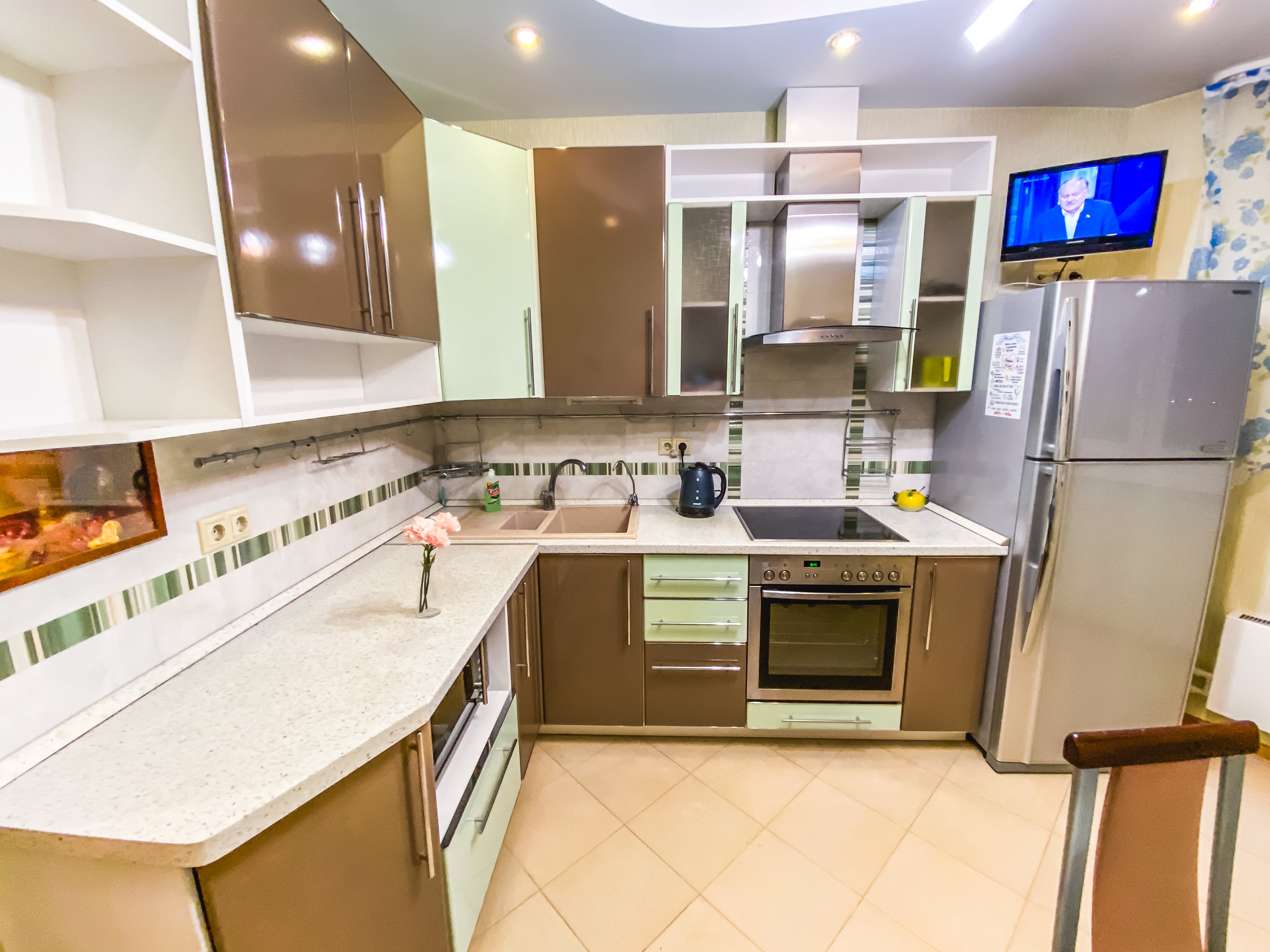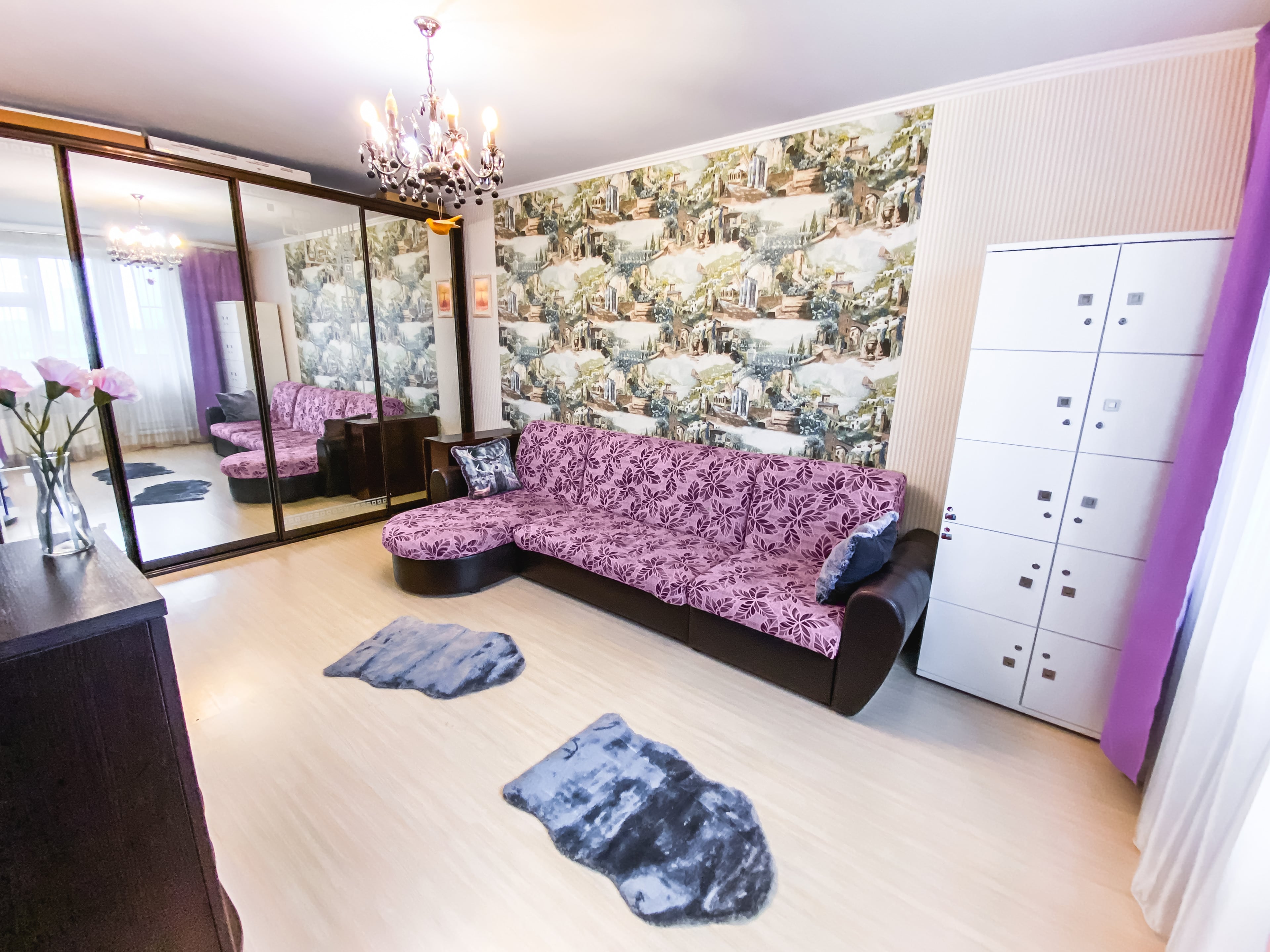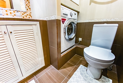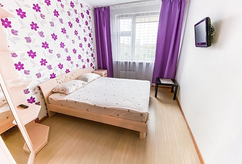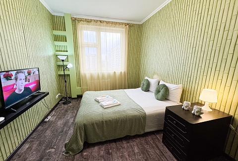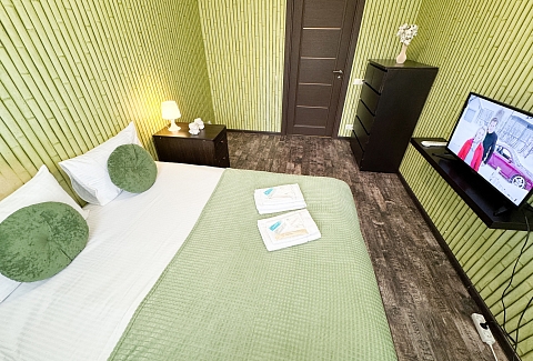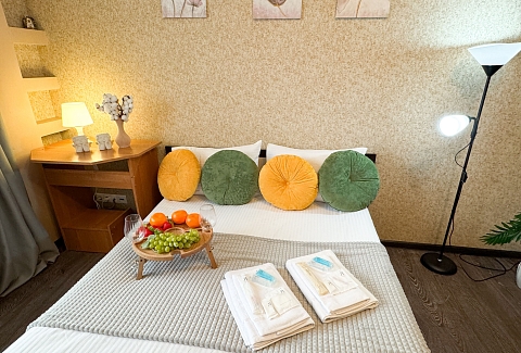 В номере: диван, зеркало, кровать двуспальная, стол, стулья, шкаф, гладильная доска, микроволновая печь, набор посуды, плита электрическая, стиральная машина, сушилка для белья, телевизор ЖК, утюг, холодильник, чайный набор посуды, электрочайник