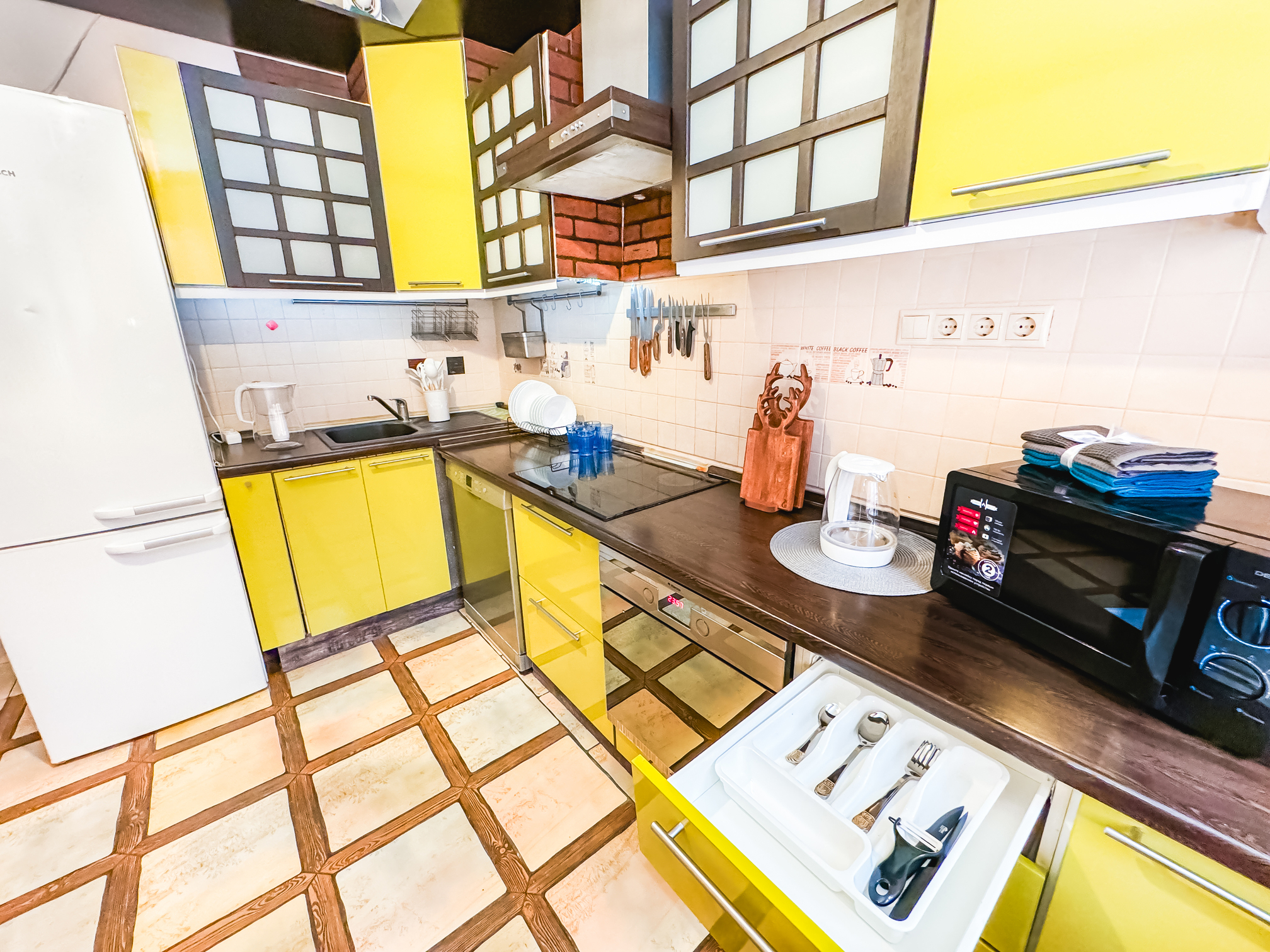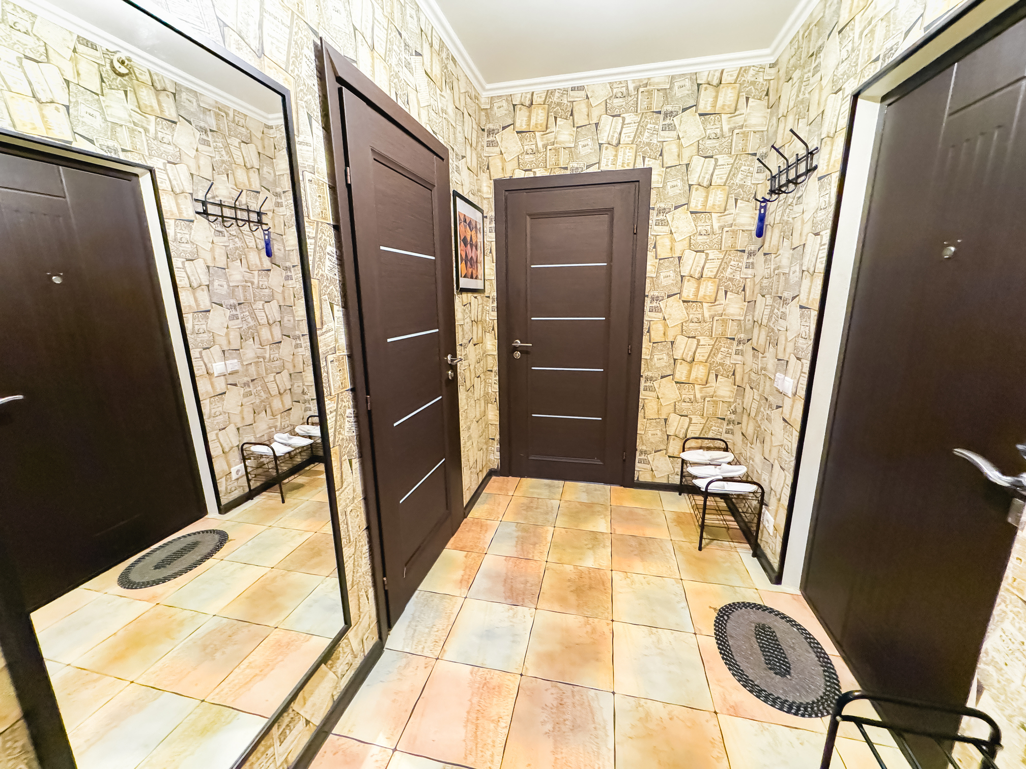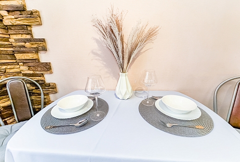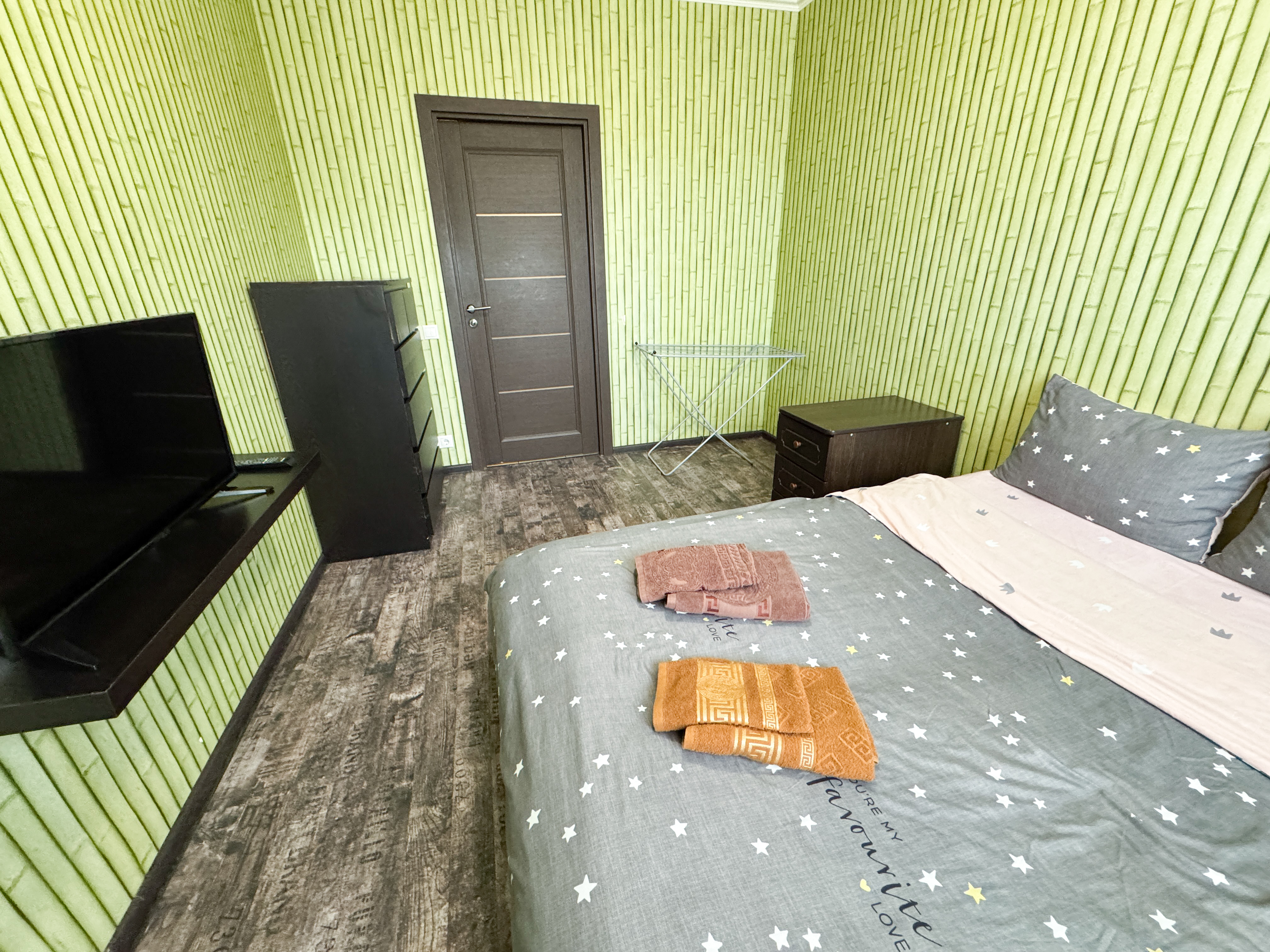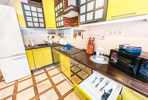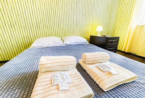 В номере: диван, зеркало, кровать двуспальная, стол, стулья, шкаф, гладильная доска, микроволновая печь, набор посуды, плита электрическая, стиральная машина, сушилка для белья, телевизор ЖК, утюг, холодильник, чайный набор посуды, электрочайник