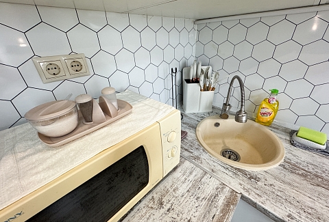 В номере: зеркало, кровать двуспальная, стол, стулья, шкаф, гладильная доска, микроволновая печь, набор посуды, плита электрическая, стиральная машина, сушилка для белья, телевизор ЖК, утюг, холодильник, чайный набор посуды, электрочайник