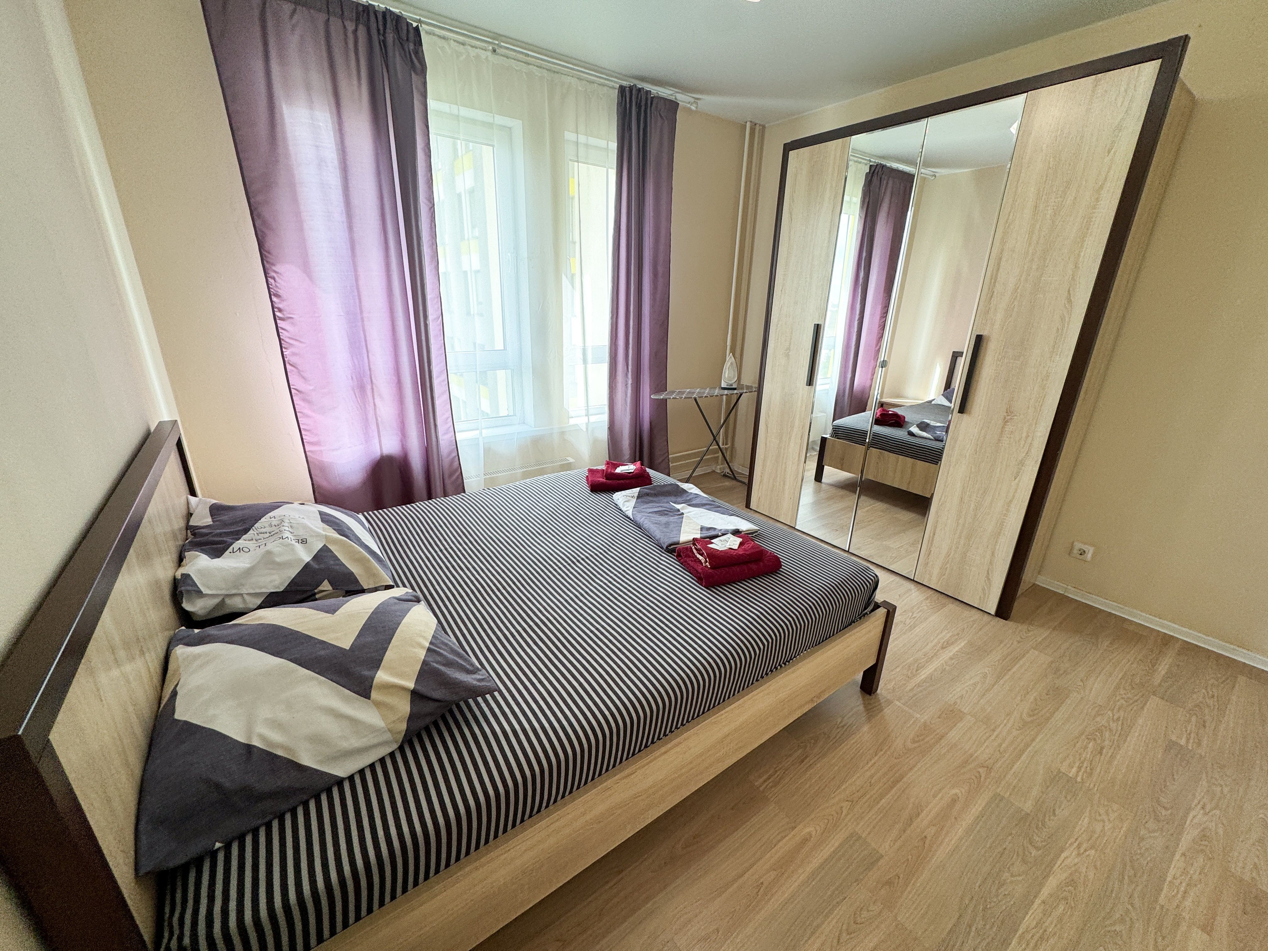 В номере: зеркало, кровать двуспальная, прикроватные тумбочки, стол, стулья, шкаф, гладильная доска, кондиционер, микроволновая печь, набор посуды, плита электрическая, стиральная машина, сушилка для белья, телевизор ЖК, утюг, холодильник, чайный набор посуды, электрочайник
