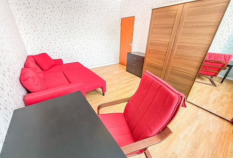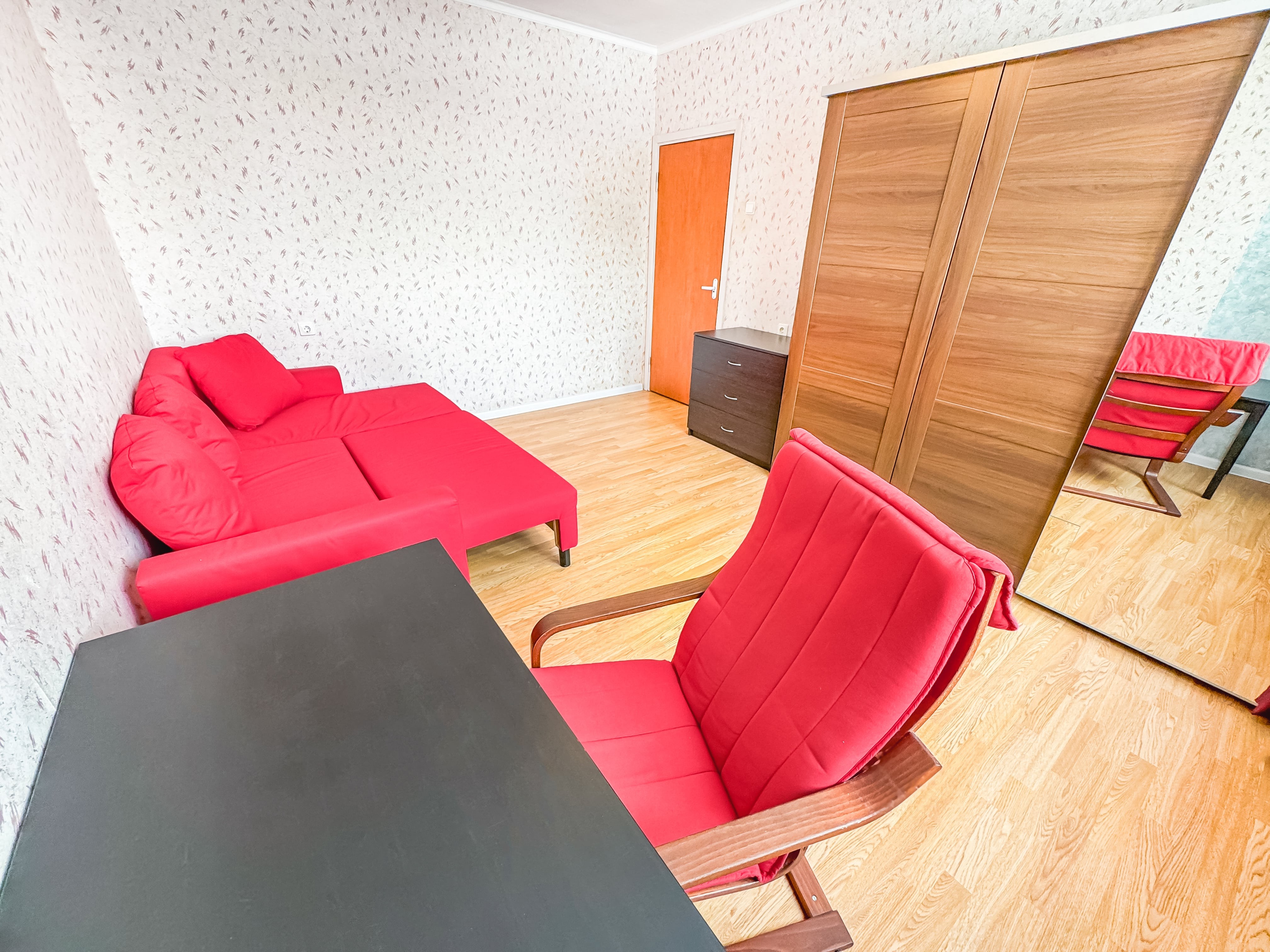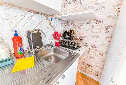 В номере: диван, зеркало, кровать двуспальная, стол, стулья, шкаф, гладильная доска, микроволновая печь, набор посуды, плита электрическая, стиральная машина, сушилка для белья, телевизор ЖК, утюг, холодильник, чайный набор посуды, электрочайник