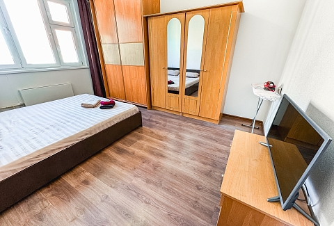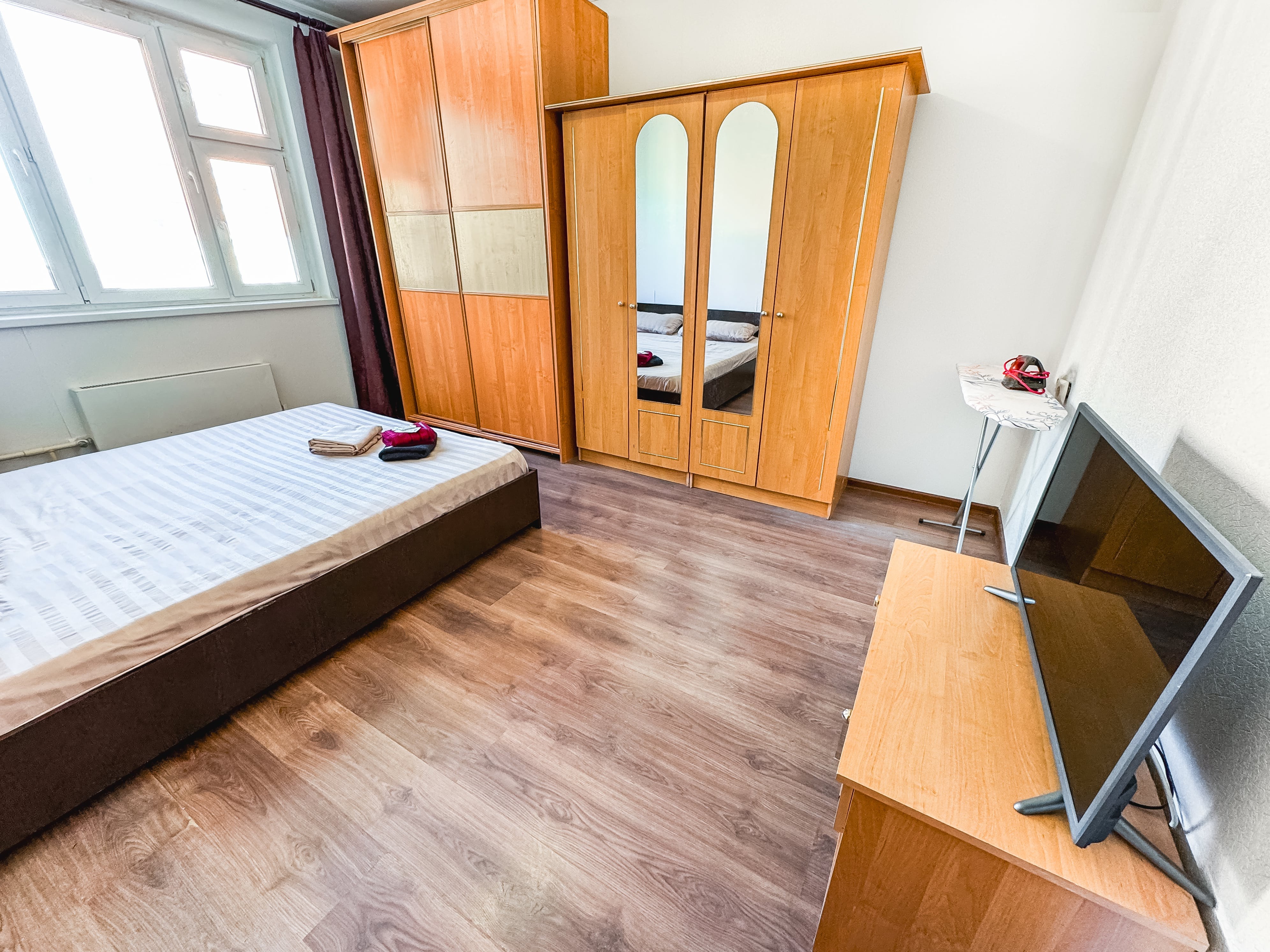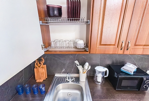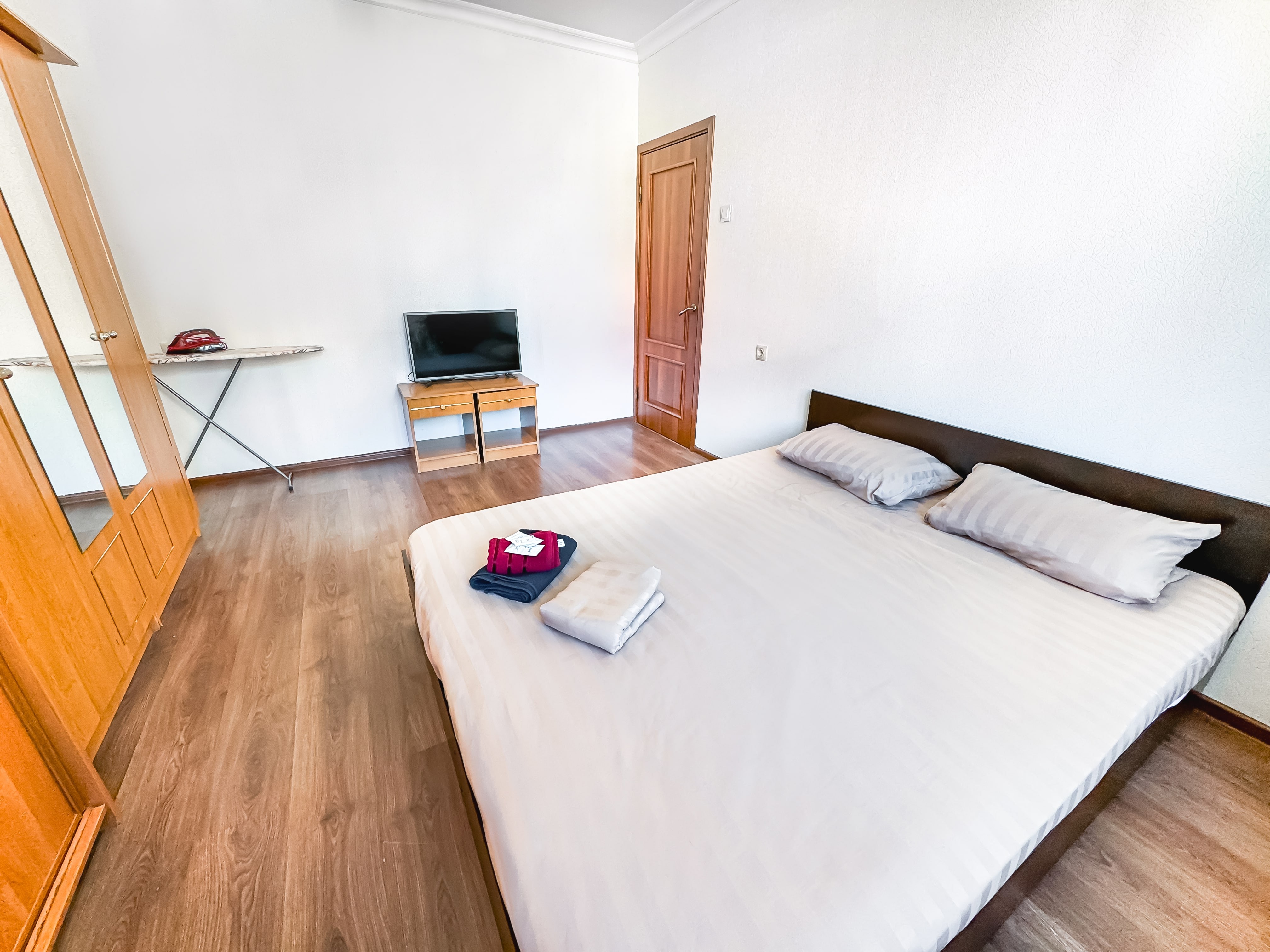 В номере: диван, зеркало, кровать двуспальная, прикроватные тумбочки, стол, стулья, шкаф, гладильная доска, микроволновая печь, набор посуды, плита электрическая, стиральная машина, сушилка для белья, телевизор ЖК, утюг, холодильник, чайный набор посуды, электрочайник