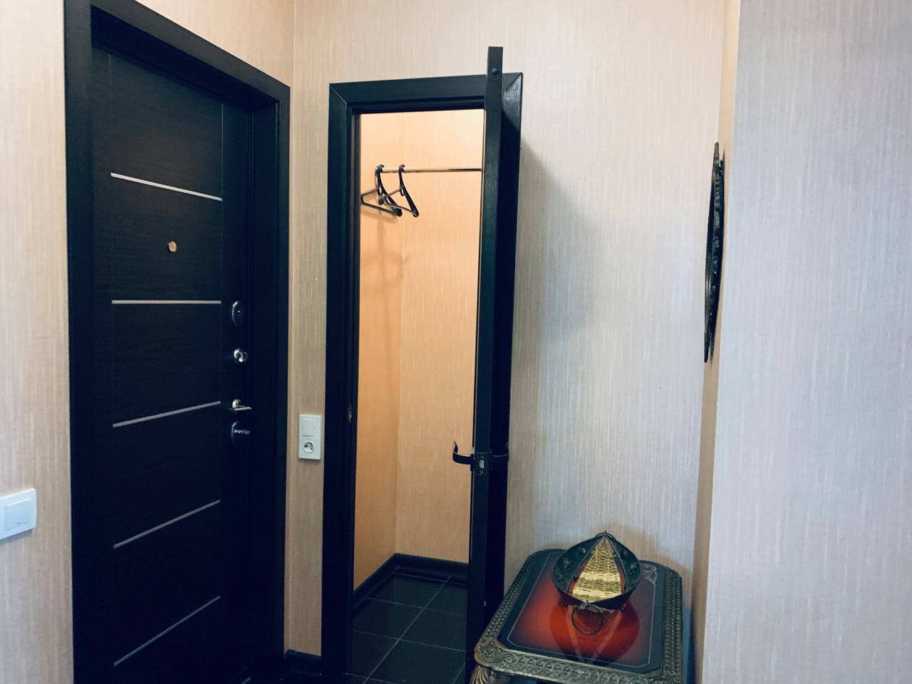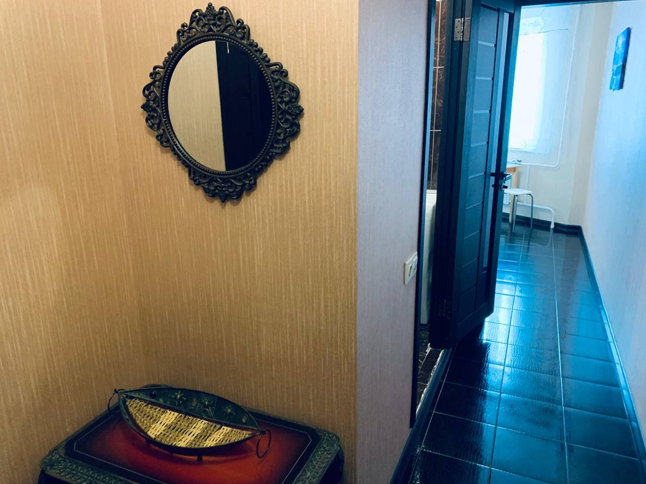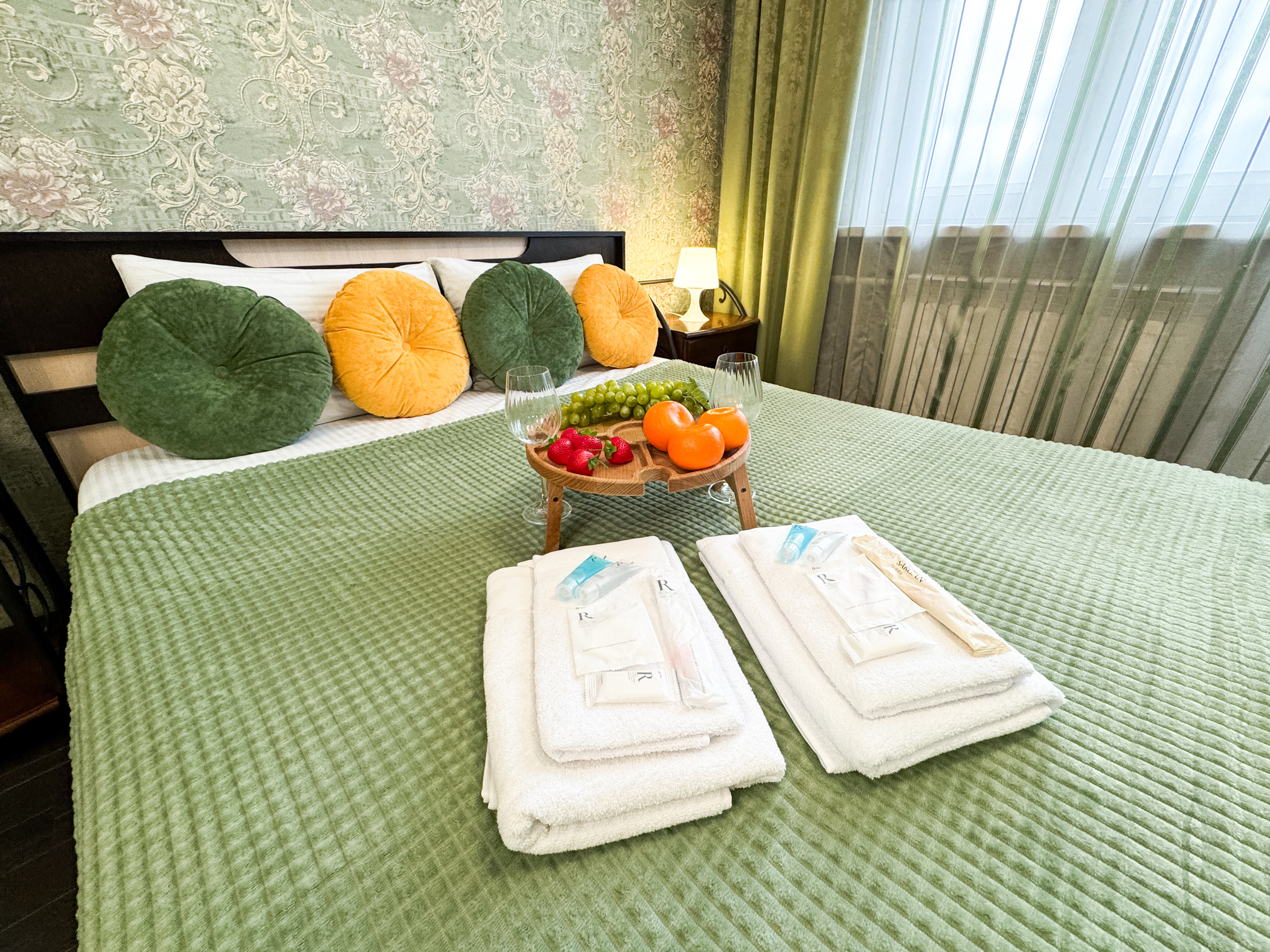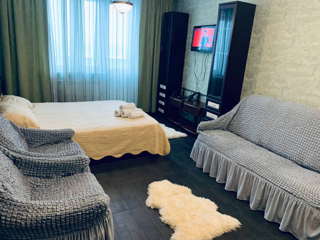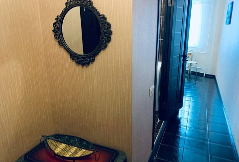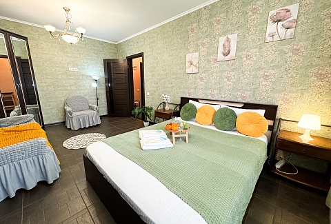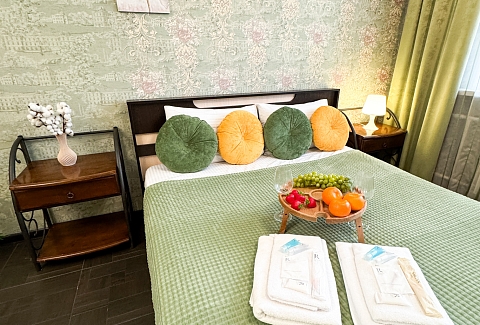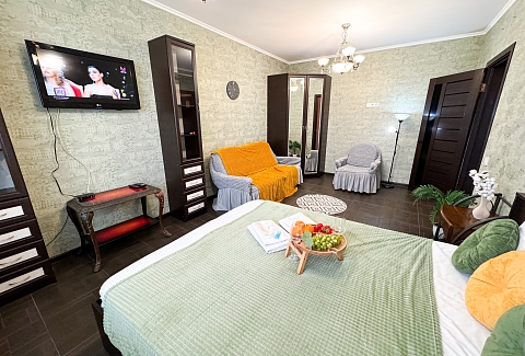 В номере: диван, зеркало, кровать двуспальная, стол, стулья, шкаф, гладильная доска, микроволновая печь, набор посуды, плита электрическая, стиральная машина, сушилка для белья, телевизор ЖК, утюг, холодильник, чайный набор посуды, электрочайник