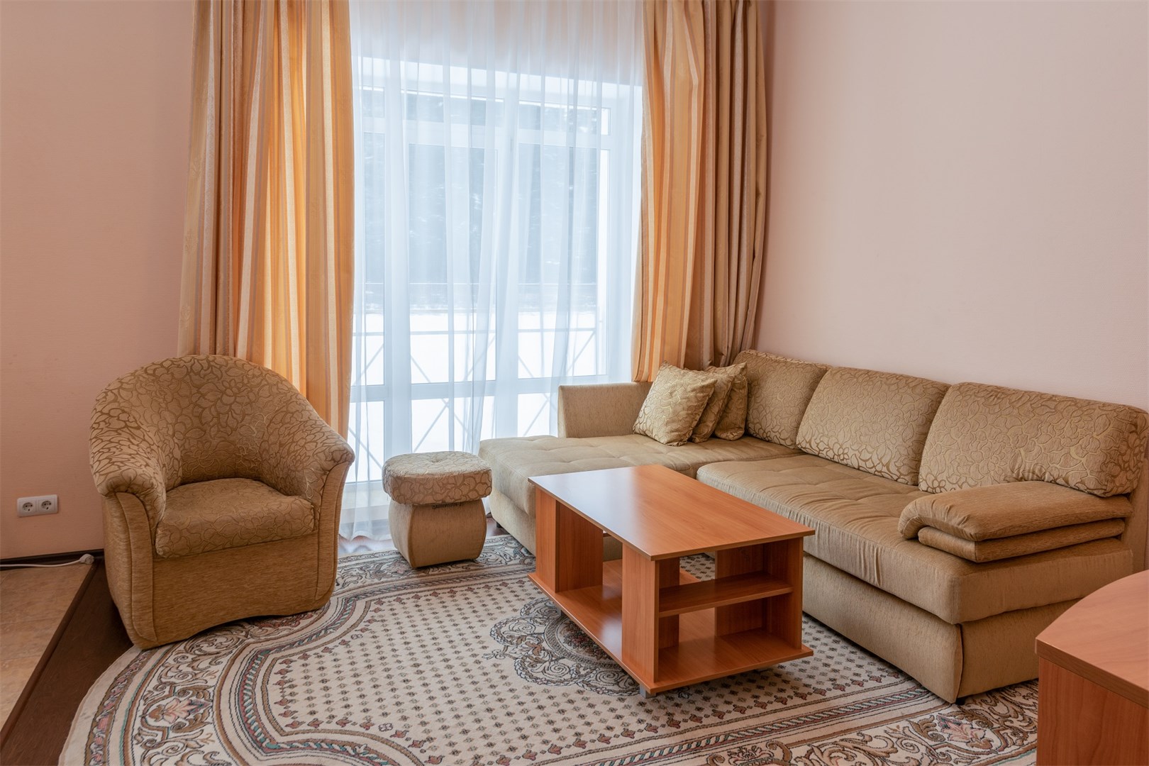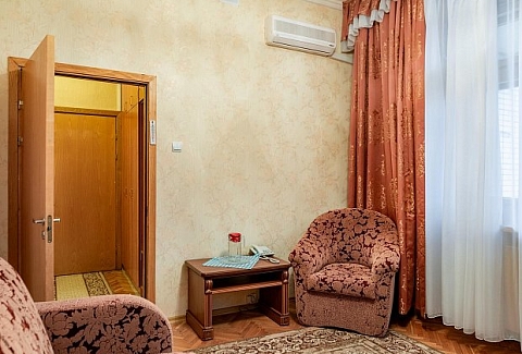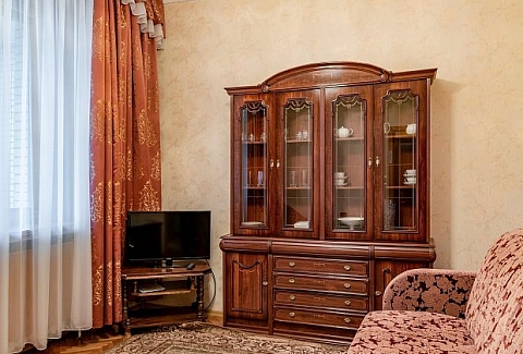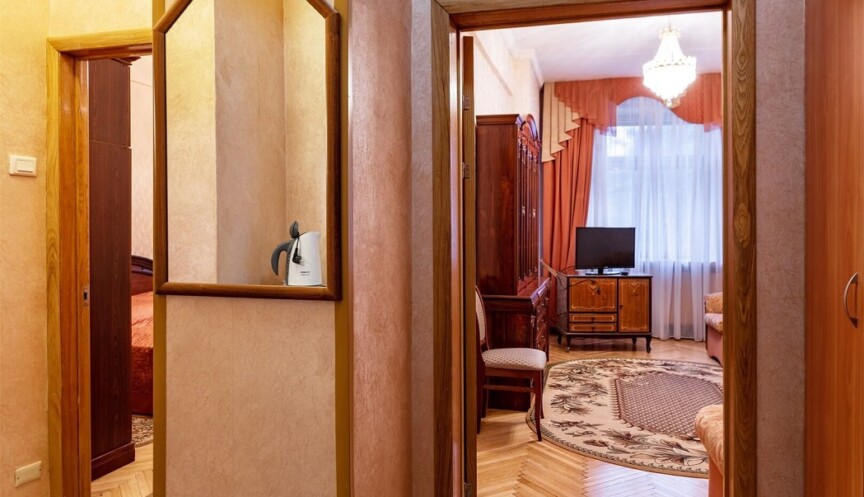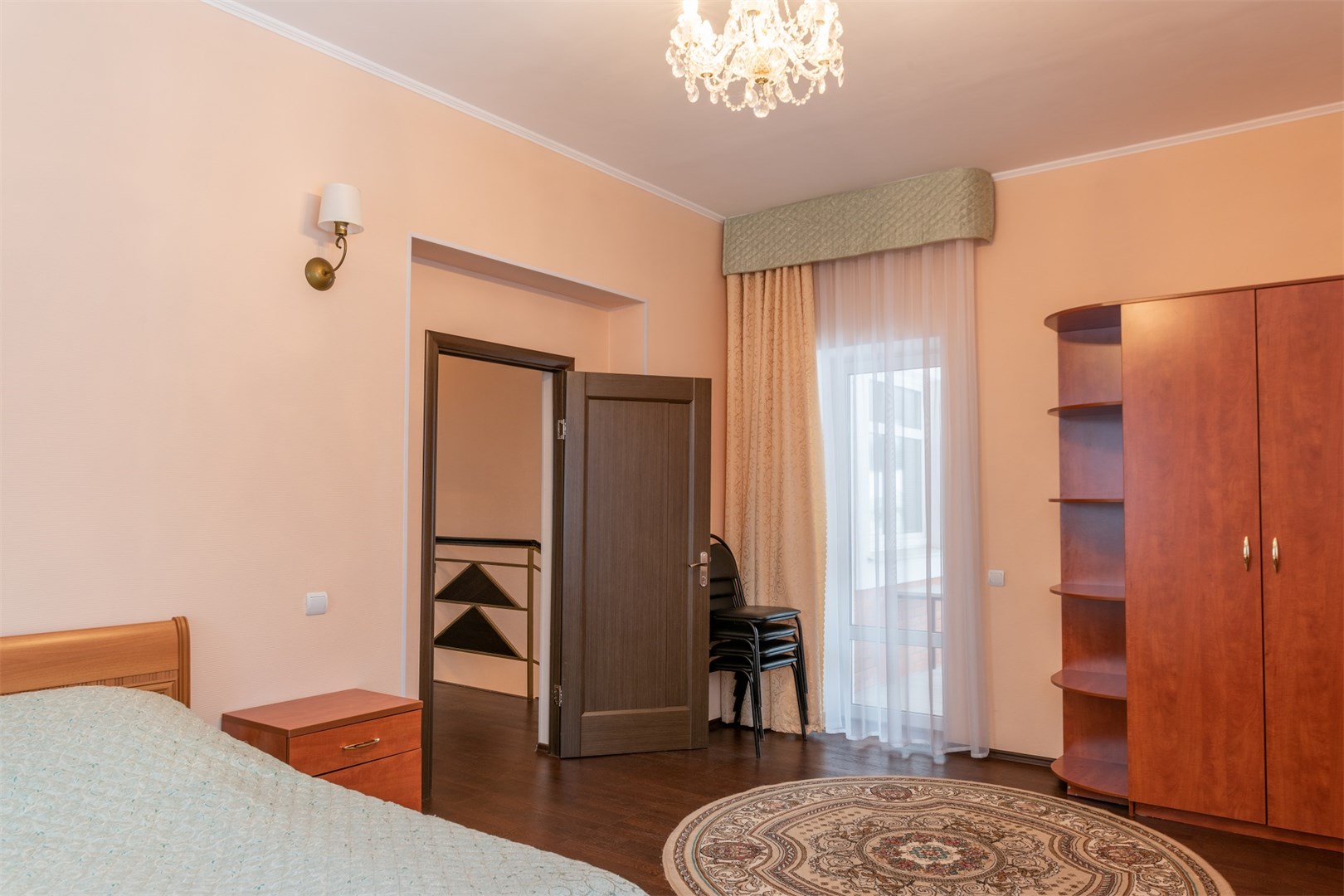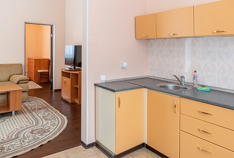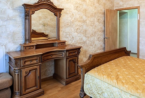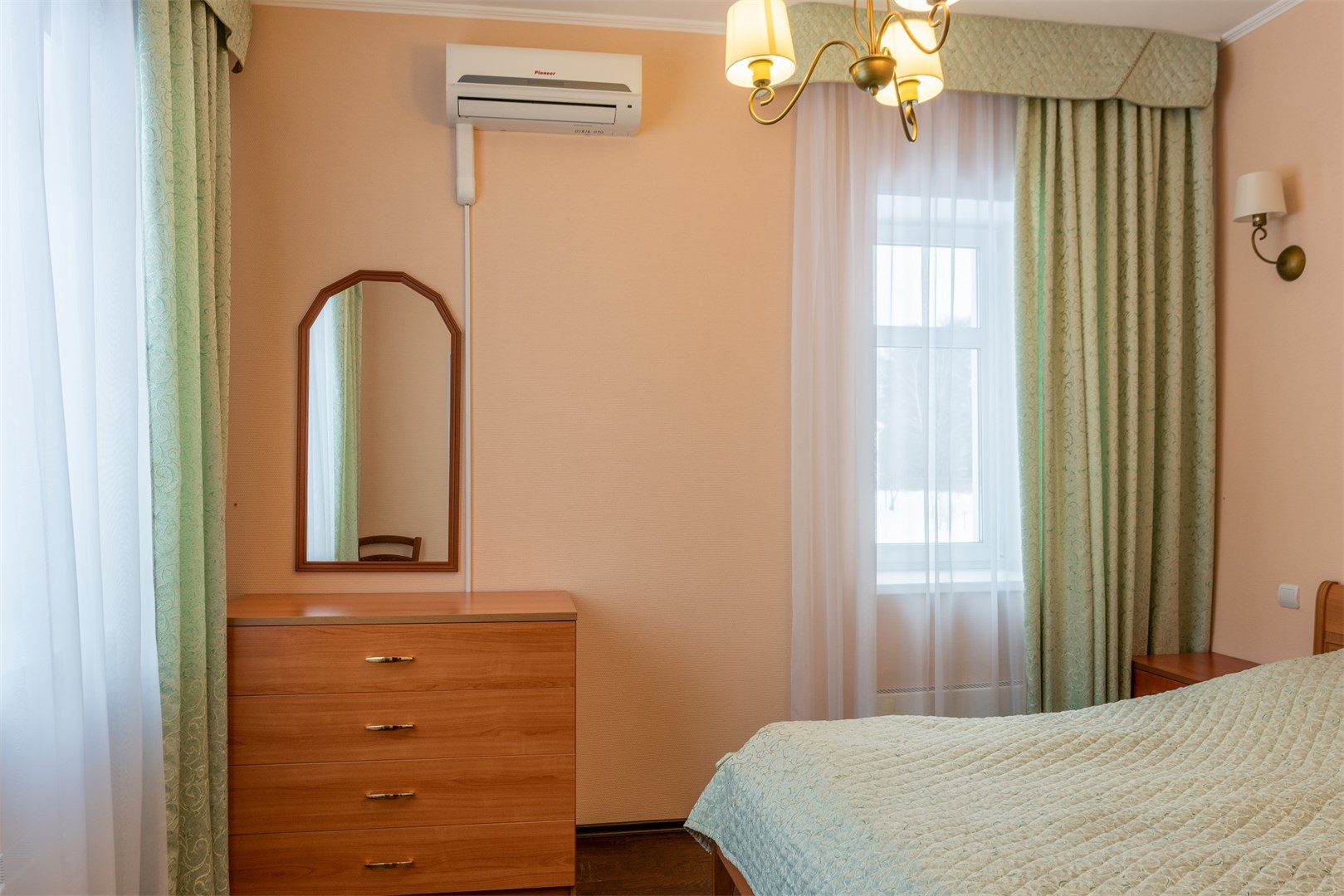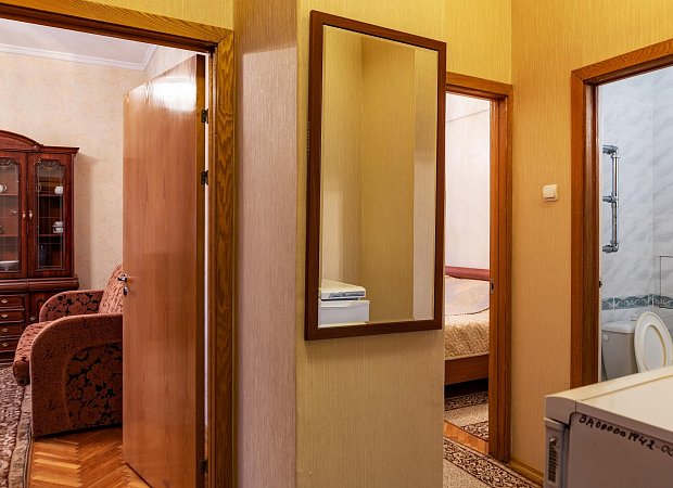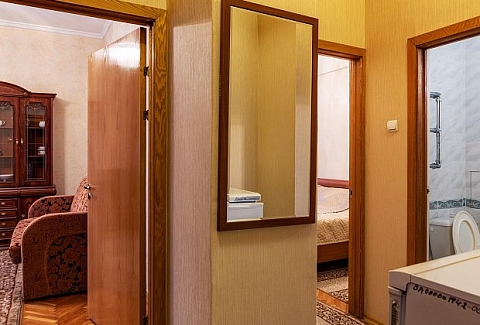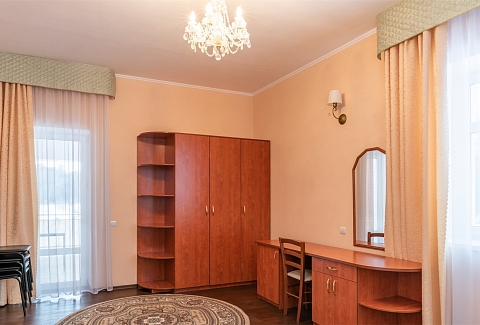 В номере: диван, зеркало, комод, кресла, кровати односпальные, кровать двуспальная, кухонная мебель, прикроватные тумбочки, стол, стулья, тумба под телевизор, шкаф, мини-холодильник, набор посуды, телевизор, телефон, электрочайник