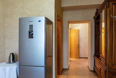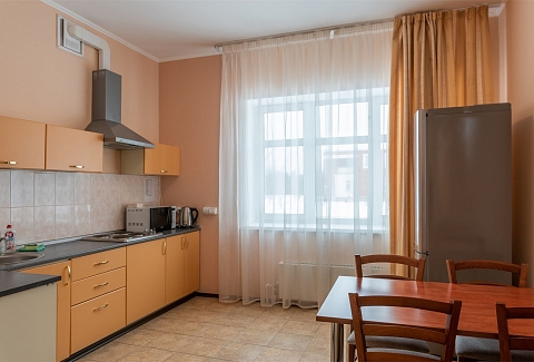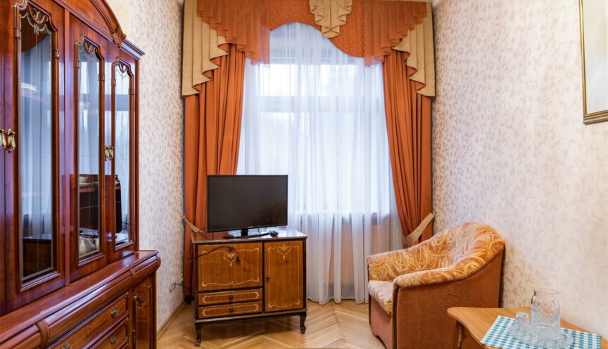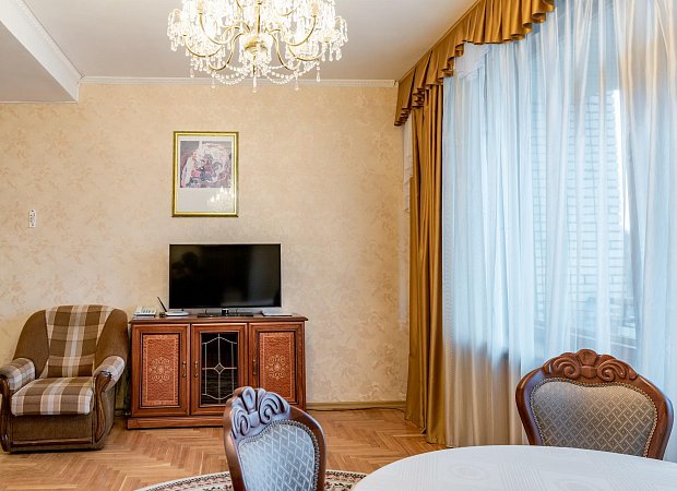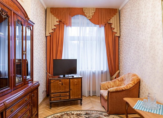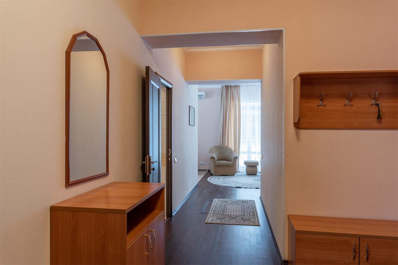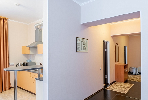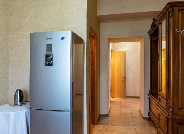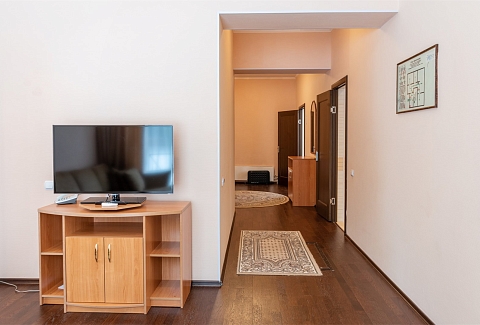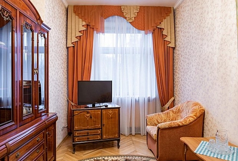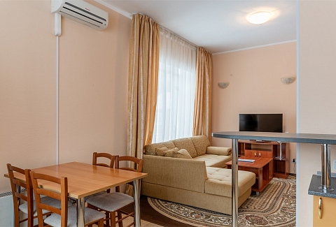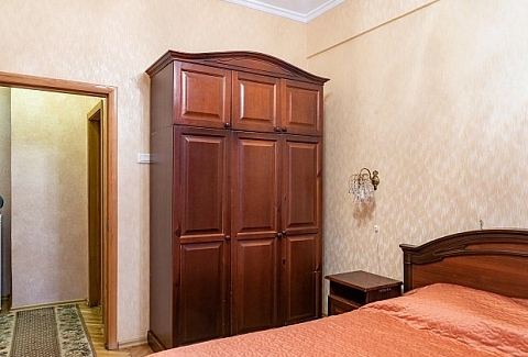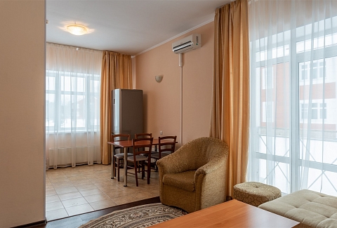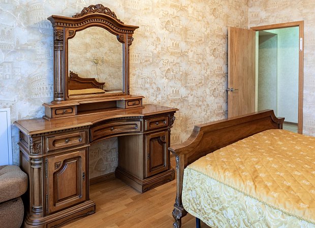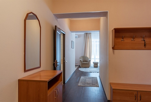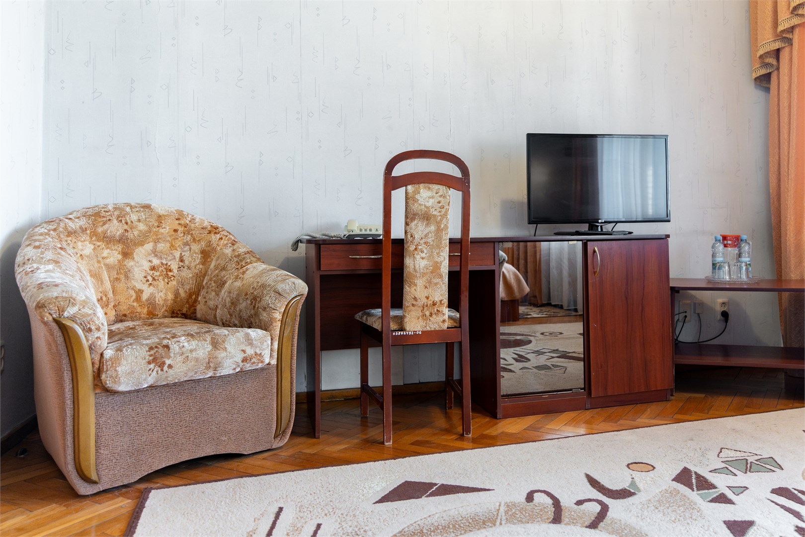 В номере: диван, зеркало, комод, кресла, кровати односпальные, кровать двуспальная, кухонная мебель, прикроватные тумбочки, стол, стулья, тумба под телевизор, шкаф, мини-холодильник, набор посуды, телевизор, телефон, электрочайник