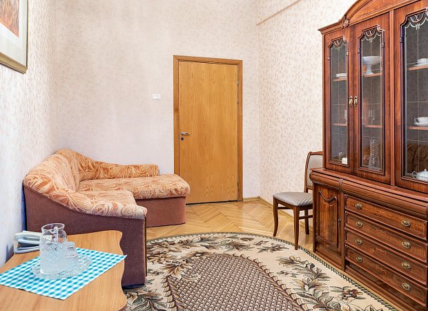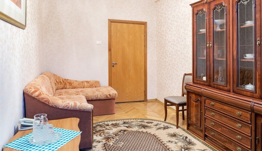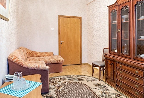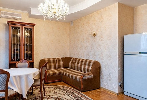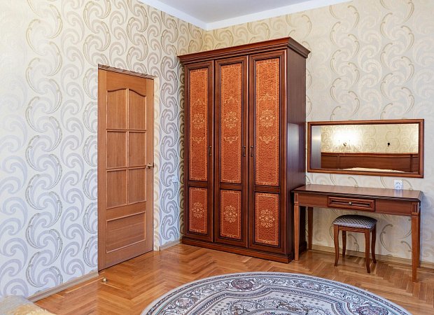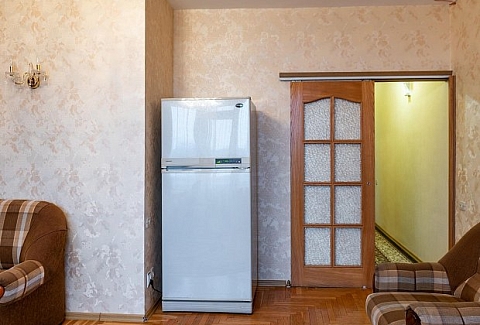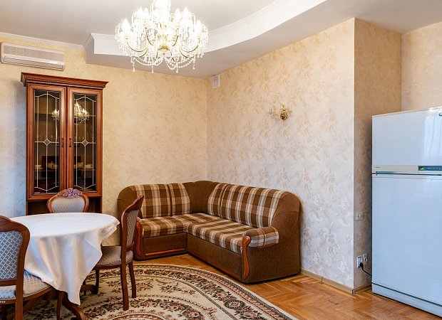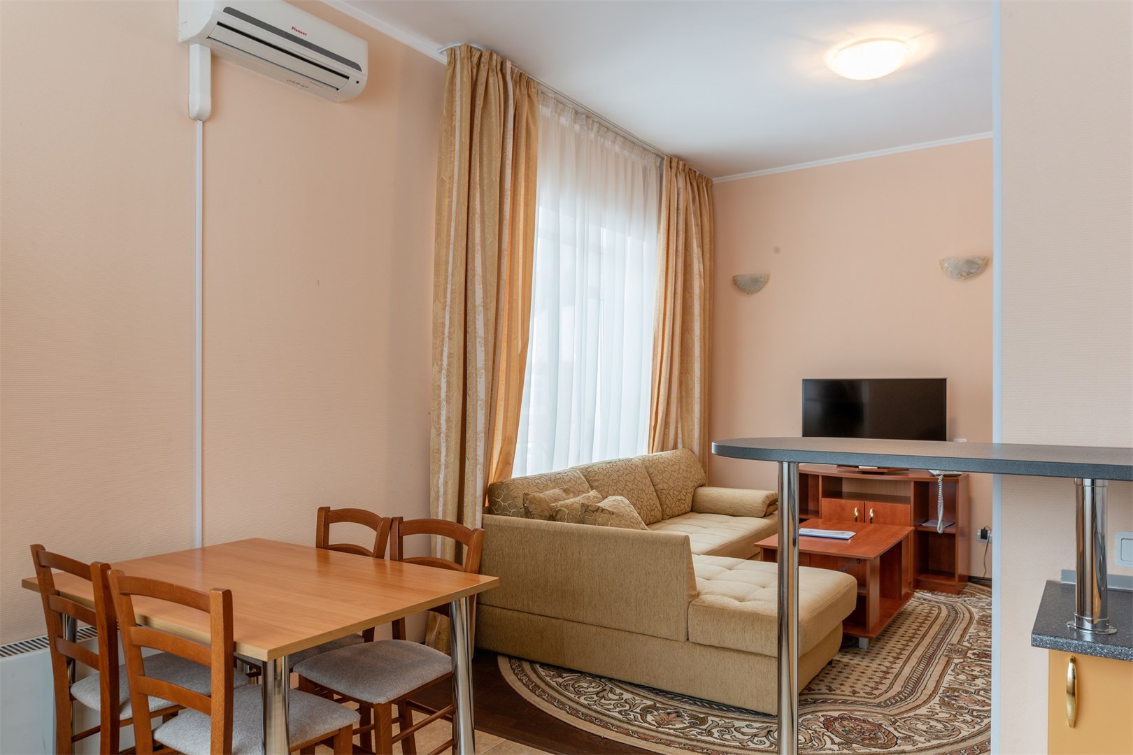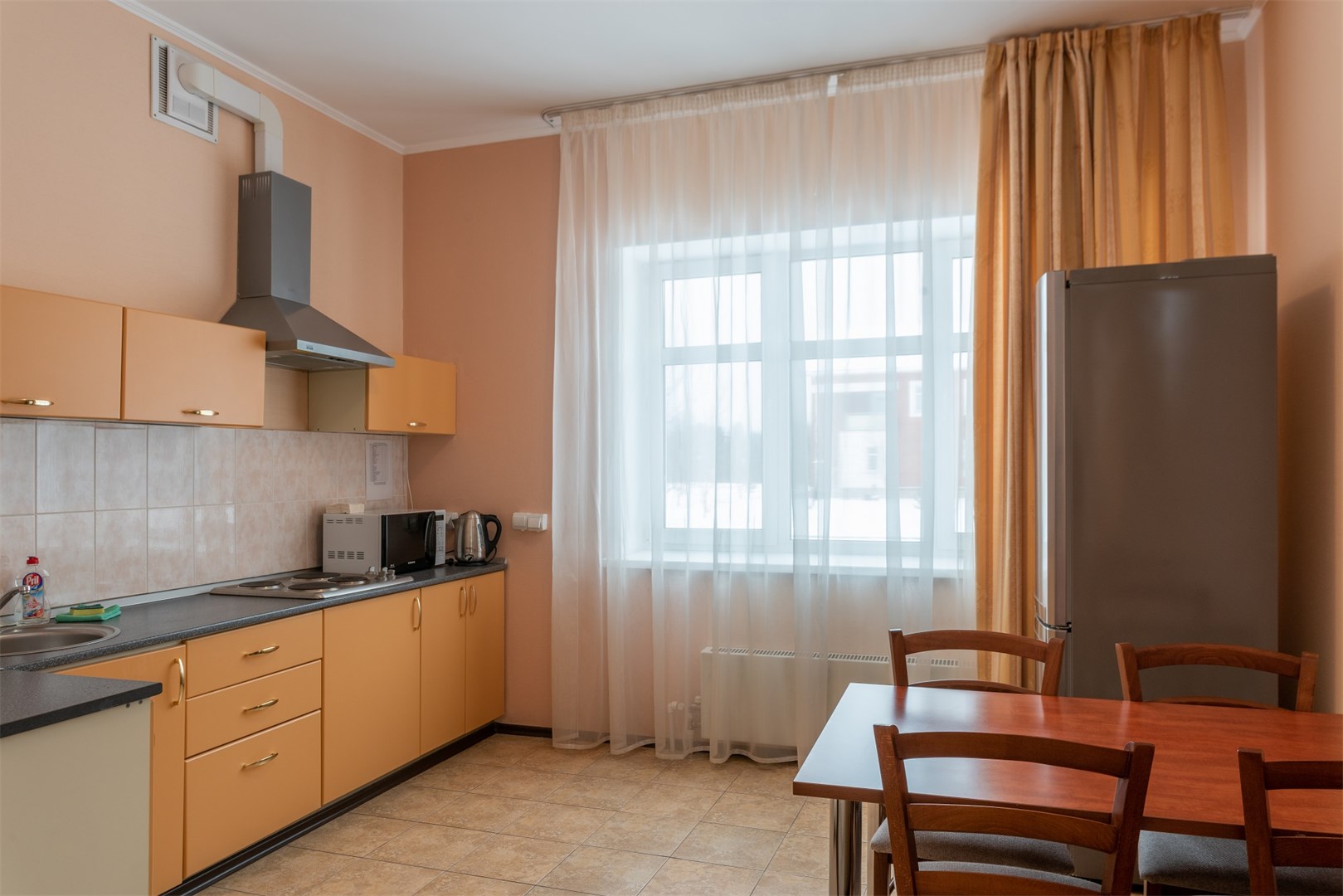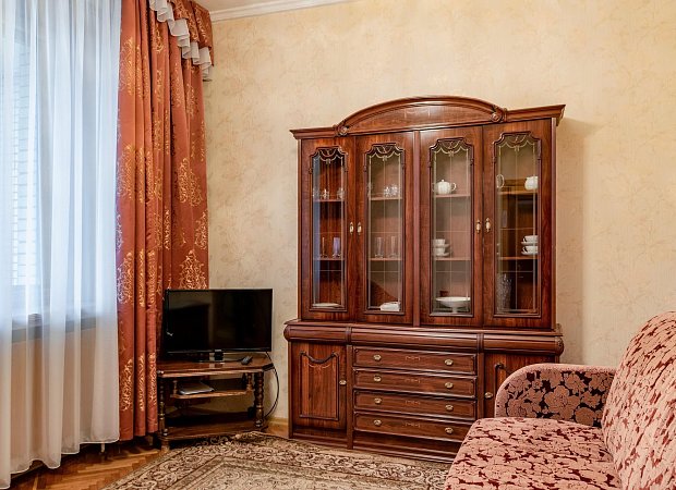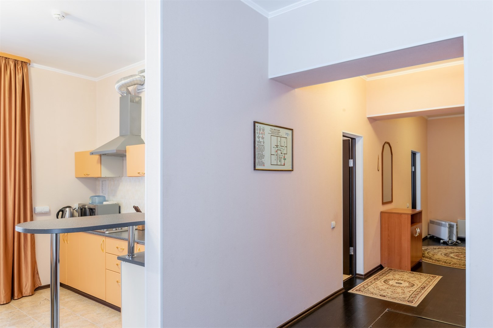 В номере: диван, зеркало, комод, кресла, кровати односпальные, кровать двуспальная, кухонная мебель, прикроватные тумбочки, стол, стулья, тумба под телевизор, шкаф, мини-холодильник, набор посуды, телевизор, телефон, электрочайник