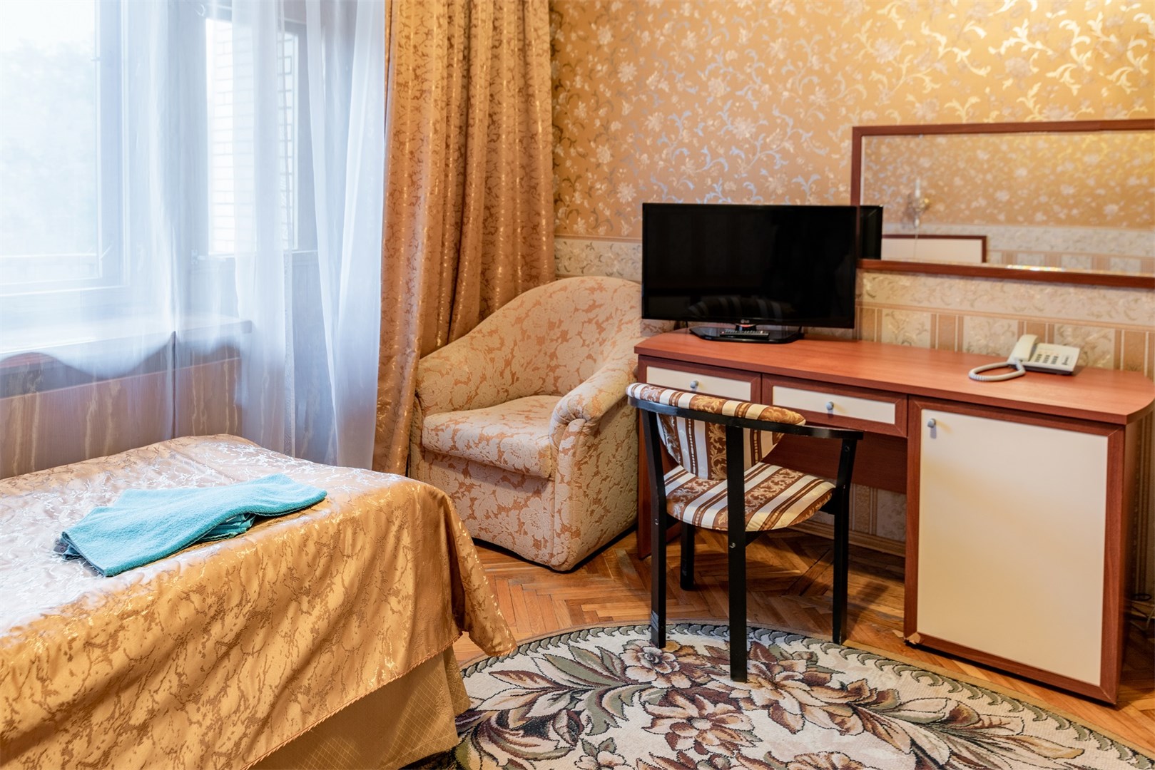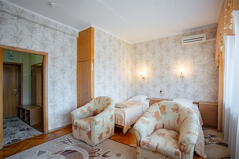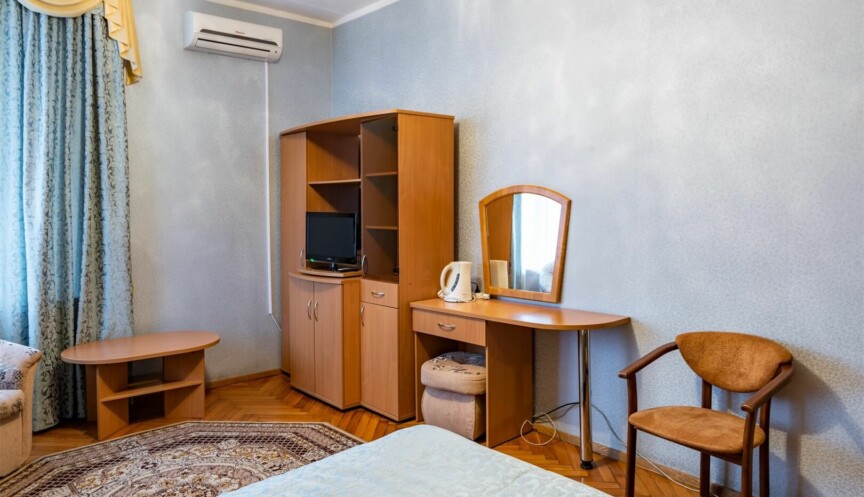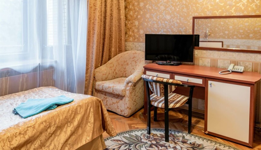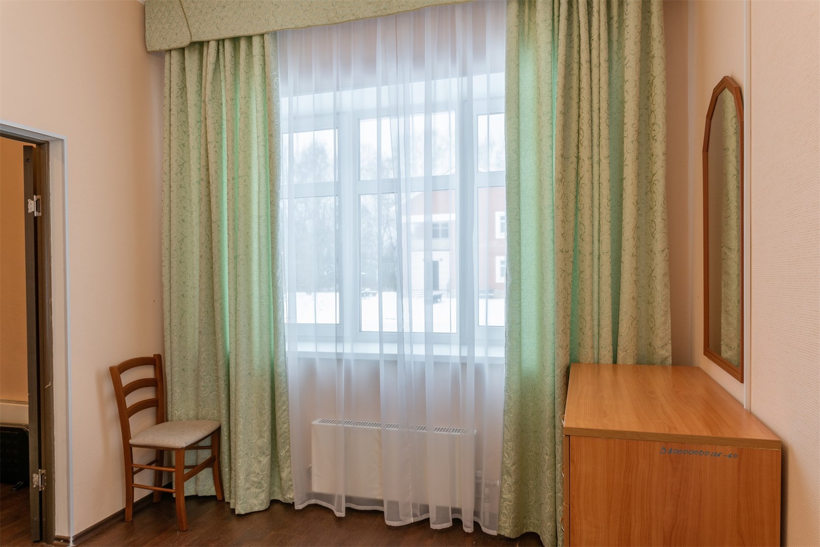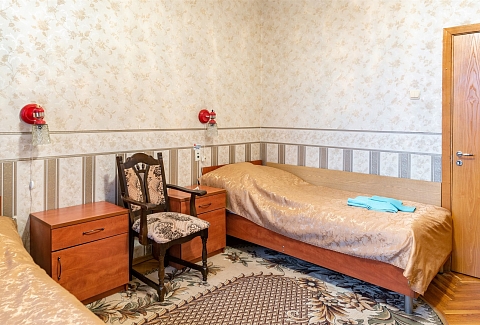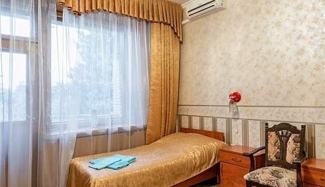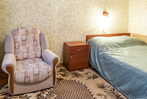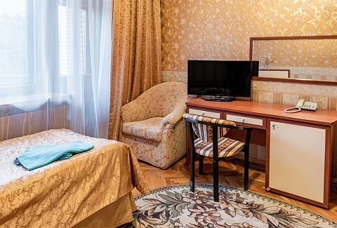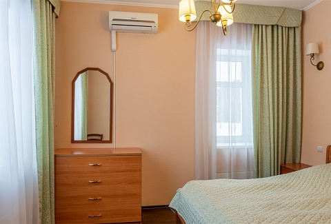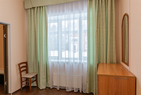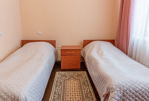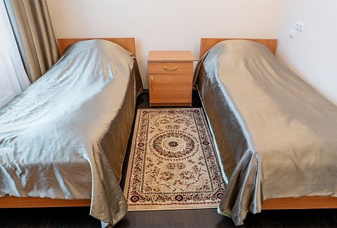 В номере: зеркало, кровати односпальные, прикроватные тумбочки, стол, стул, шкаф, мини-холодильник, набор посуды, телевизор, телефон, электрочайник