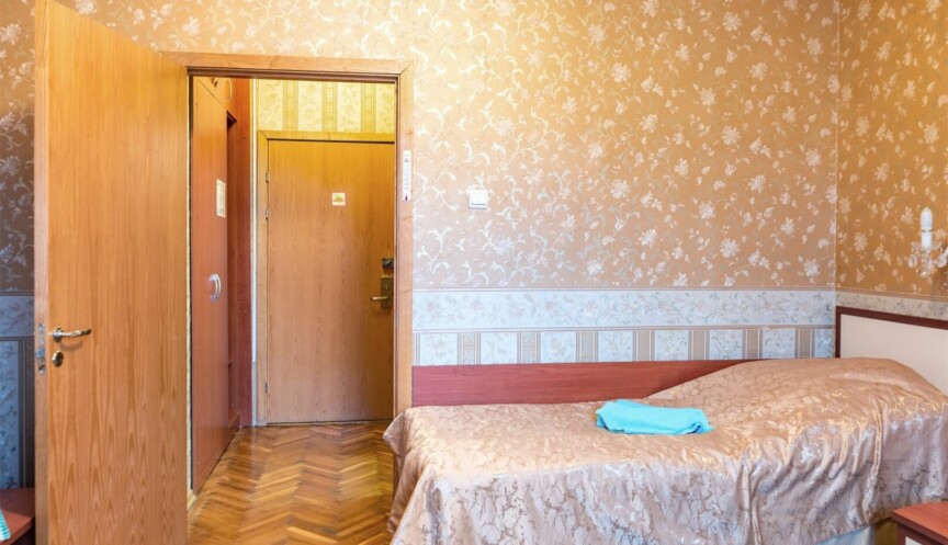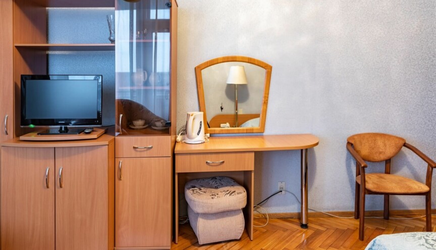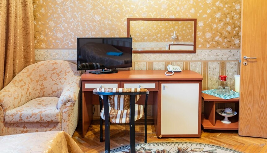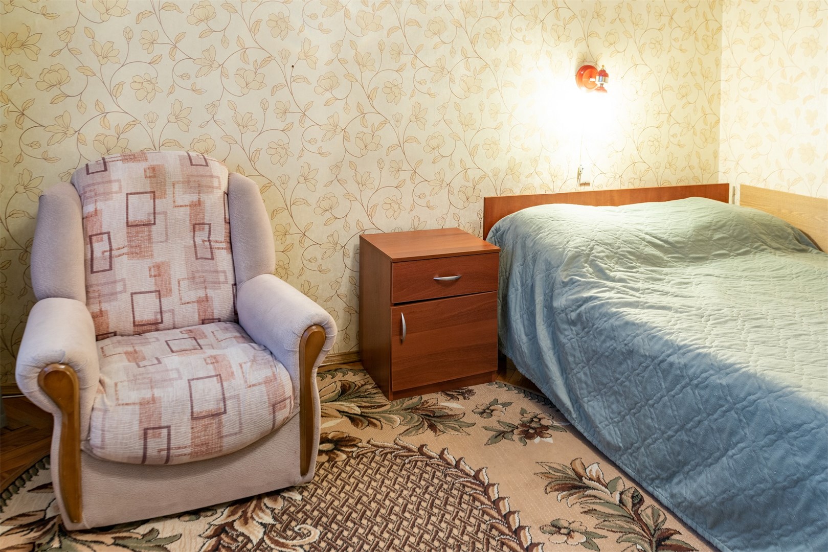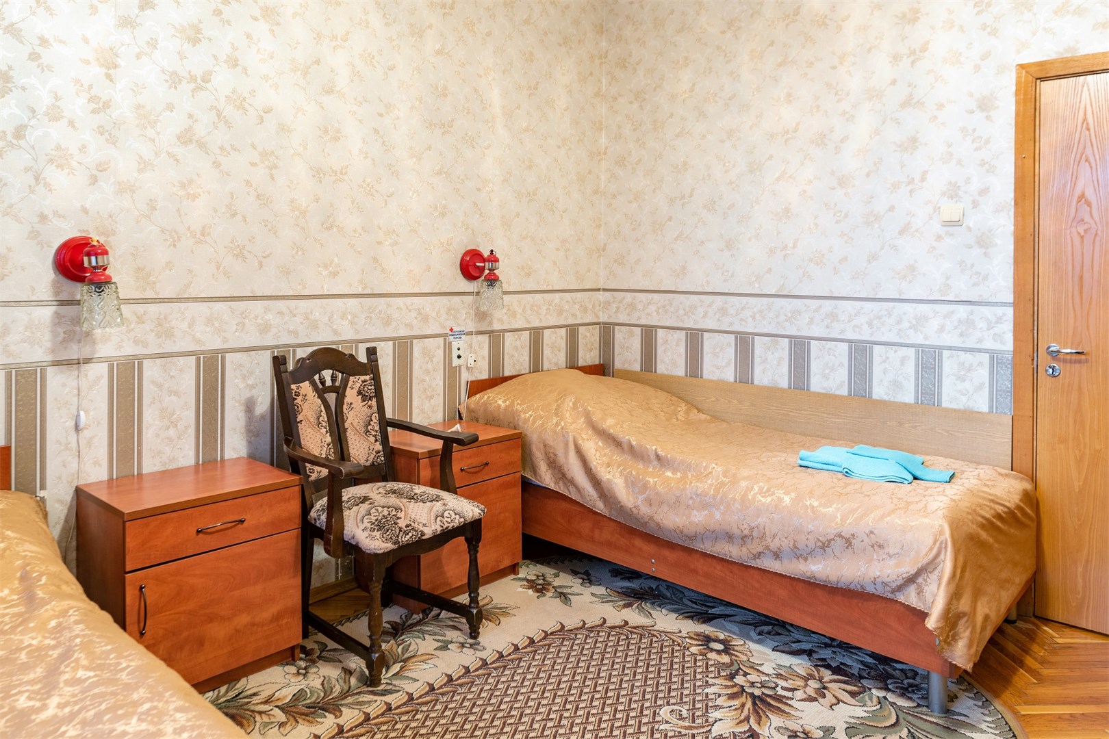 В номере: зеркало, кровати односпальные, прикроватные тумбочки, стол, стул, шкаф, мини-холодильник, набор посуды, телевизор, телефон, электрочайник