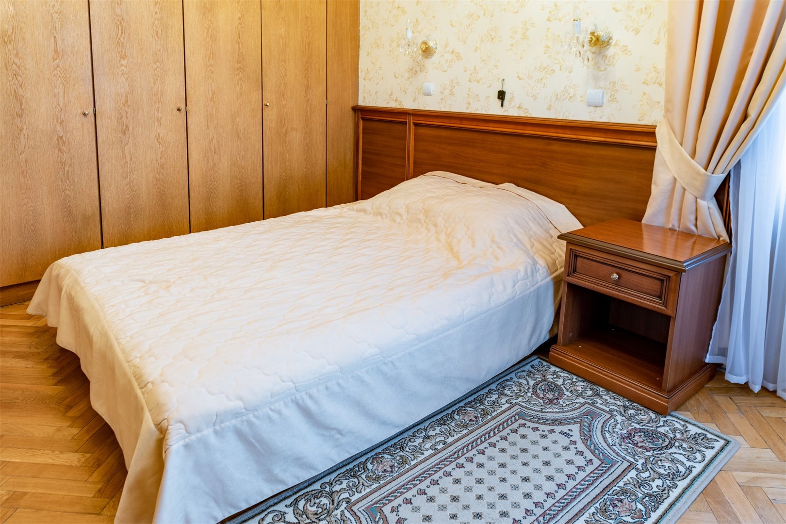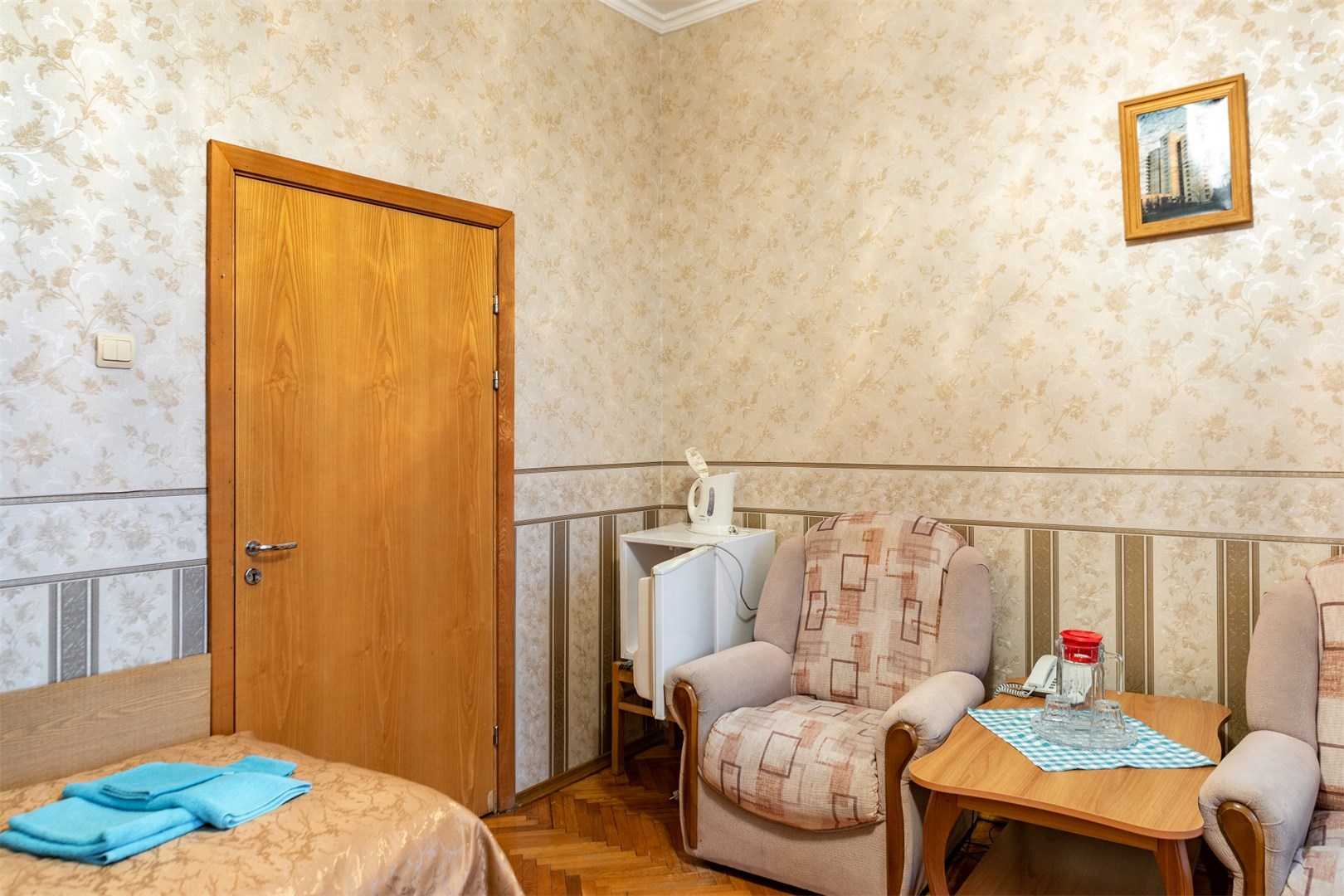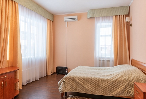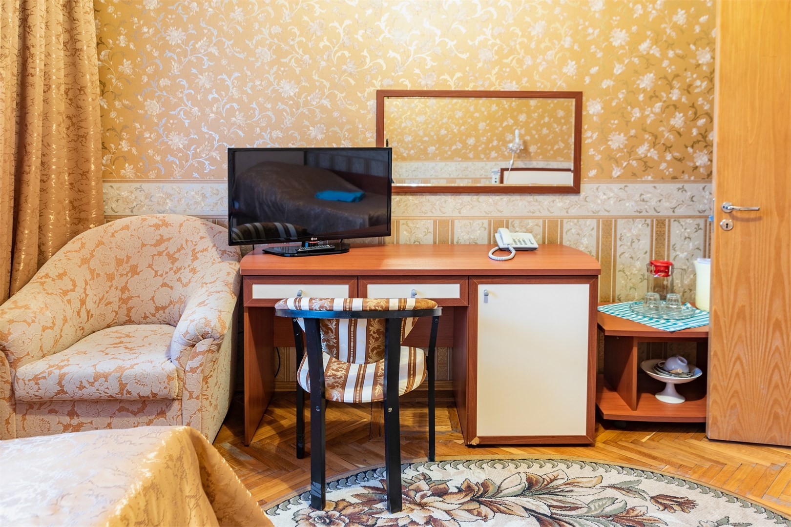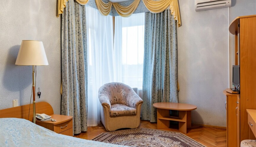 В номере: зеркало, кровати односпальные, прикроватные тумбочки, стол, стул, шкаф, мини-холодильник, набор посуды, телевизор, телефон, электрочайник