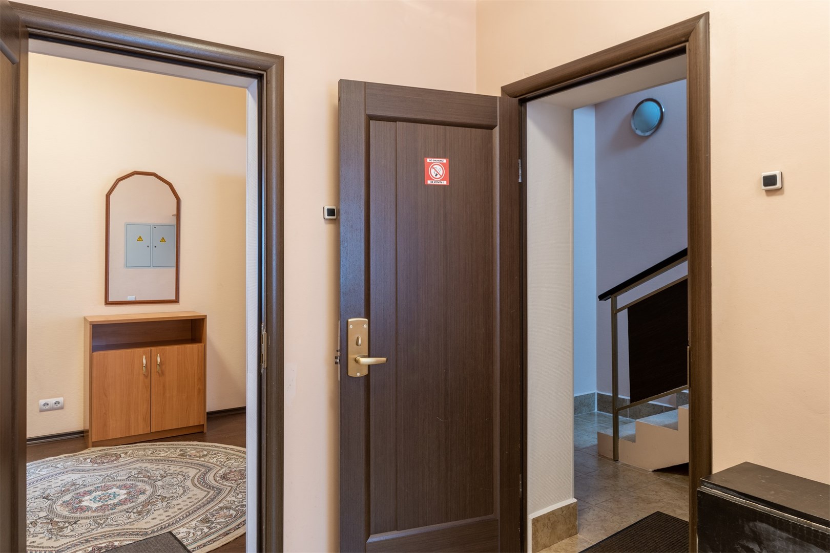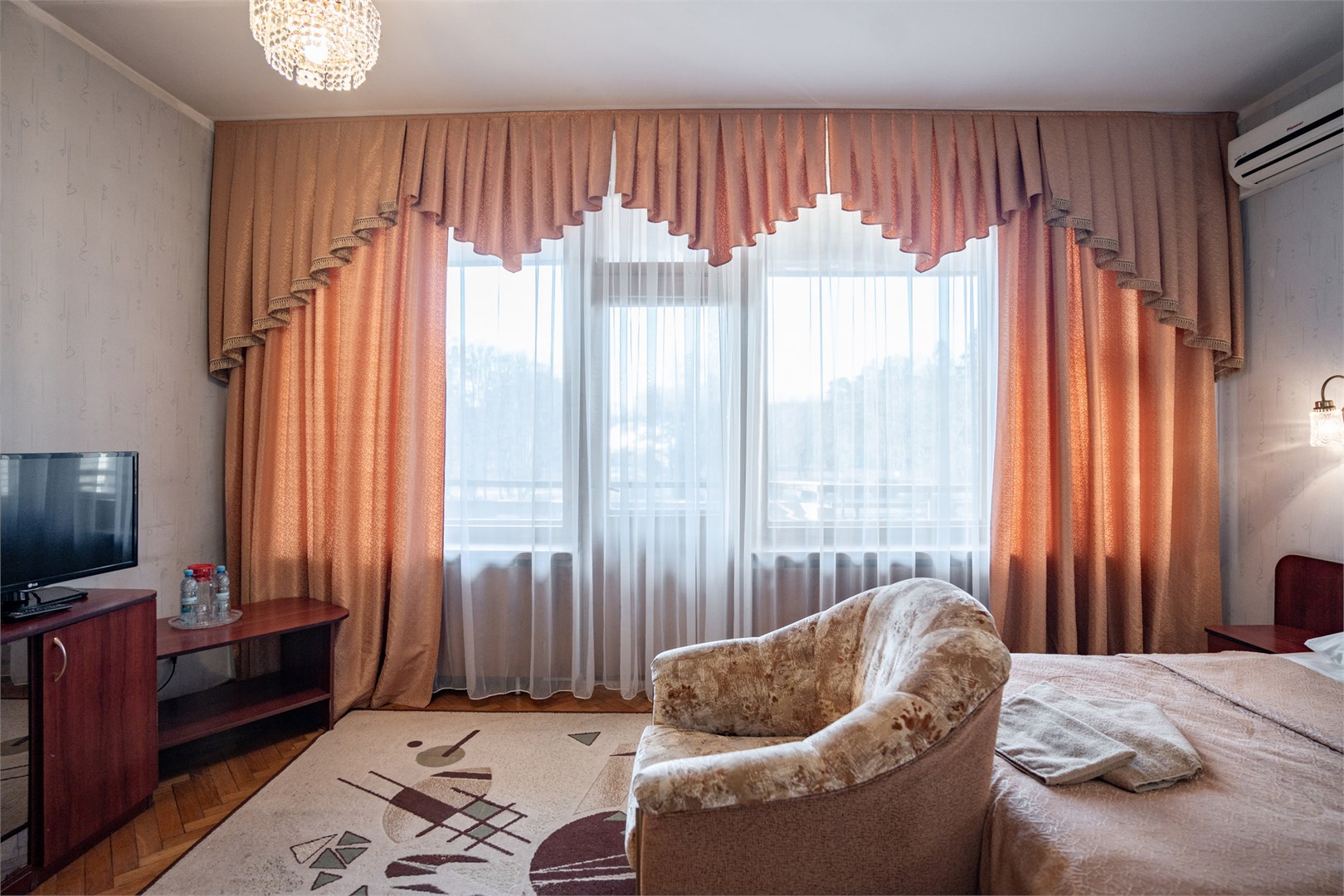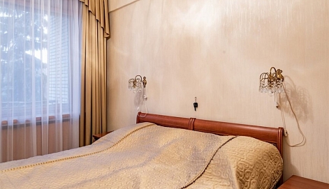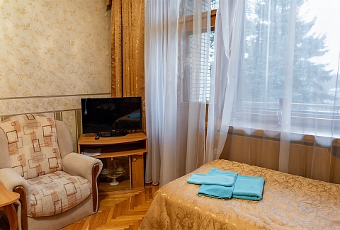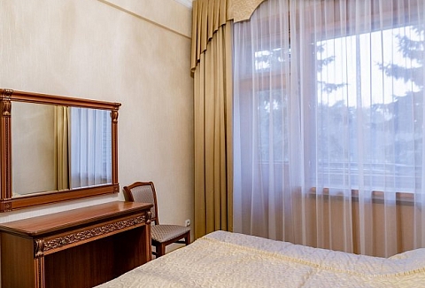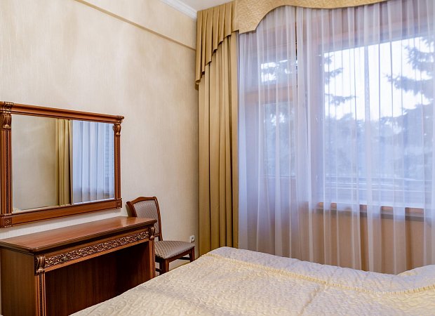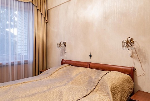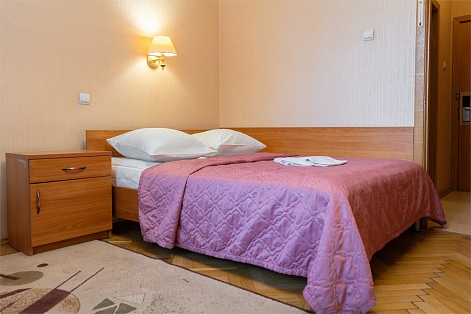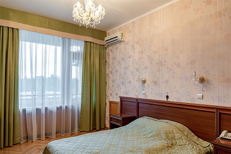 Каждый может ощутить себя комфортно, погрузившись в природу и ароматы леса. Учитывая то, что, помимо качественного обслуживания, предоставляется лечебно-диагностическая база, которая творит чудеса лечения в санатории.Само здание состоит из четырех корпусов. Первый корпус является главным, состоит из четырнадцати этажей и оборудован двумя лифтами. Второй корпус спальный, в нем четыре этажа и в наличии только один лифт. Оба этих корпуса имеют соединение с лечебным центром, а также столовой, спортивным комплексом и бассейном. Третий комплекс стоит отдельно, почти в пятистах метрах от основного корпуса, в нем три спальных этажа, лифта нет. Четвертый корпус является коттеджным поселком. Каждый из двухэтажных коттеджей, находящийся там, состоит из трехкомнатных номеров. Санаторий занимает довольно обширную площадь, причем за этой территорией тщательно следят, чтобы она была ухожена и благоустроена по всем правилам. Примечательным является то, что на территории санатория находятся два озера, на которых есть причалы для лодок. Вокруг располагается лес и парковая зона, в которой установлено несколько уютных беседок.Заселяясь в отель, можно рассчитывать не только на номер выбранной категории, но и на трехразовое питание, на посещение бассейна по одному сеансу за день, исключение составляют санитарные дни. Отлично можно провести время в тренажерном зале, опять же один сеанс каждый день. Лечебная гимнастика в воде даст вам почувствовать прилив сил и бодрости. А за дополнительную оплату можно превосходно провести свободное время в джакузи или солярии. Для любителей подвижного отдыха есть настольный теннис, просторный каток, лыжная база, даже можете брать напрокат спортивный инвентарь. Есть даже два качественно обустроенных теннисных корта для каждого желающего. Тот, кто приезжает на собственной машине, может воспользоваться охраняемой автостоянкой за разумную цену. Можно хорошо отдохнуть на пляже, который находится в трехстах метрах от основного корпуса, понежиться под лучами солнца.