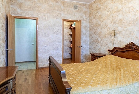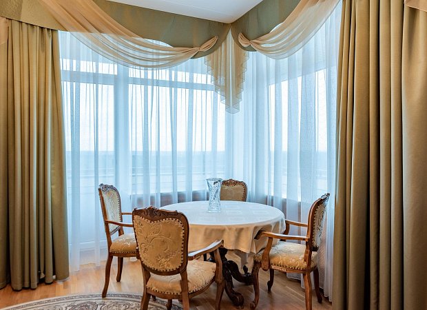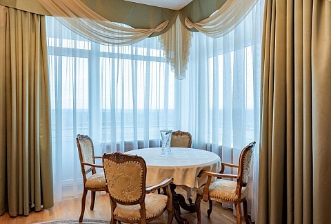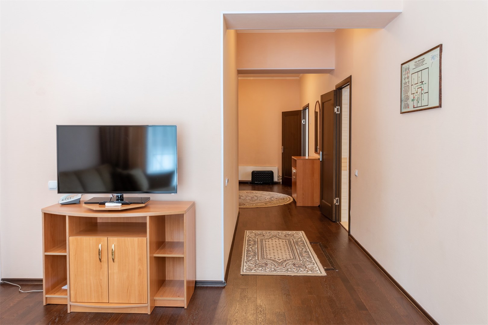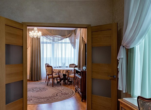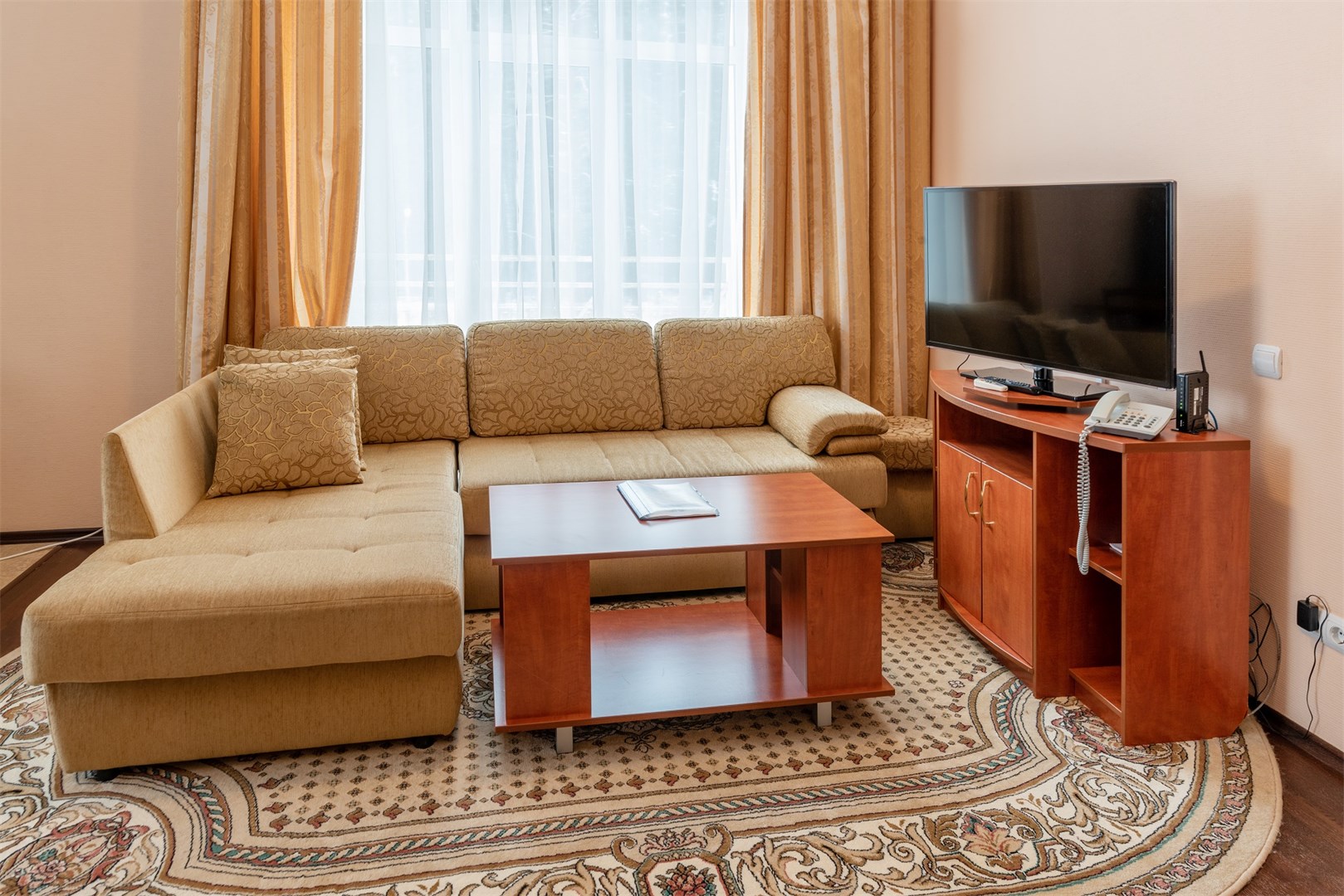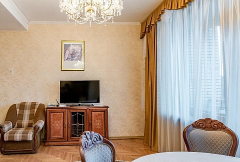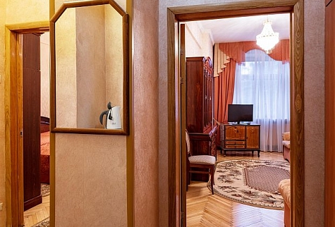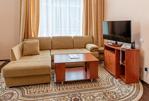 В номере: вешалка, гардеробная, зеркало, кровать двуспальная, набор мягкой мебели, прикроватные тумбочки, стол, столик журнальный, столик туалетный, стулья, шкаф, набор посуды, сейф, телевизор, телефон, холодильник, чайный набор посуды, электрочайник
