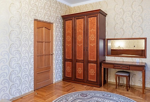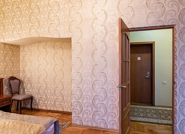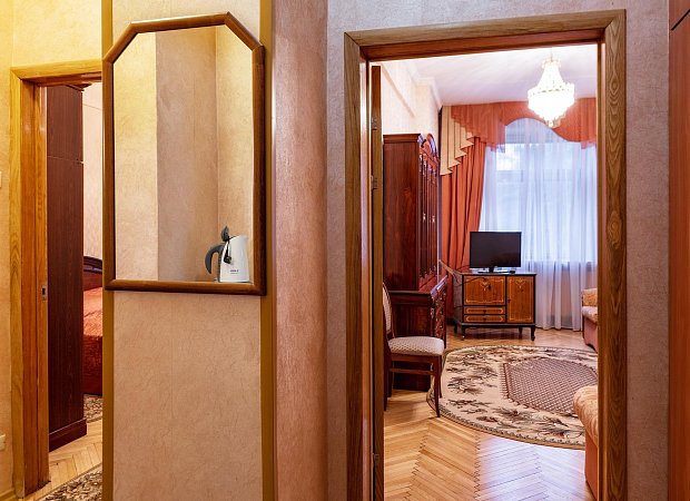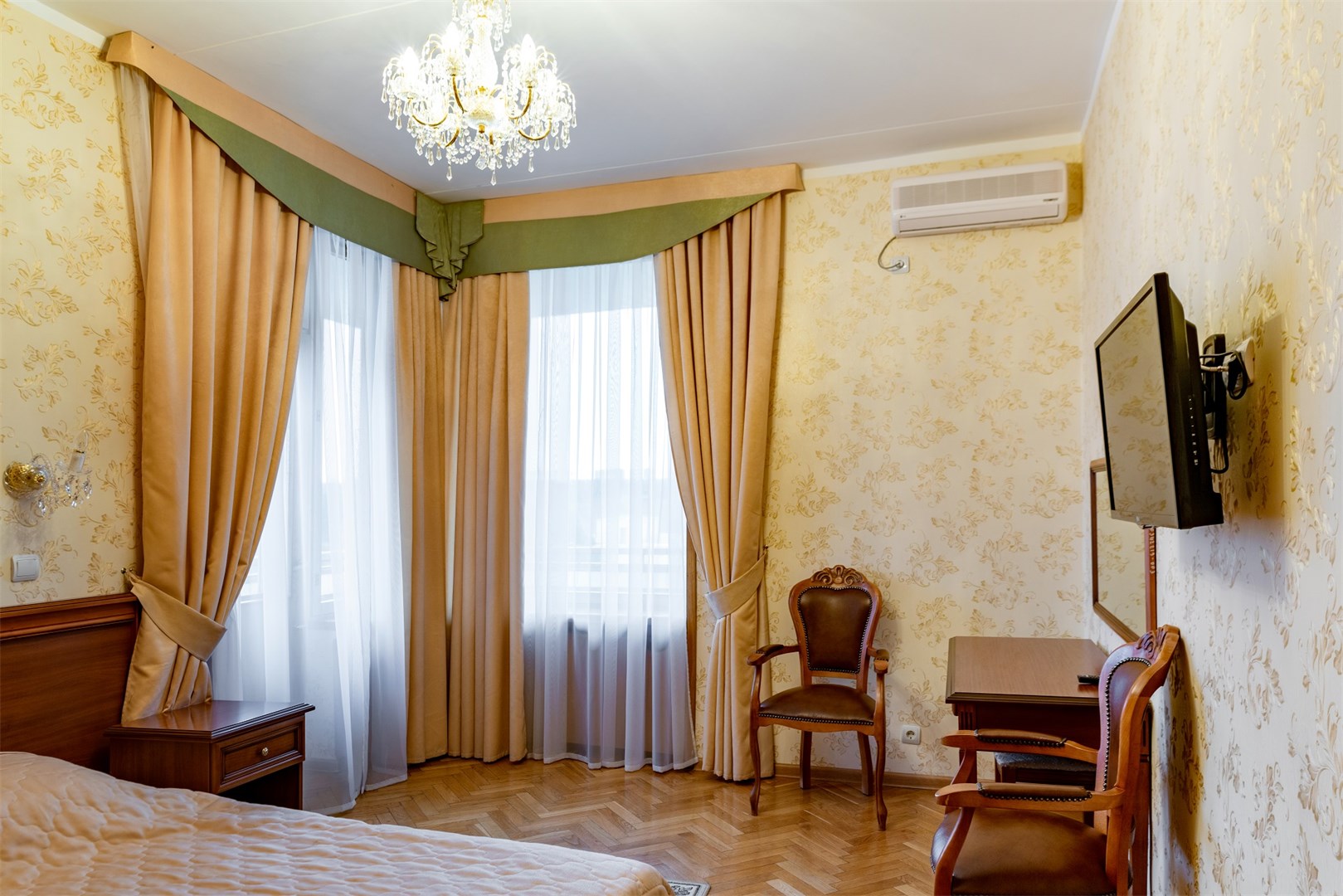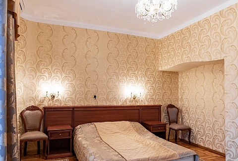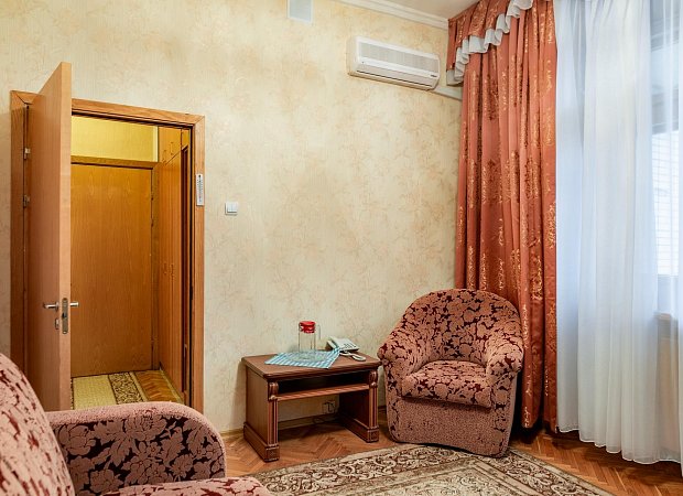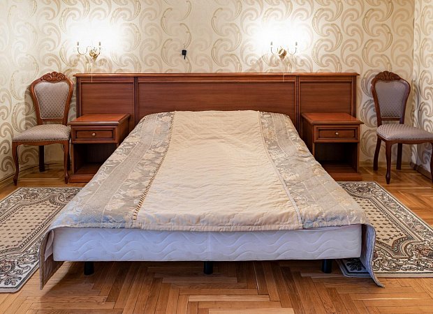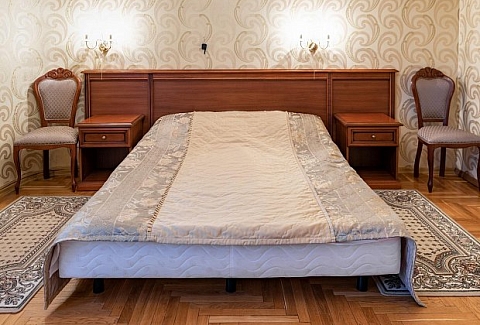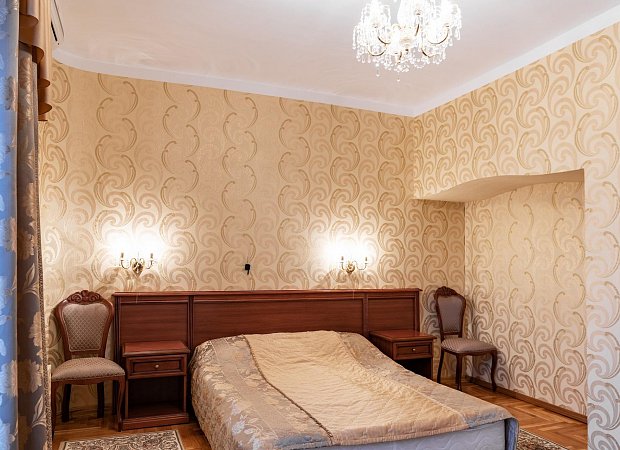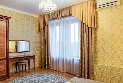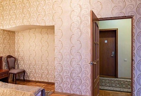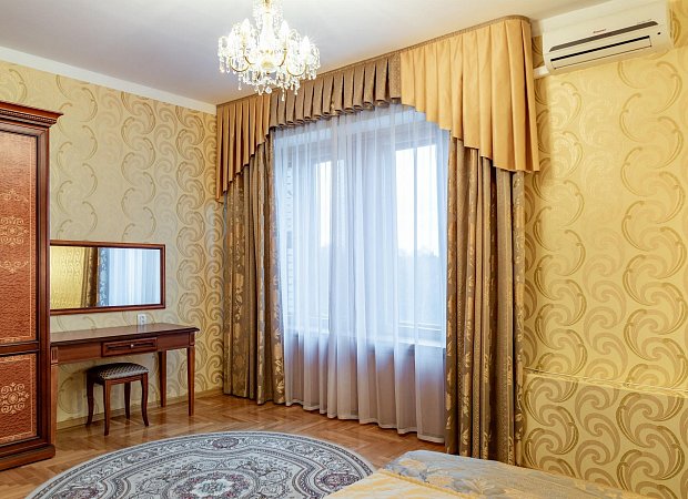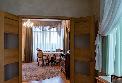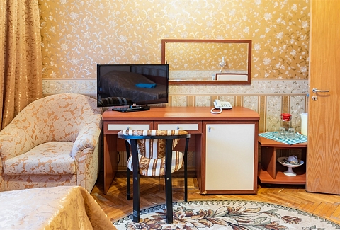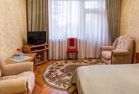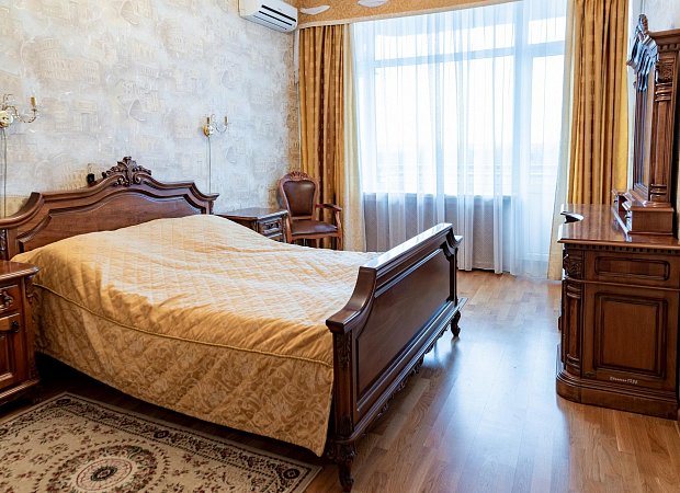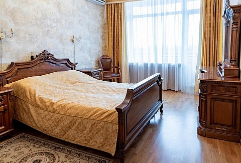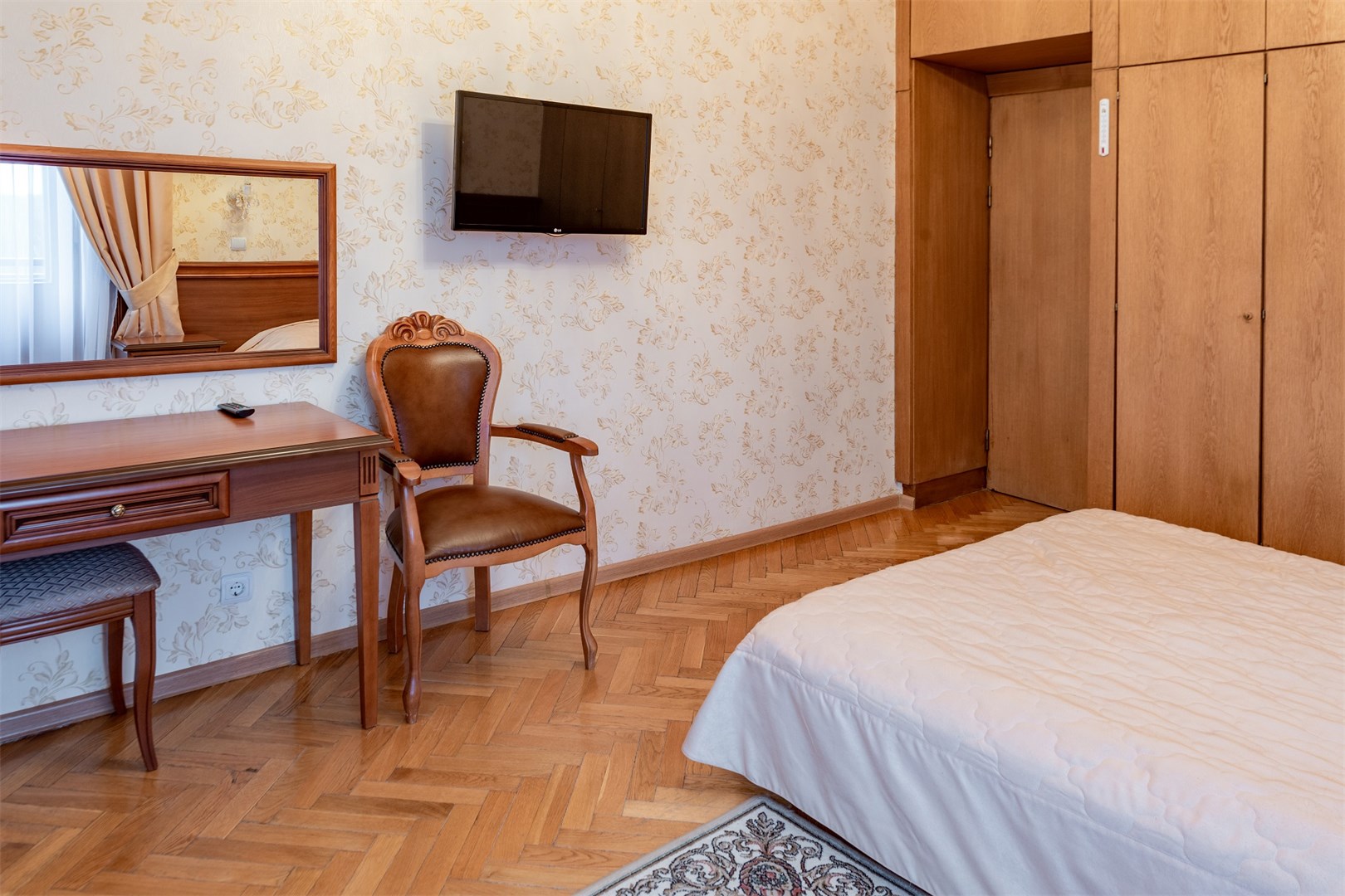 В номере: вешалка, гардеробная, зеркало, кровать двуспальная, набор мягкой мебели, стол, столик туалетный, стулья, шкаф, набор посуды, сейф, телевизор, телефон, холодильник, чайный набор посуды, электрочайник