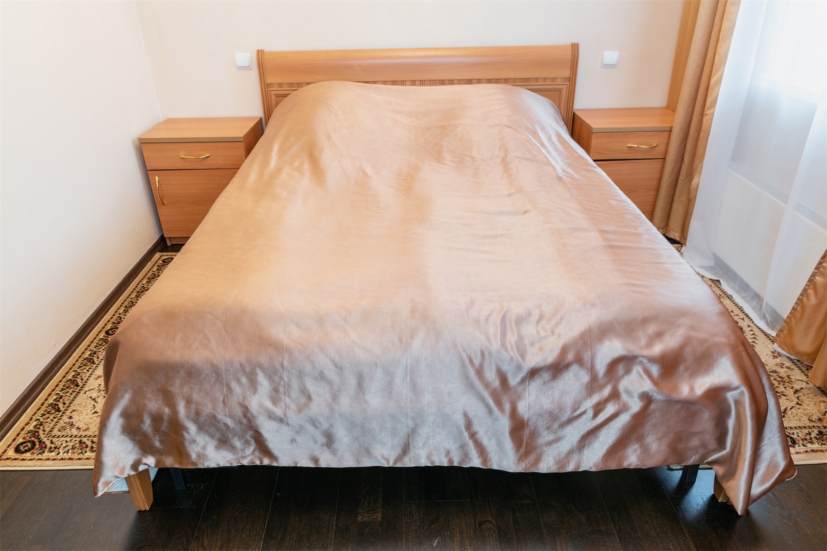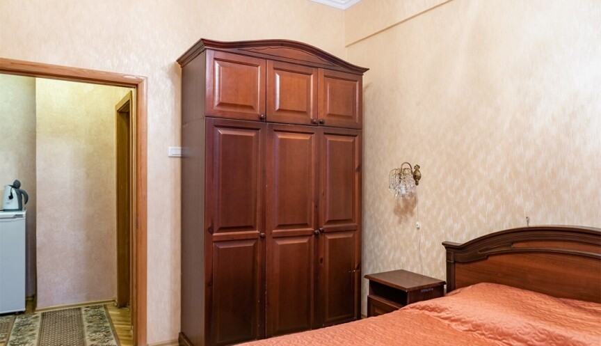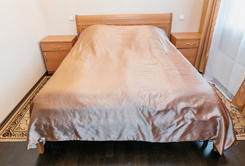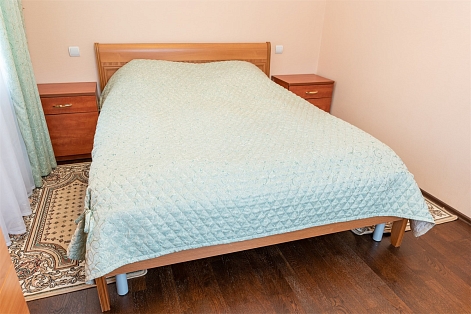 В номере: зеркало, кровать двуспальная, прикроватные тумбочки, столик туалетный, шкаф встроенный, мини-холодильник, набор посуды, телевизор, телефон
