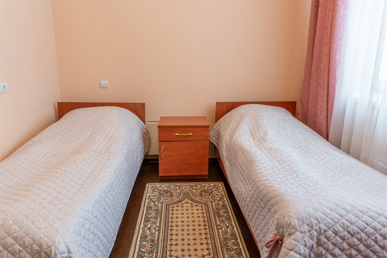 В номере: зеркало, кровати односпальные, прикроватные тумбочки, стол, стул, шкаф, мини-холодильник, набор посуды, телевизор, телефон