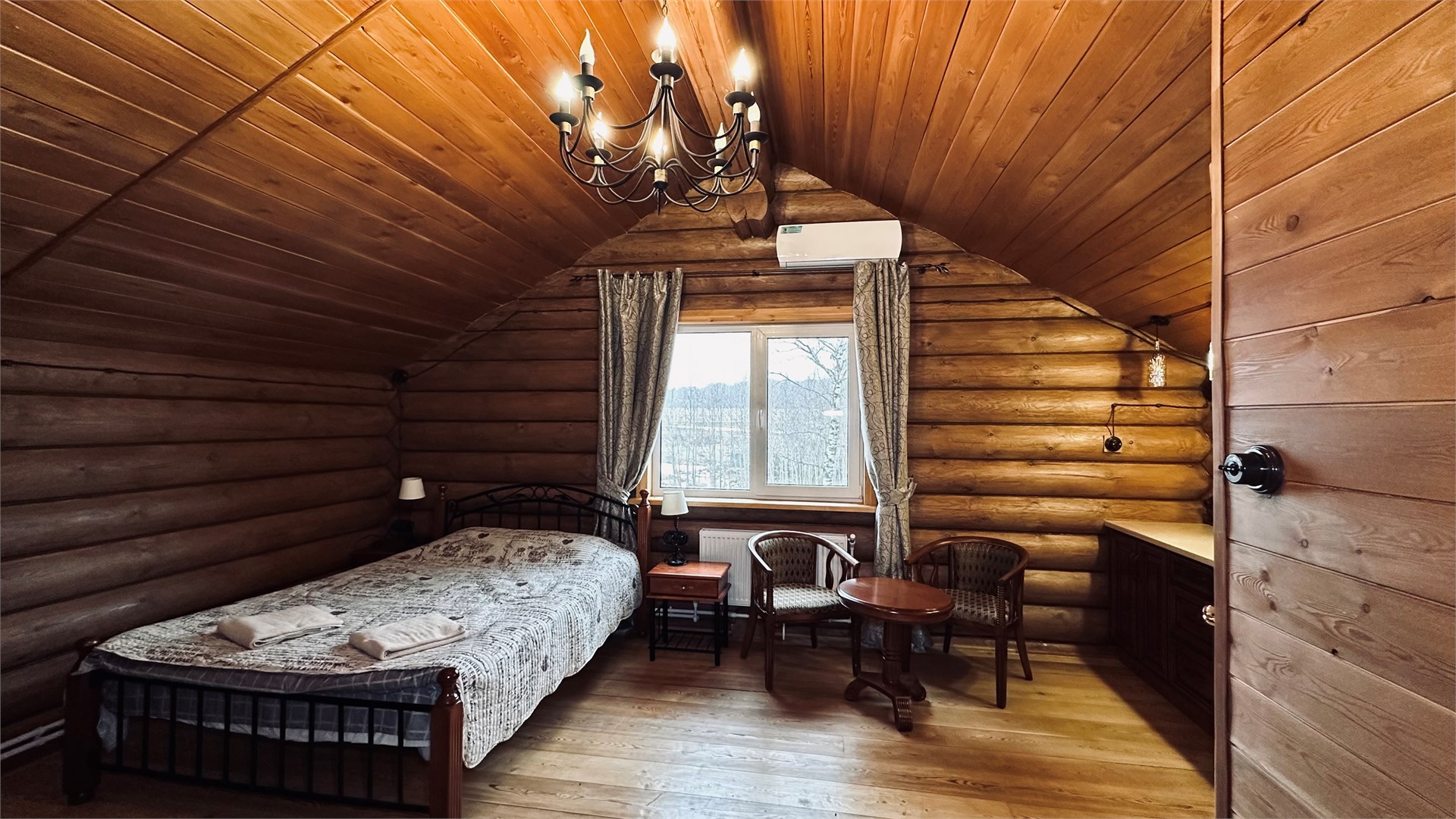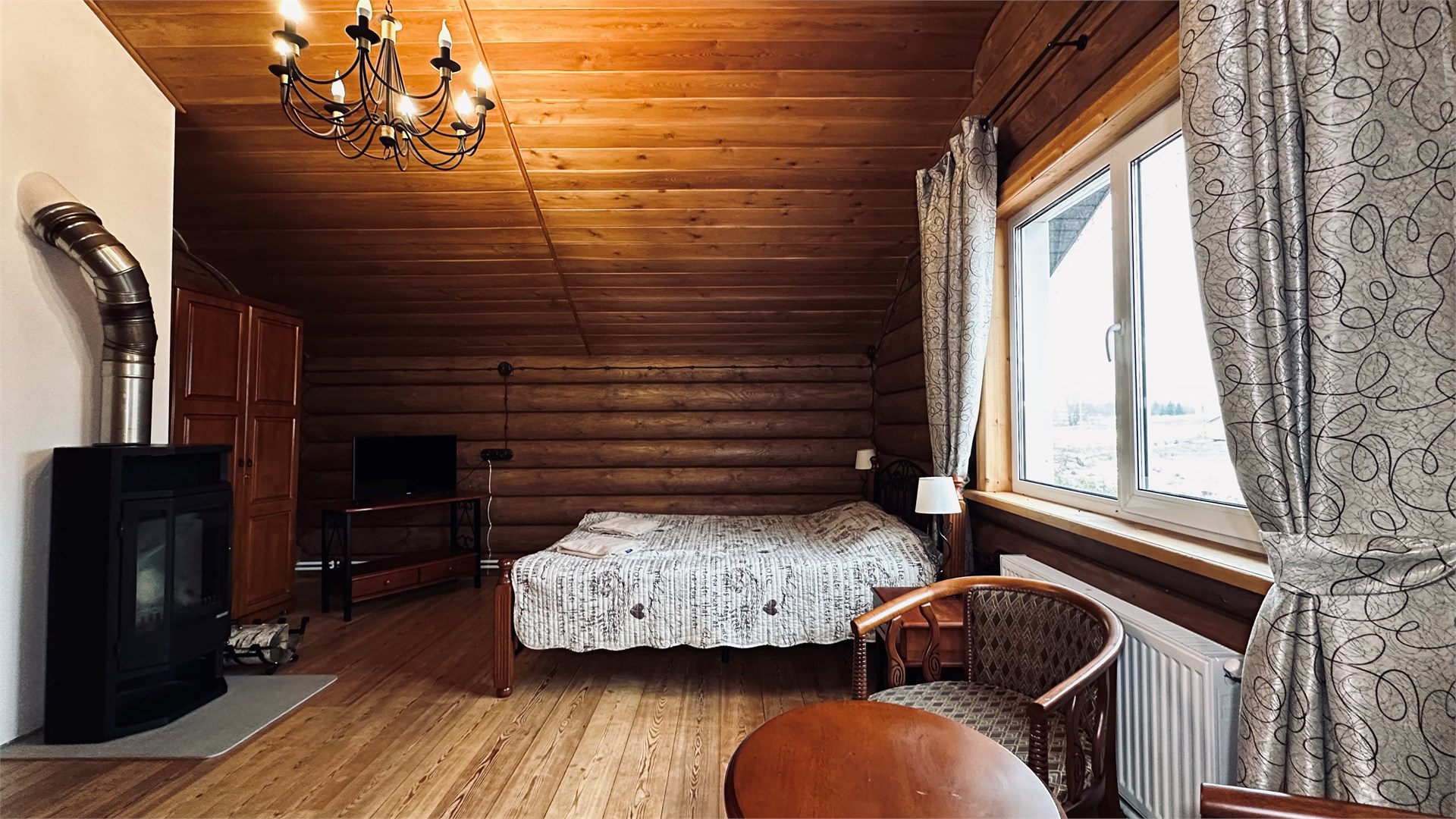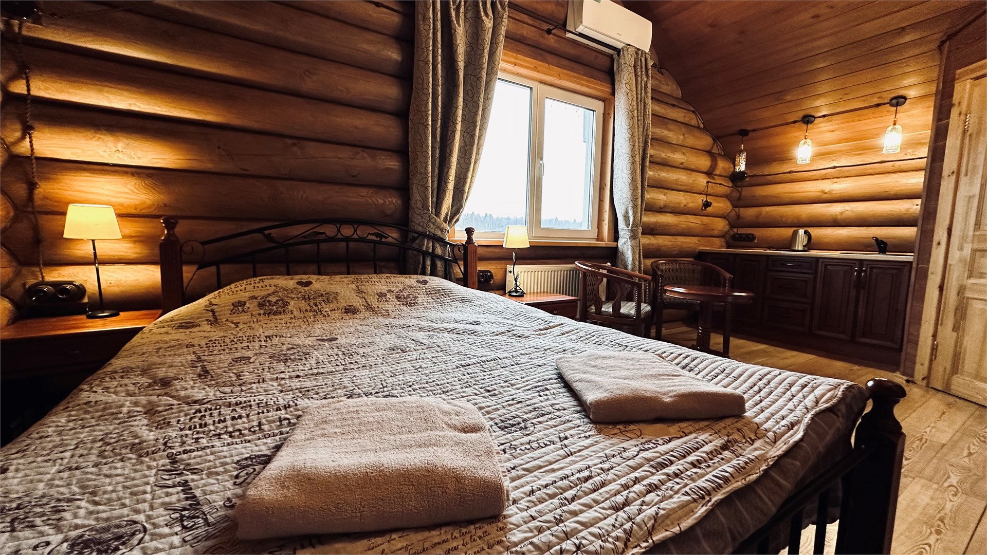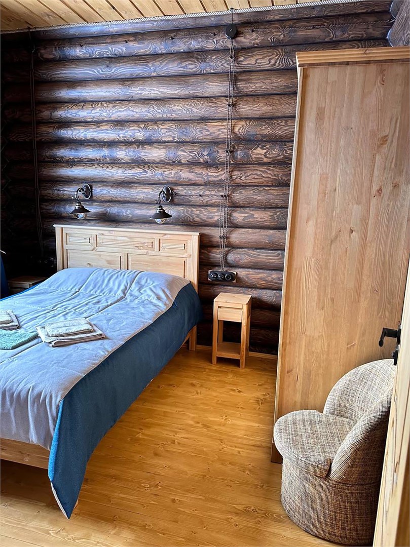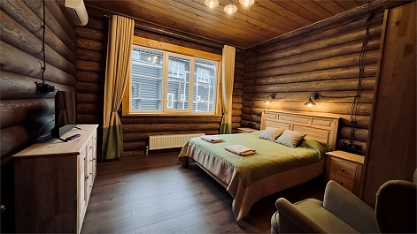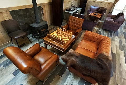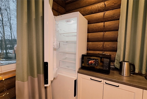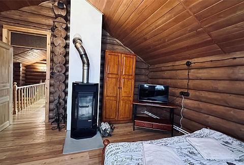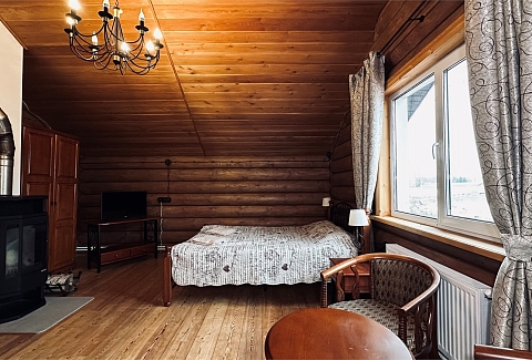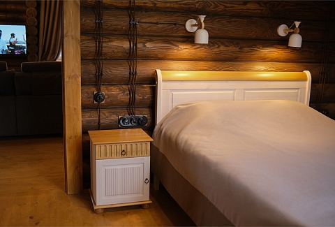 В номере: диван, зеркало, кровать двуспальная, прикроватные тумбочки, стол, стулья, шкаф, камин, микроволновая печь, набор посуды, плита электрическая, телевизор ЖК, холодильник, чайный набор посуды, электрочайник