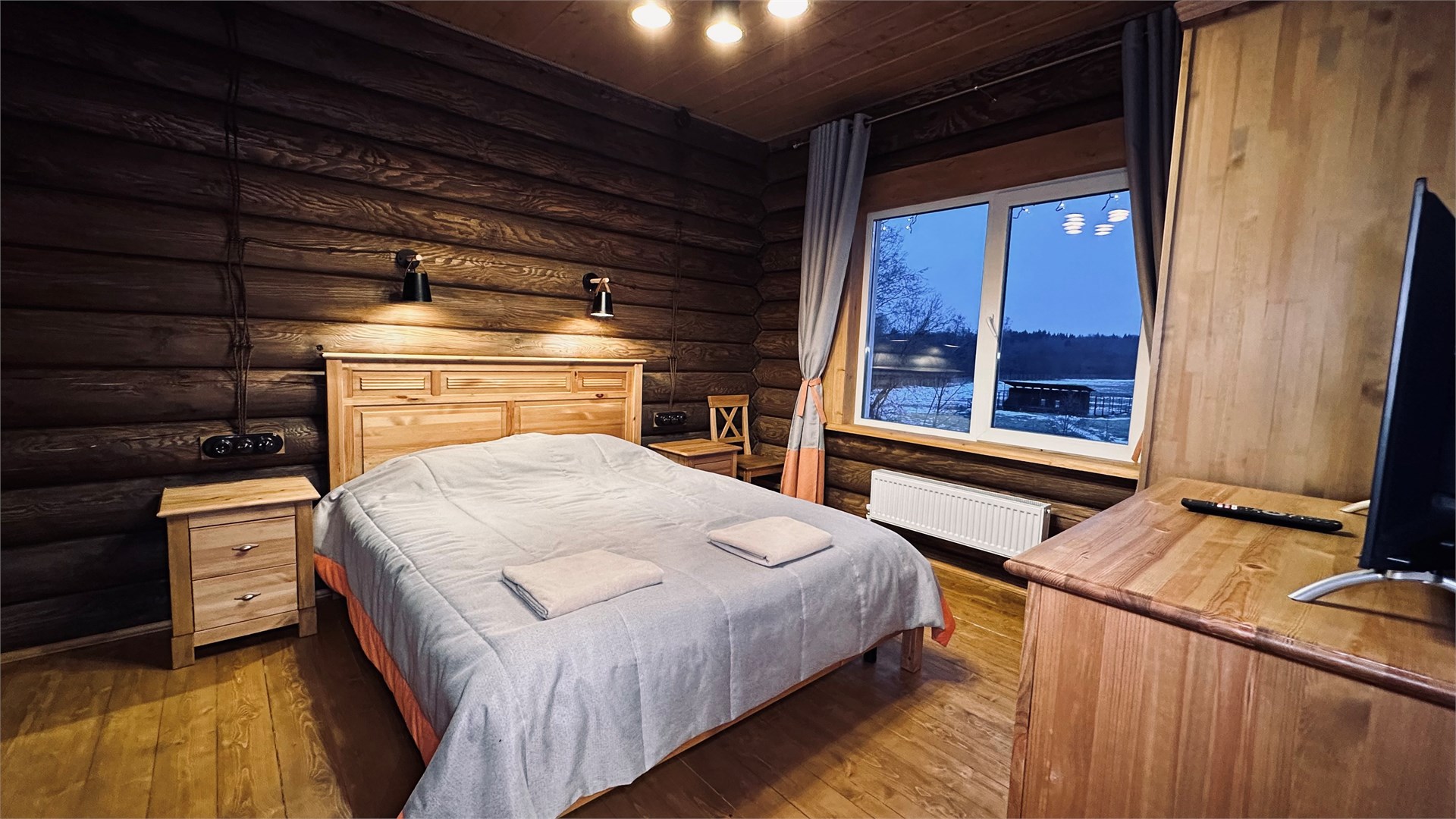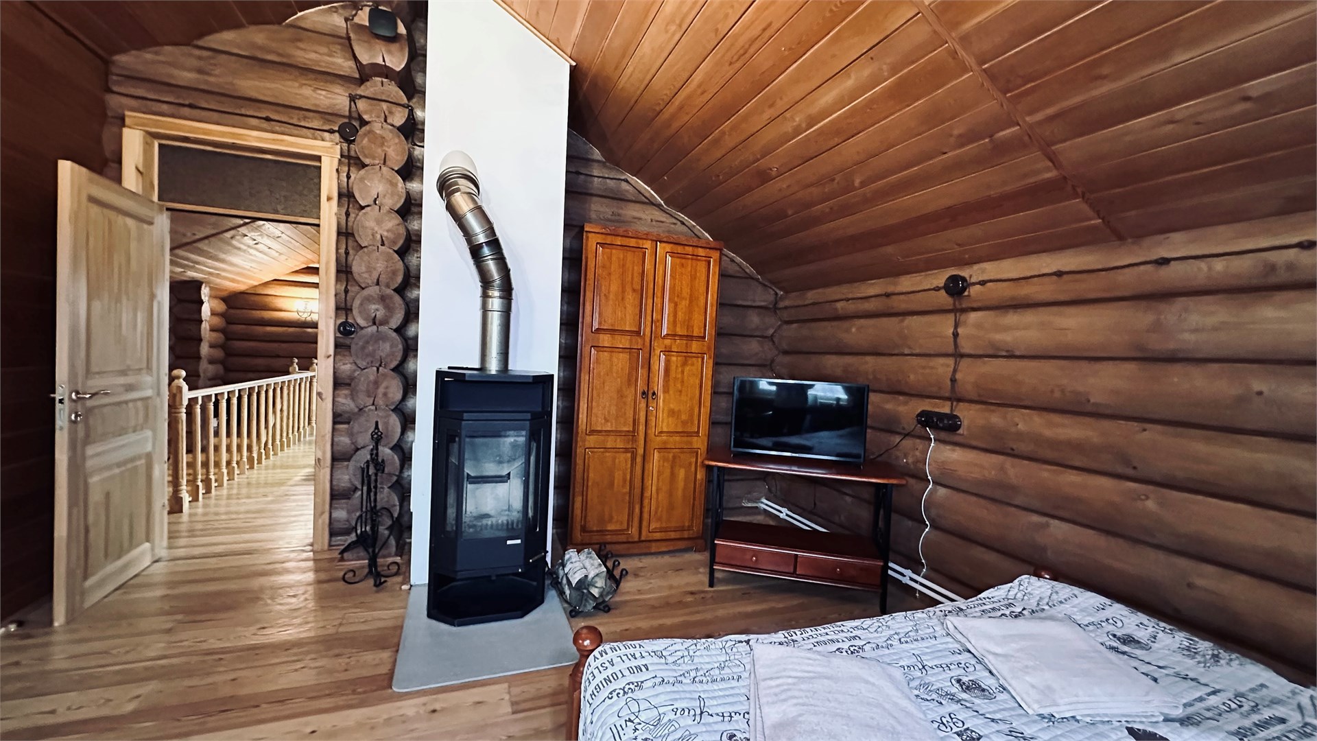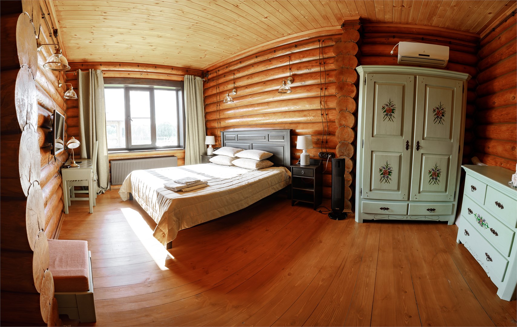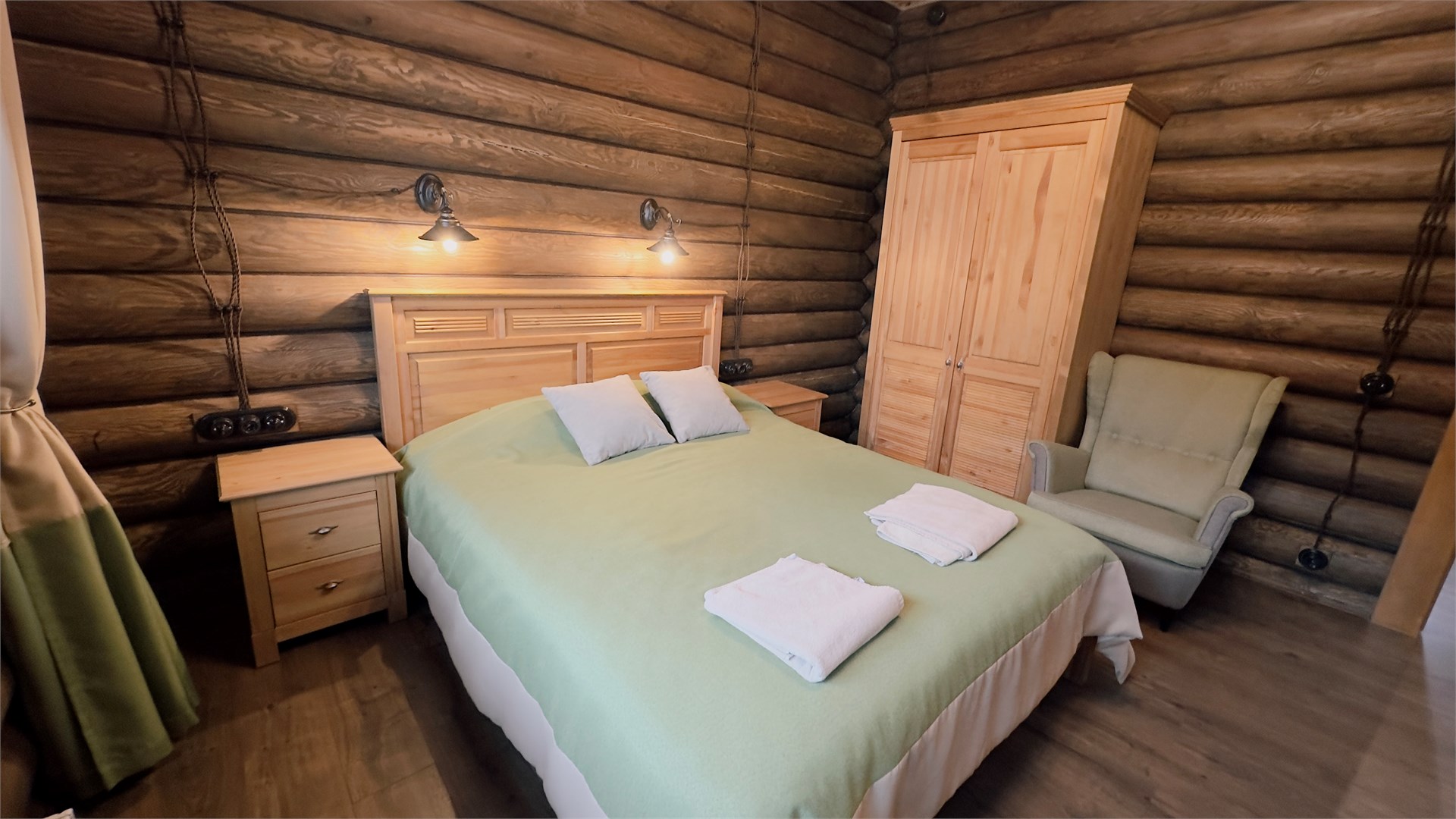 В номере: диван, зеркало, кровать двуспальная, прикроватные тумбочки, стол, стулья, шкаф, камин, микроволновая печь, набор посуды, плита электрическая, телевизор ЖК, холодильник, чайный набор посуды, электрочайник
