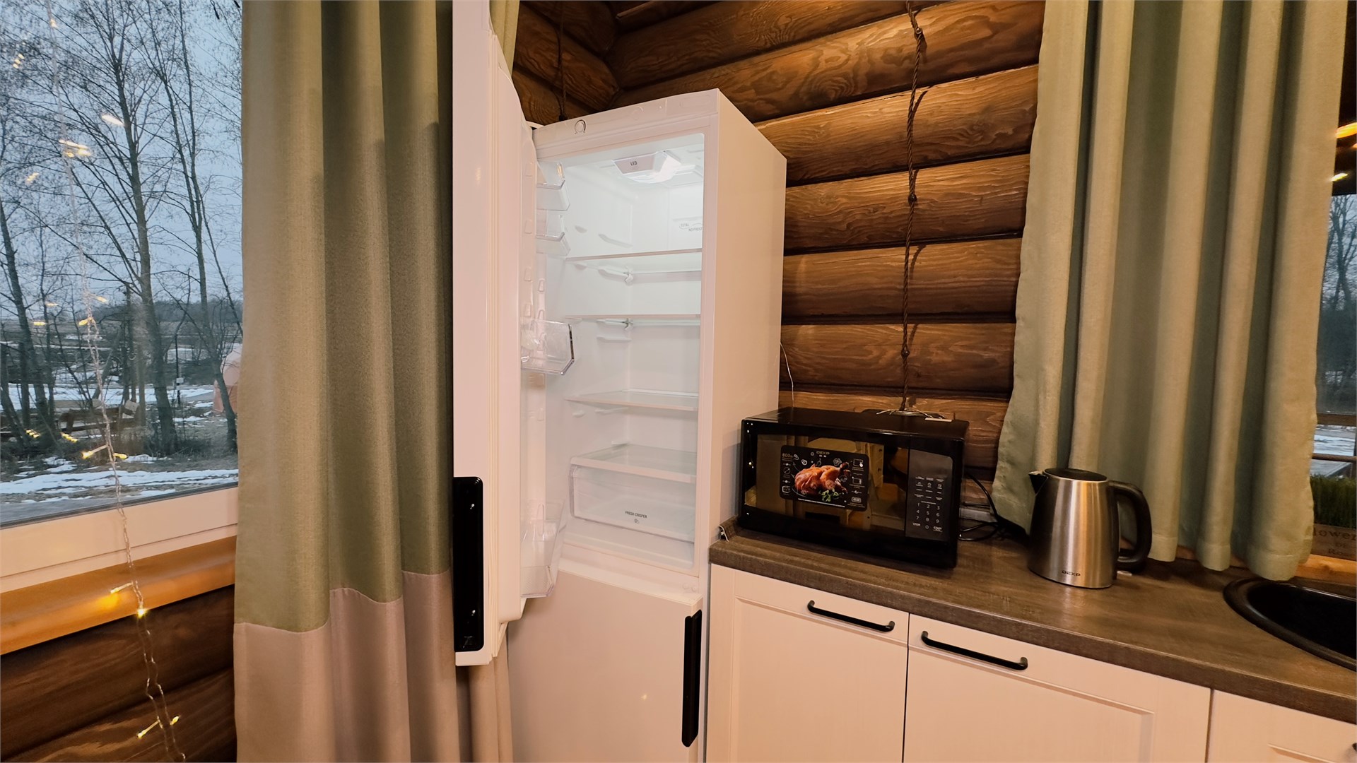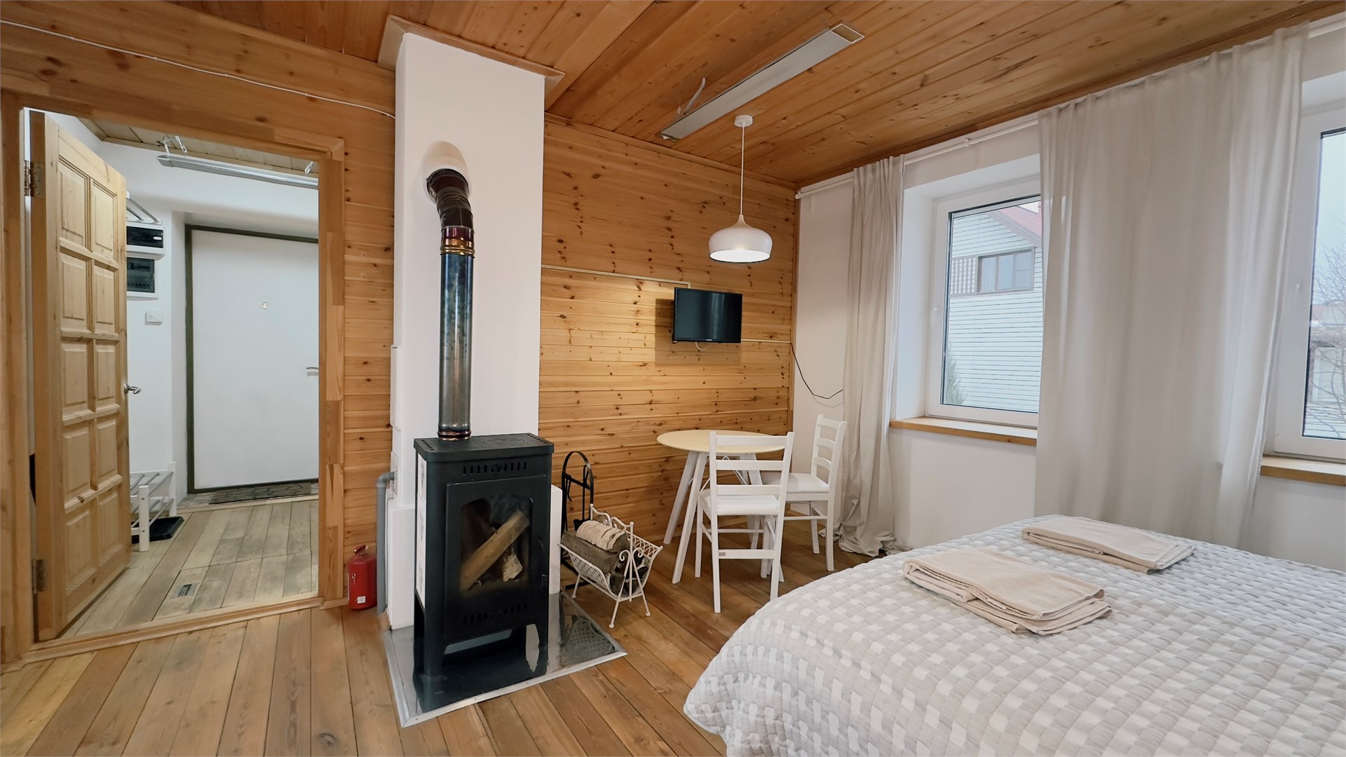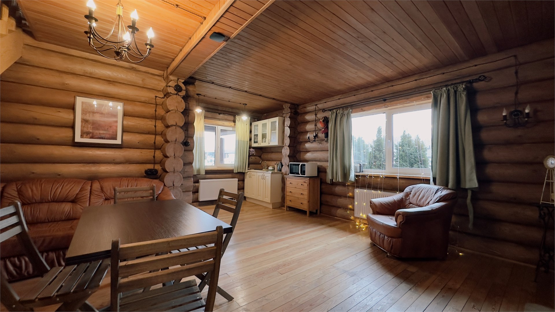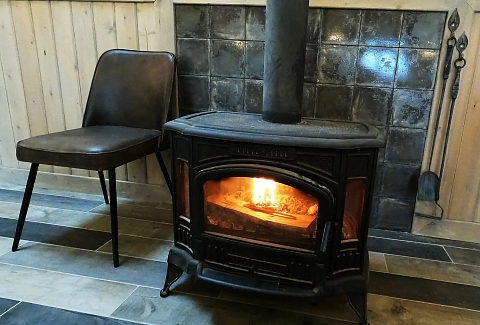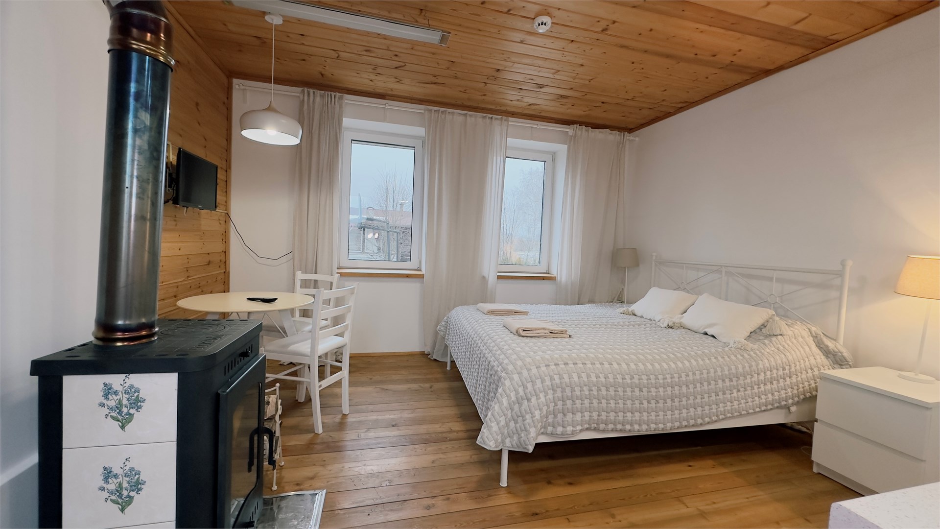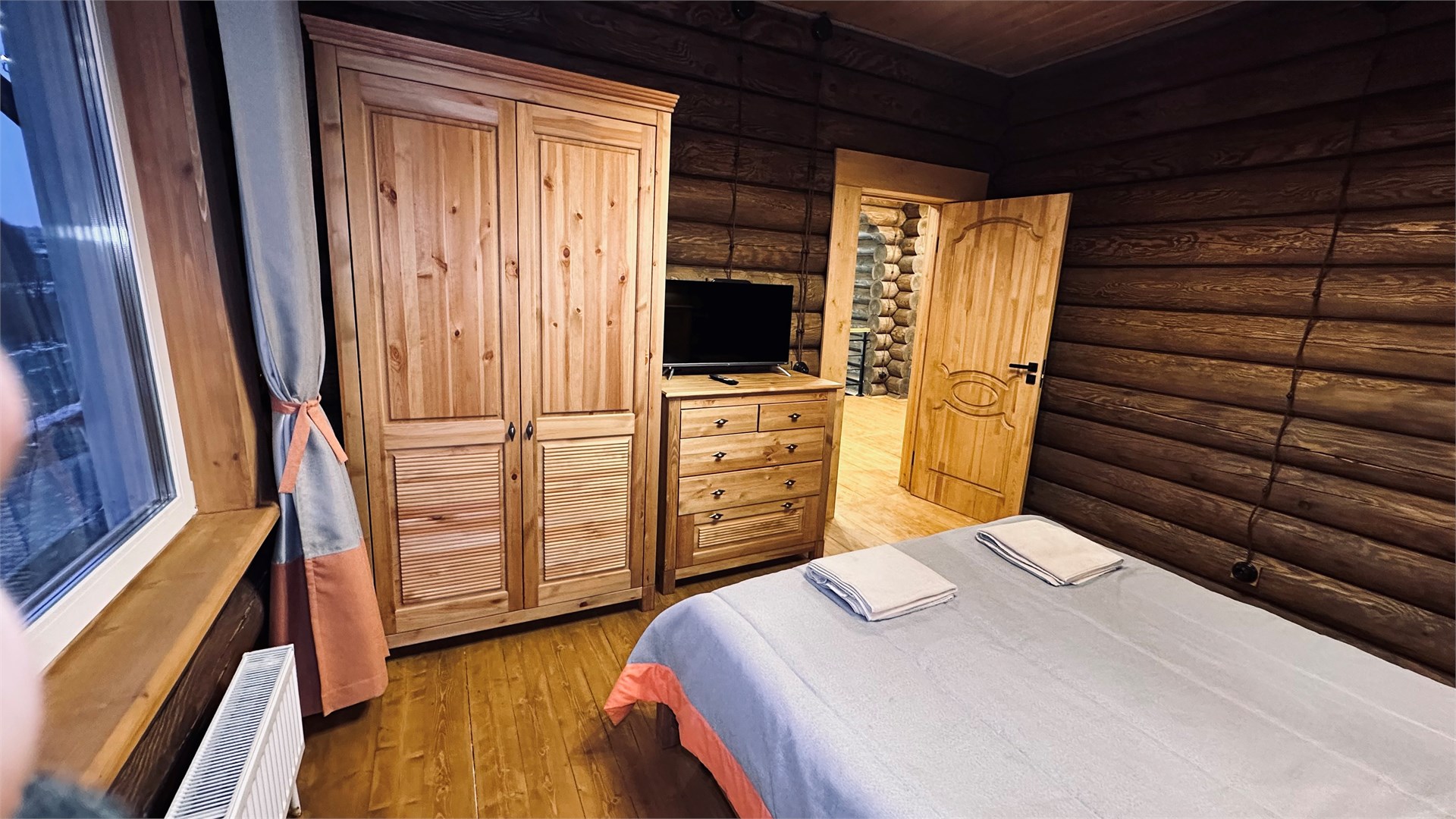 В номере: диван, зеркало, кровать двуспальная, прикроватные тумбочки, стол, стулья, шкаф, камин, микроволновая печь, набор посуды, плита электрическая, телевизор ЖК, холодильник, чайный набор посуды, электрочайник