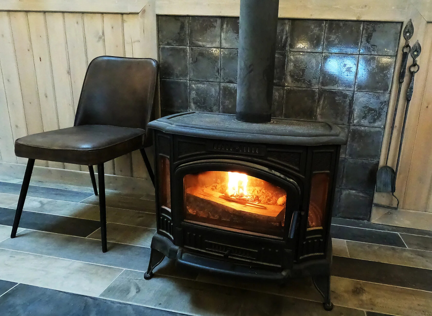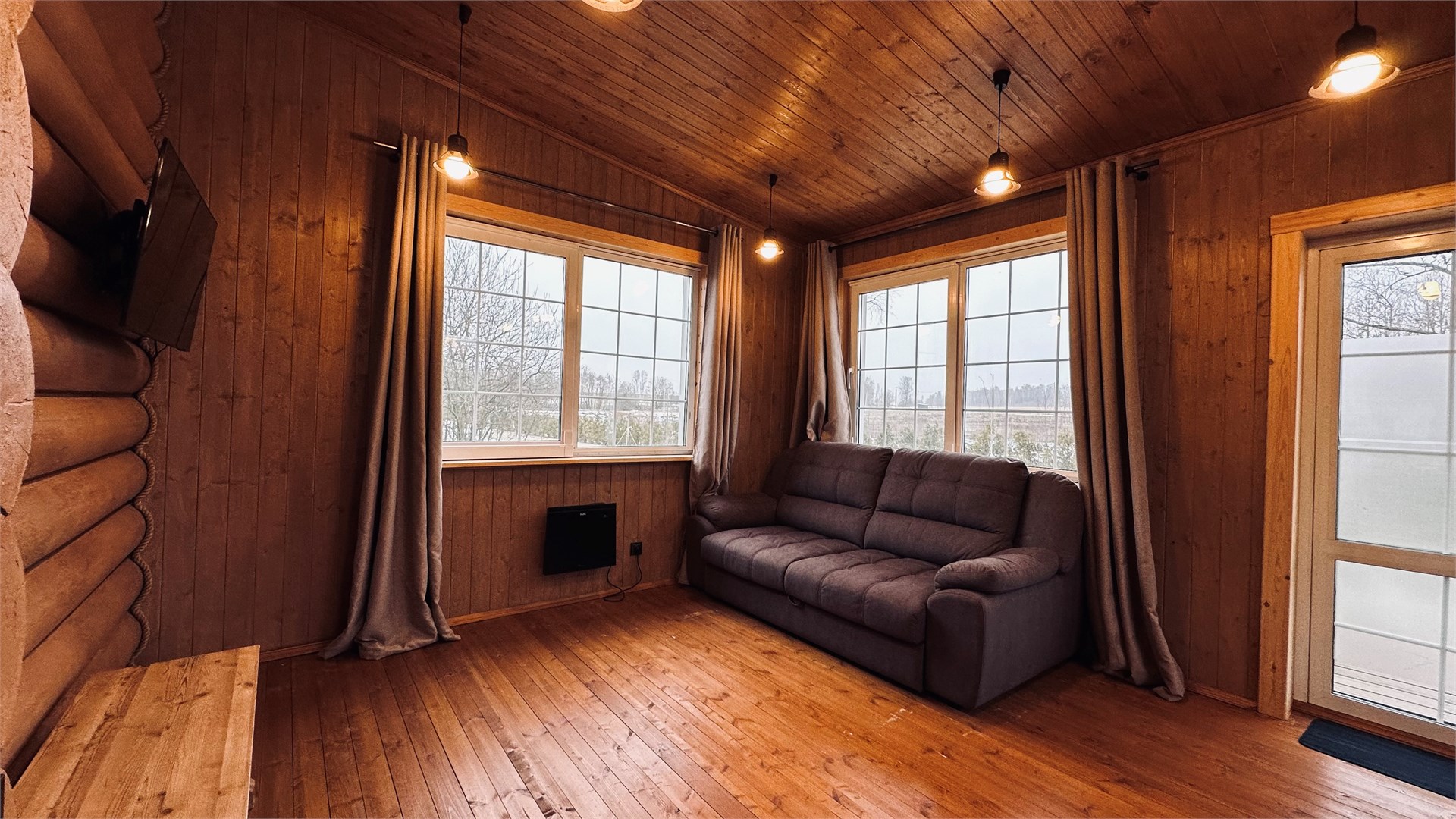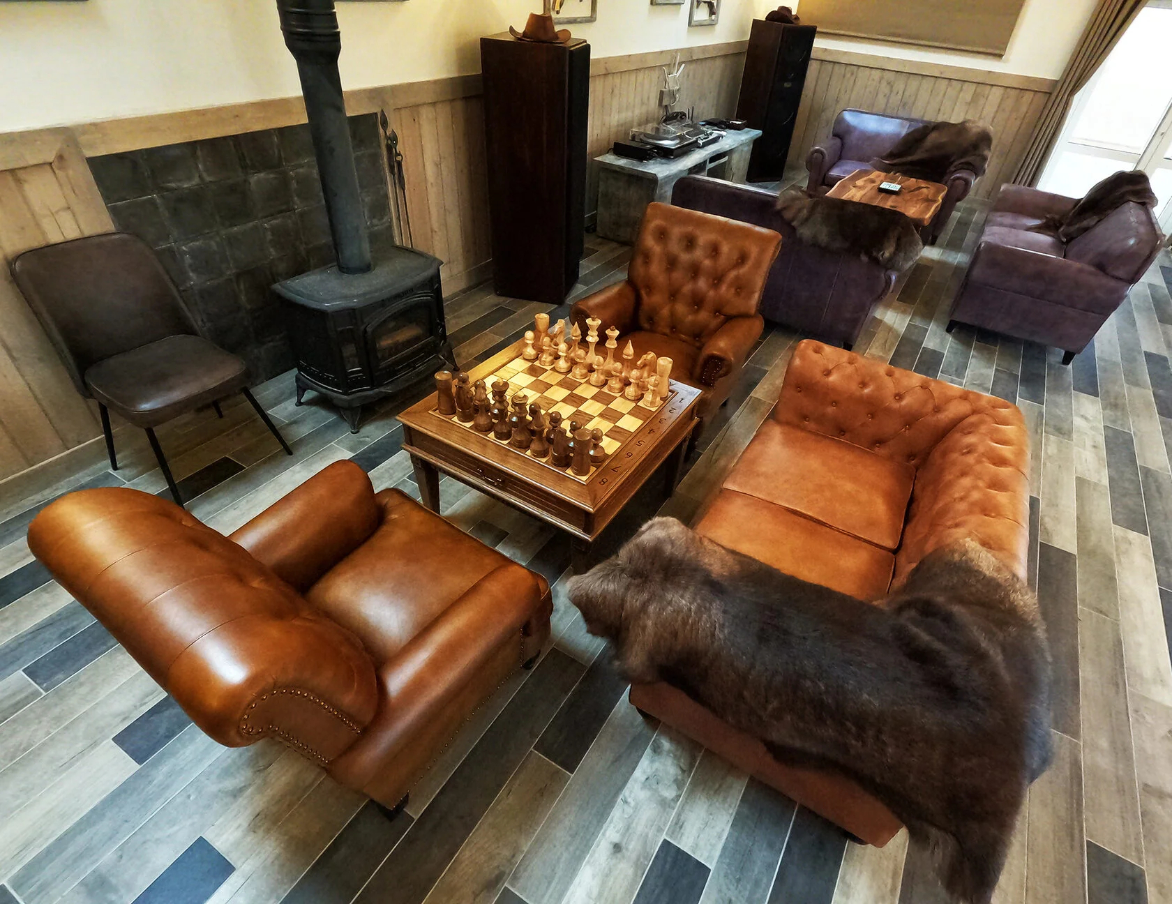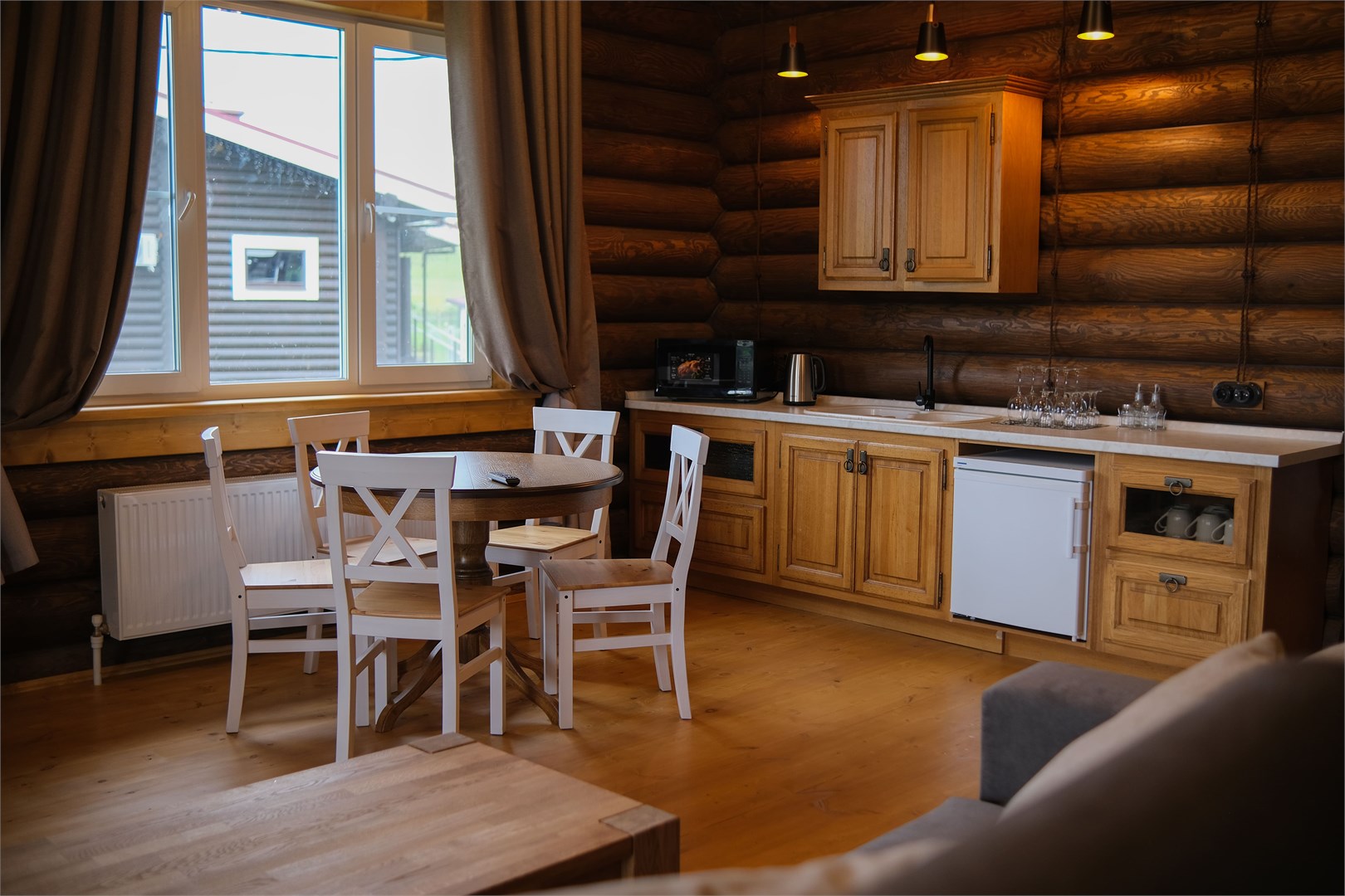 В номере: диван, зеркало, кровать двуспальная, прикроватные тумбочки, стол, стулья, шкаф, камин, микроволновая печь, набор посуды, плита электрическая, телевизор ЖК, холодильник, чайный набор посуды, электрочайник