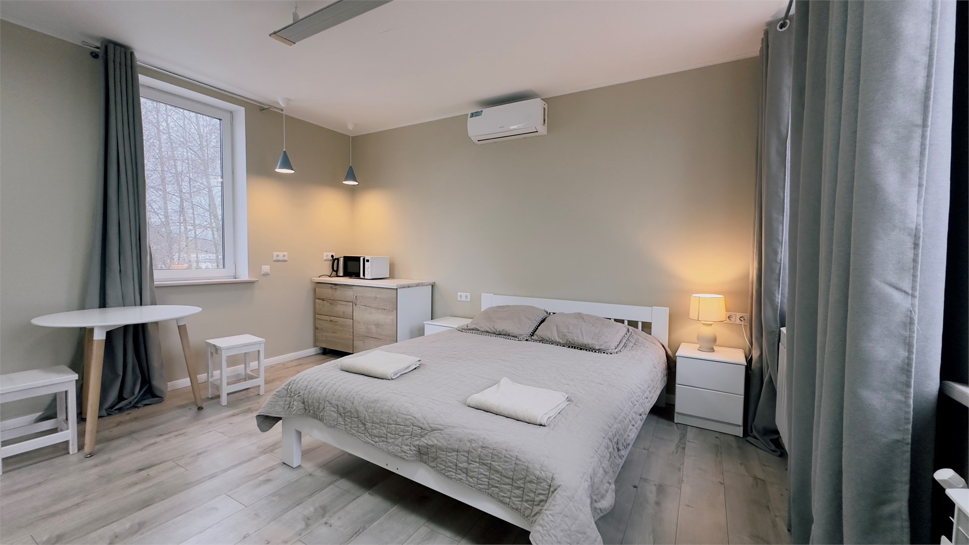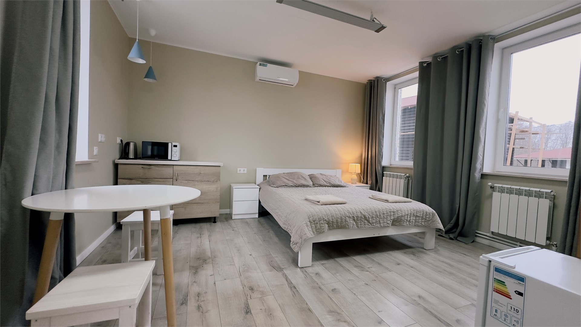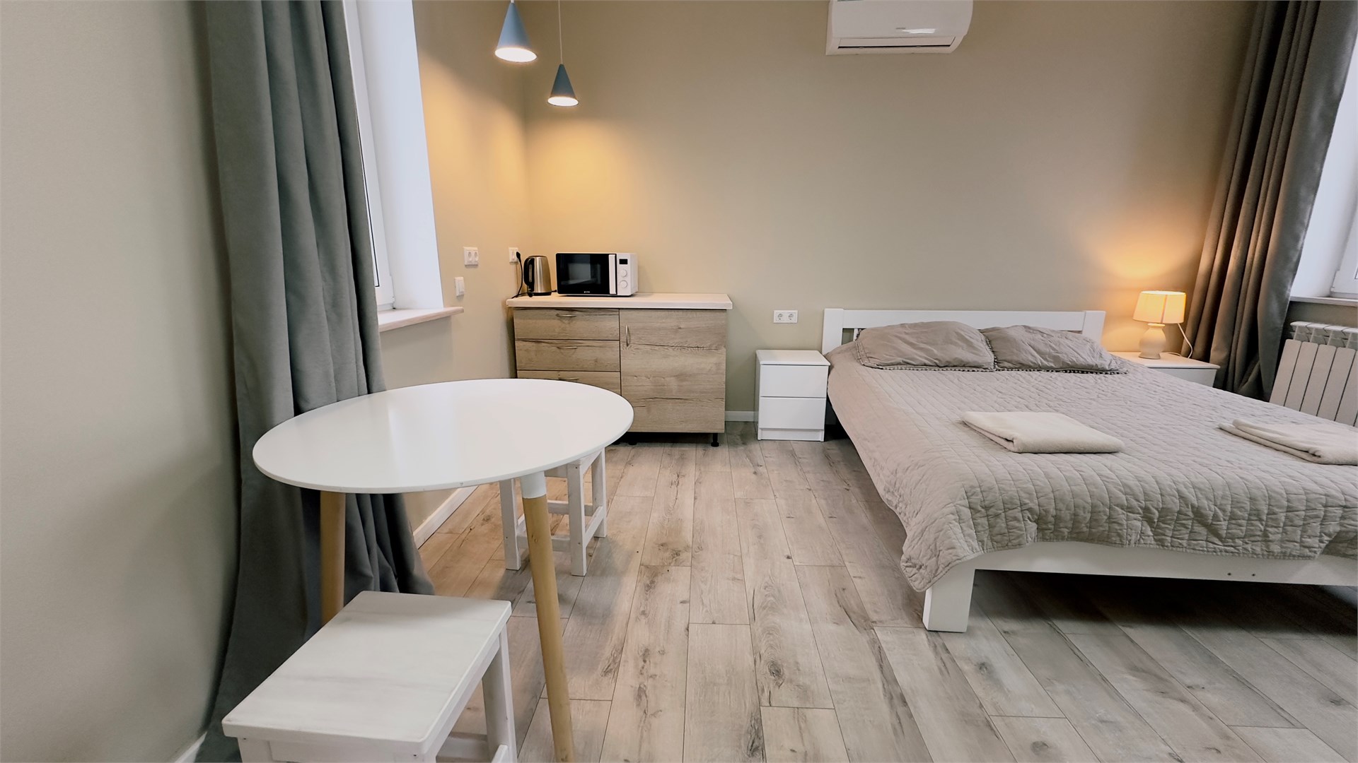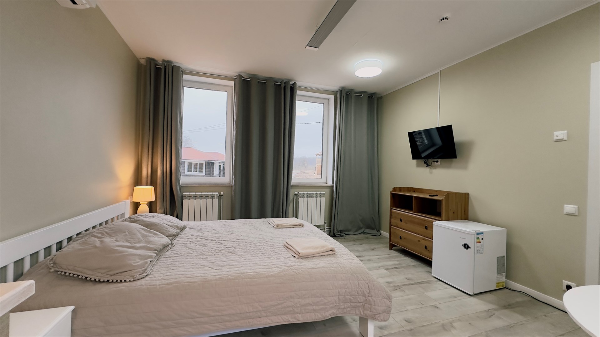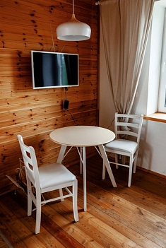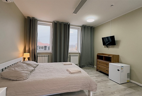 В номере: вешалка, зеркало, кровать двуспальная, прикроватные тумбочки, стол, стулья, шкаф, микроволновая печь, мини-холодильник, телевизор ЖК, чайник, электрочайник