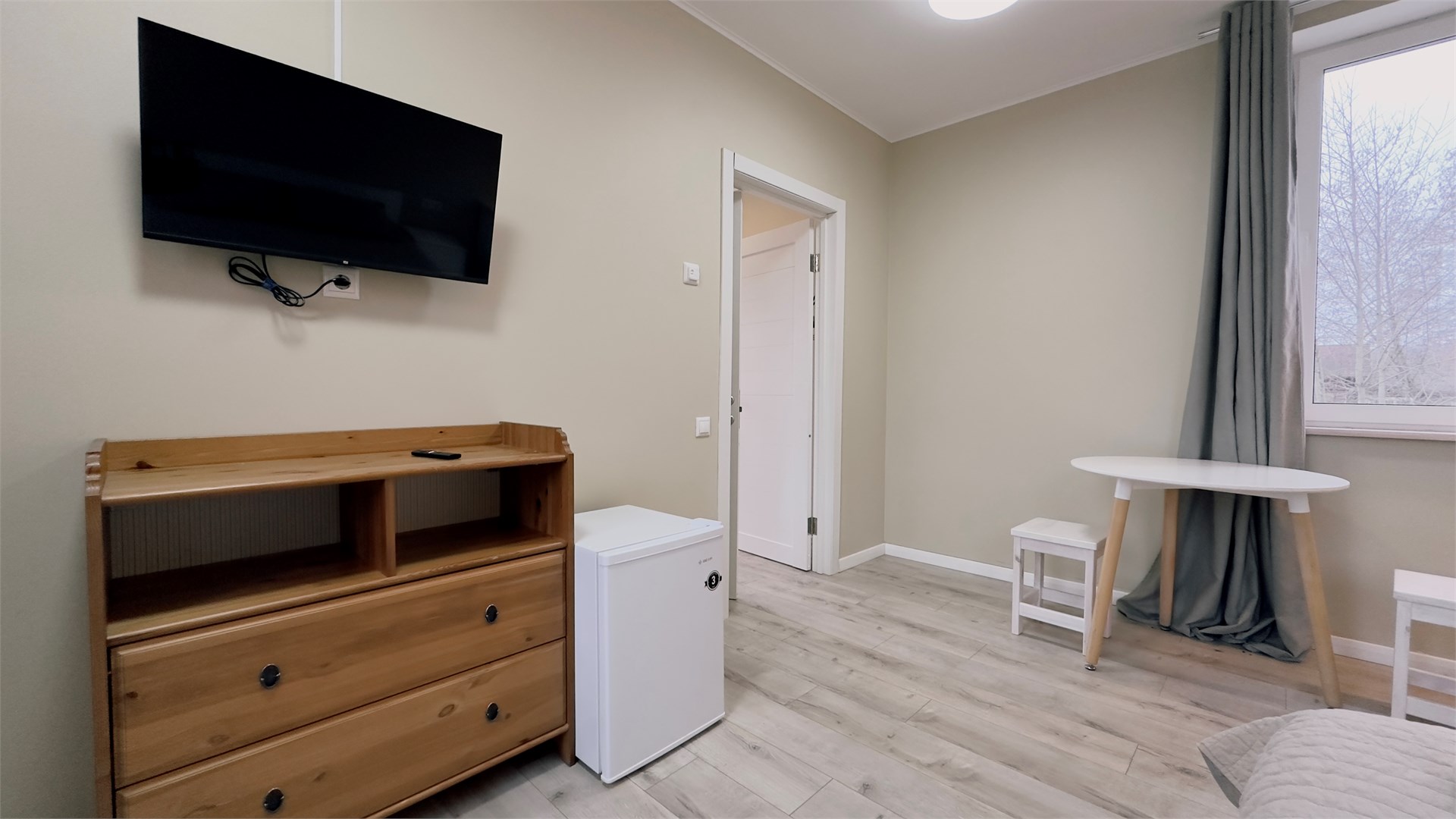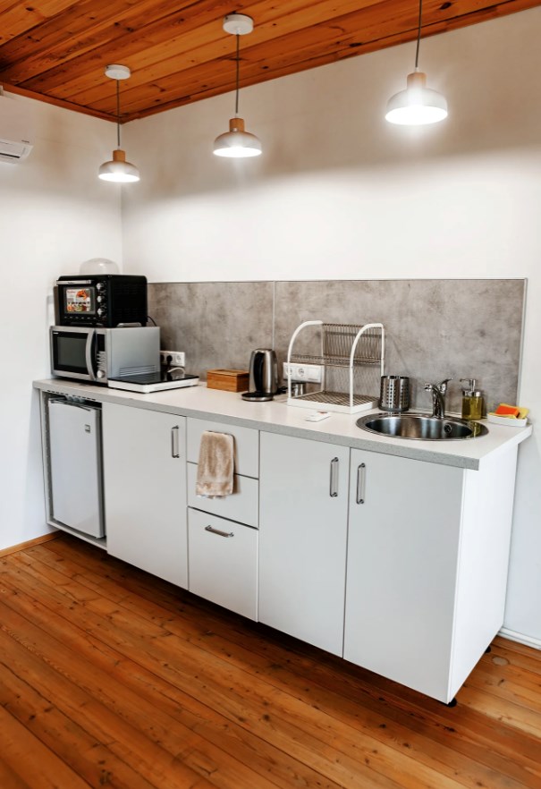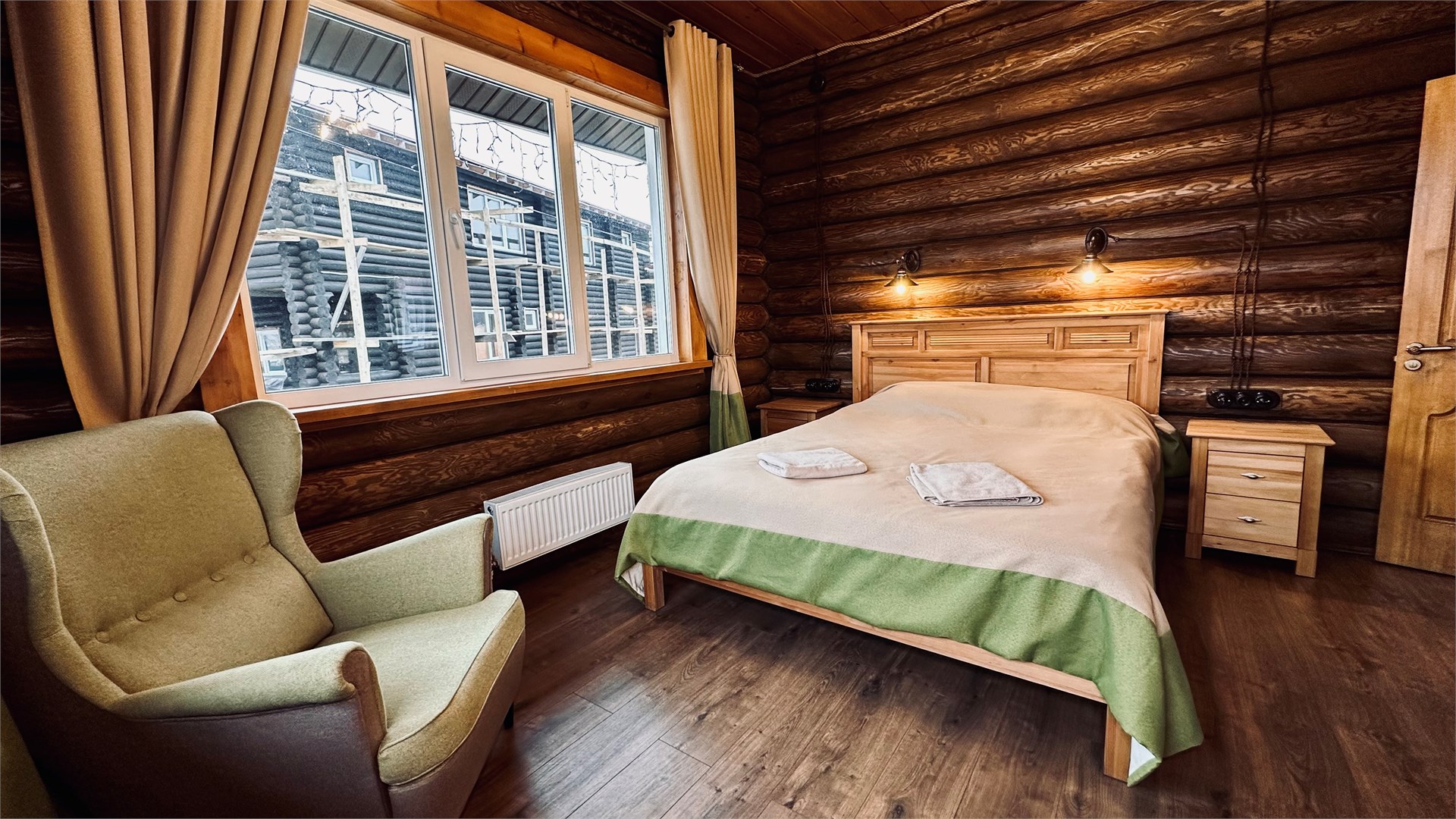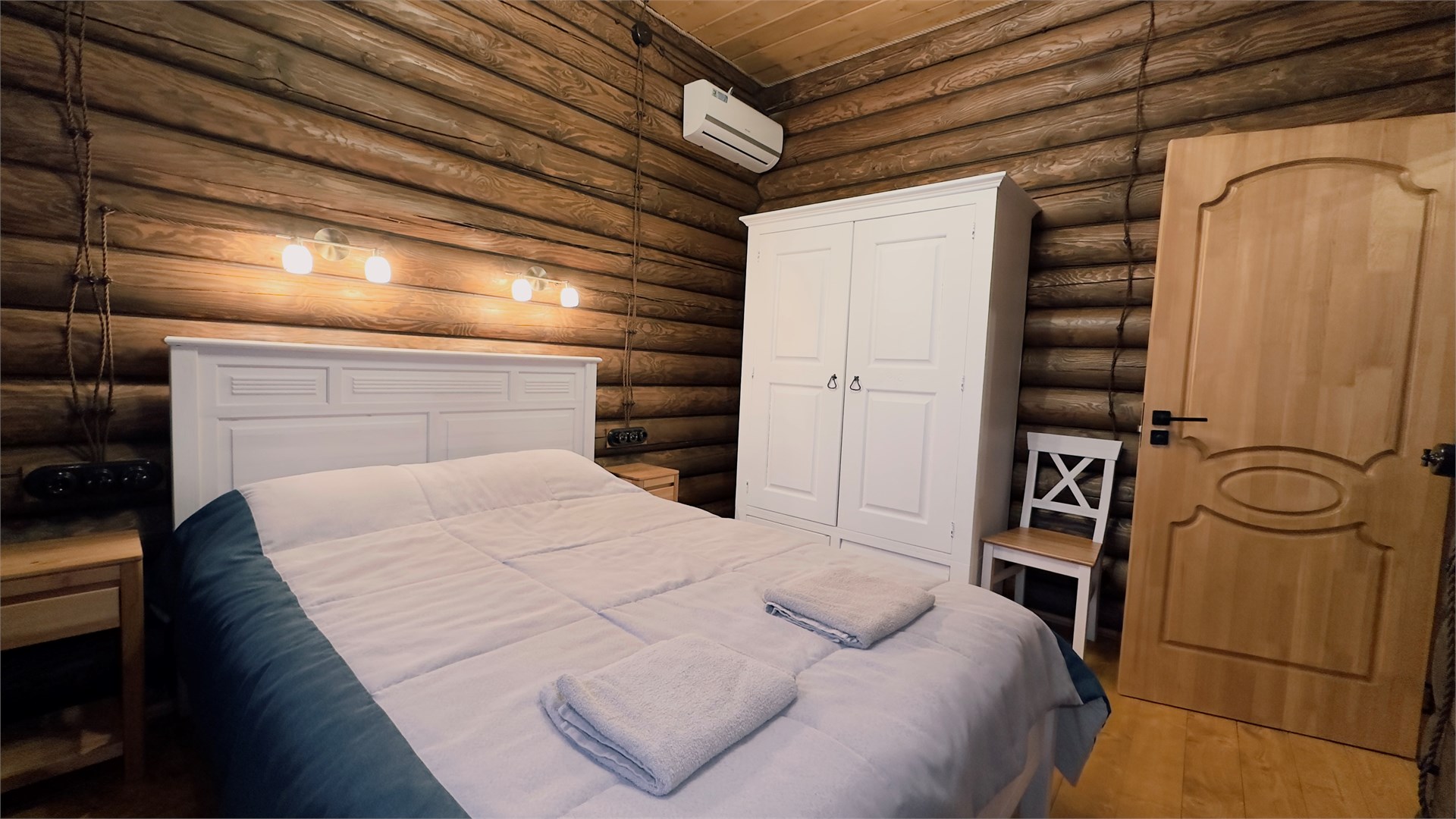В номере: вешалка, зеркало, кровать двуспальная, прикроватные тумбочки, стол, стулья, шкаф, микроволновая печь, мини-холодильник, телевизор ЖК, чайник, электрочайник