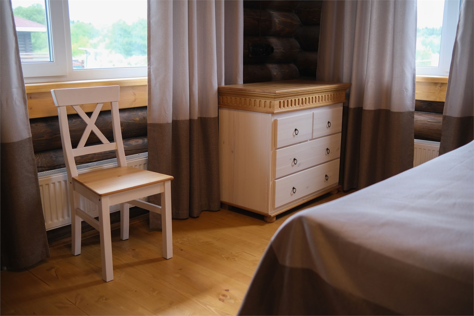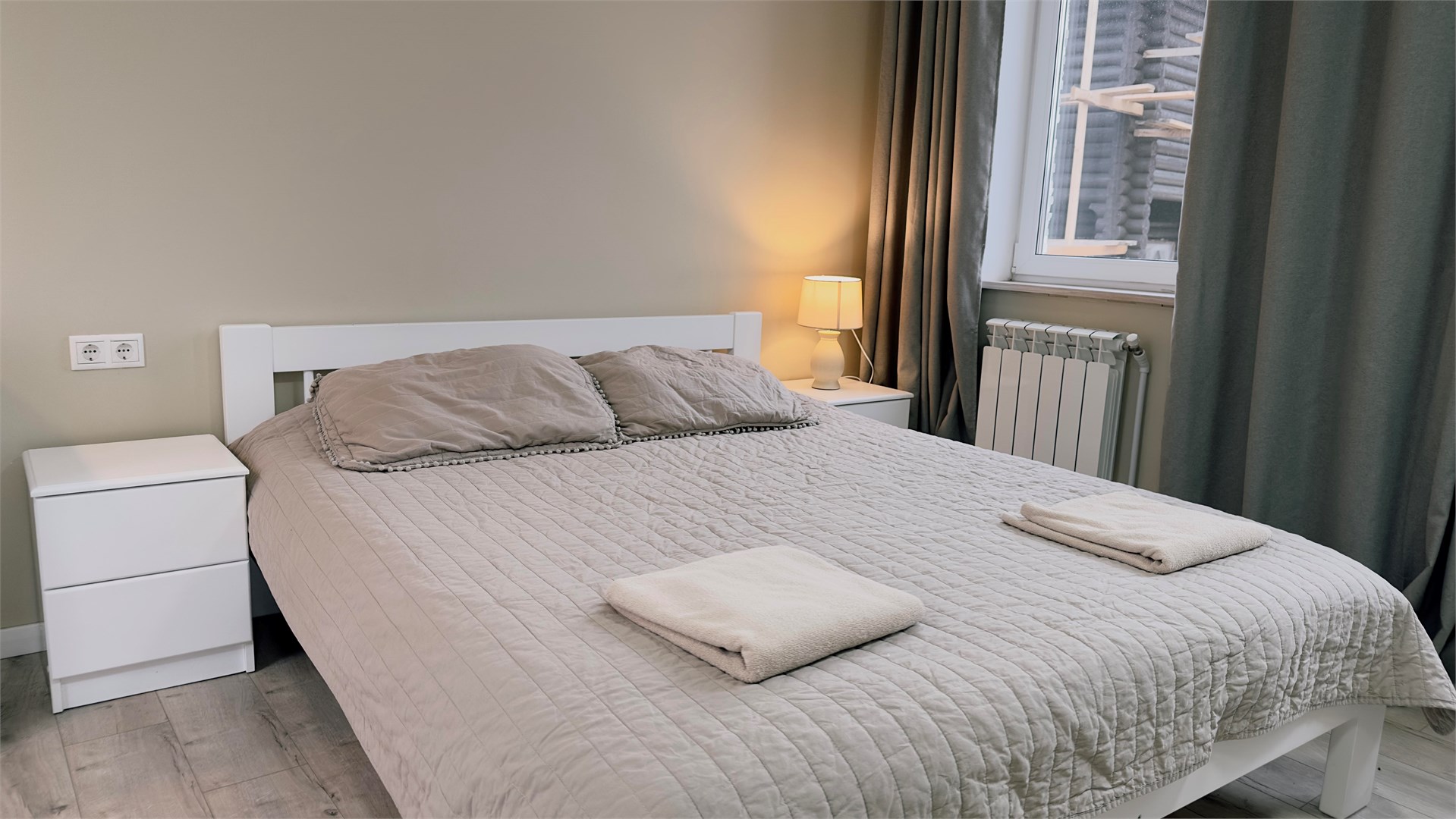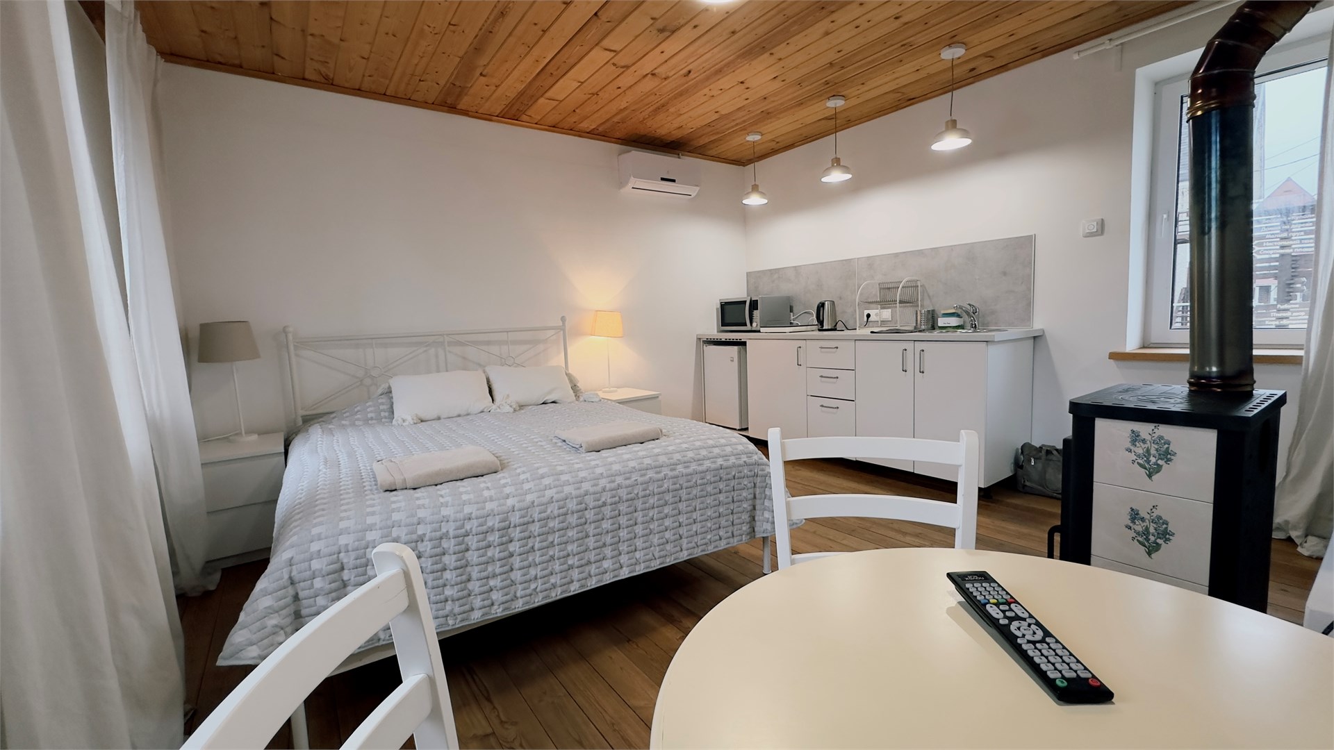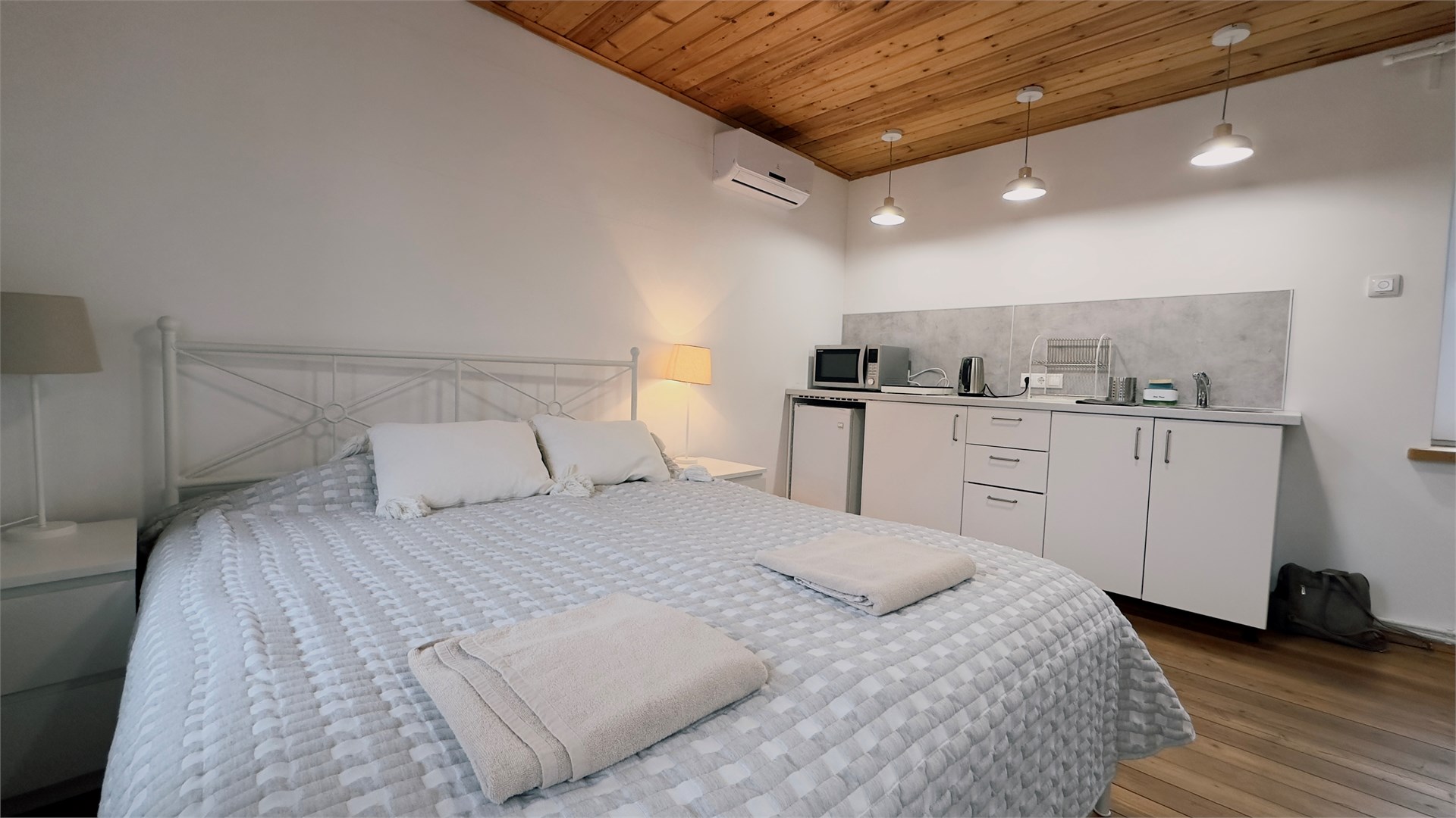 В номере: вешалка, зеркало, кровать двуспальная, прикроватные тумбочки, стол, стулья, шкаф, микроволновая печь, мини-холодильник, телевизор ЖК, чайник, электрочайник