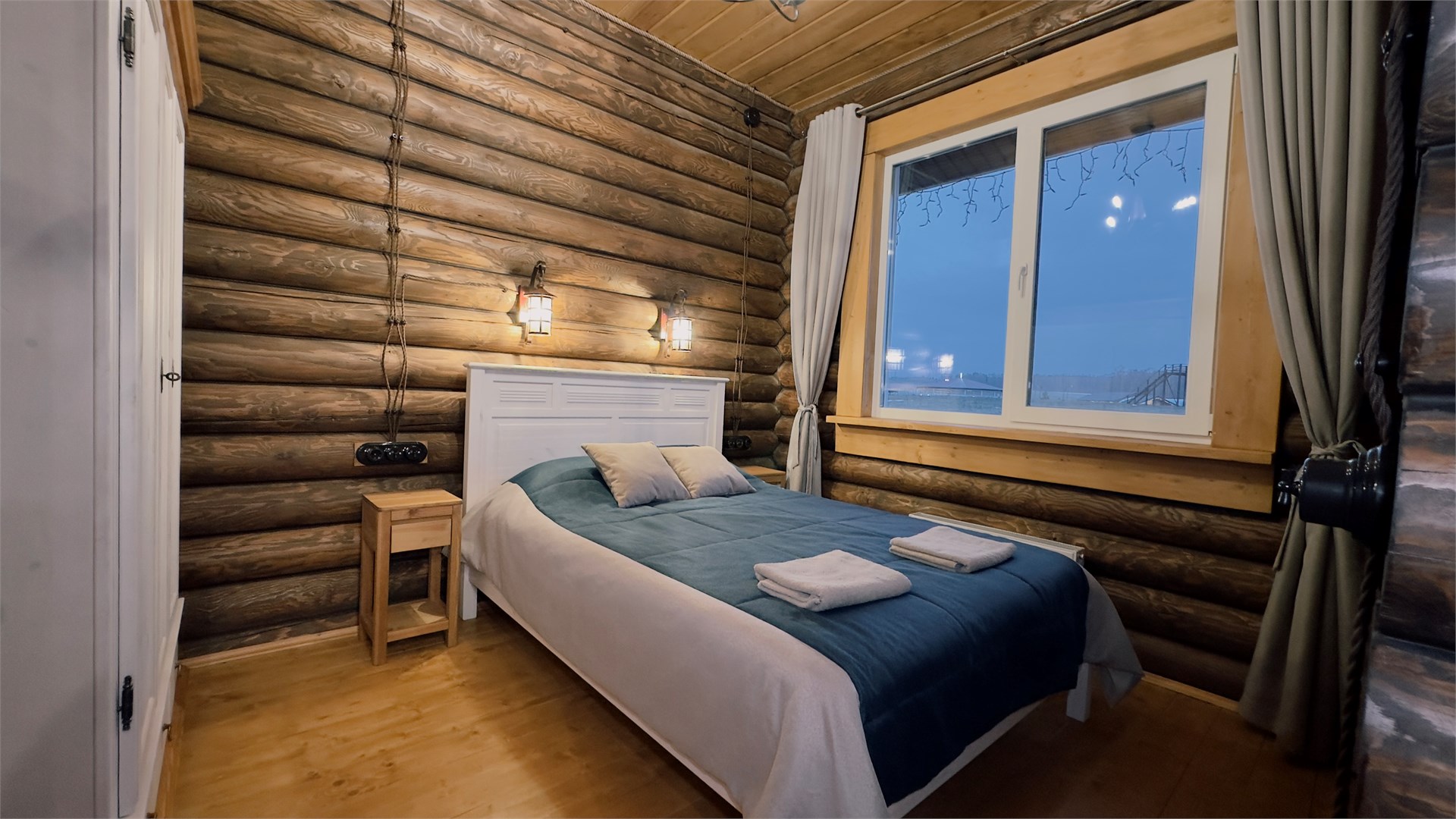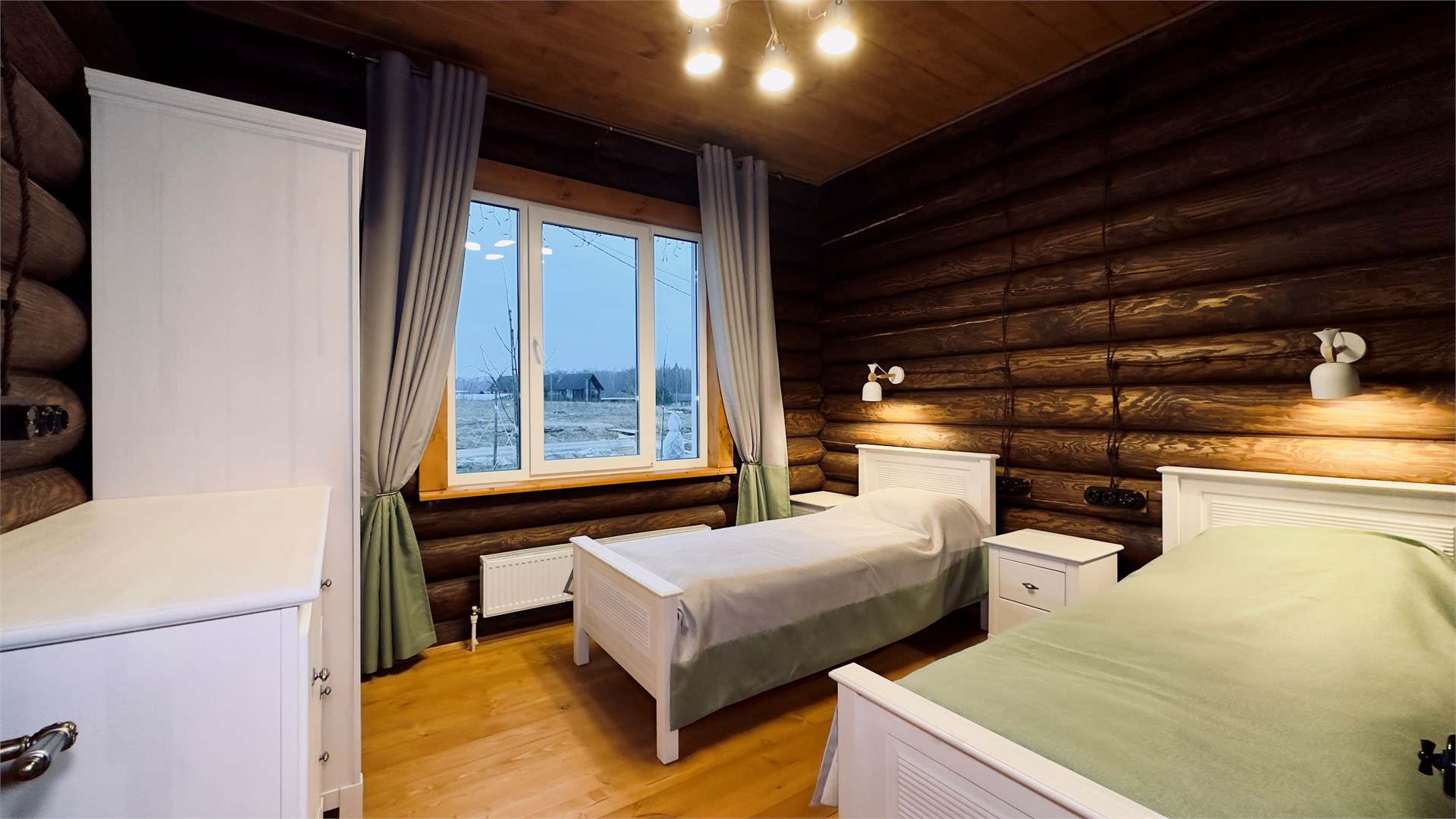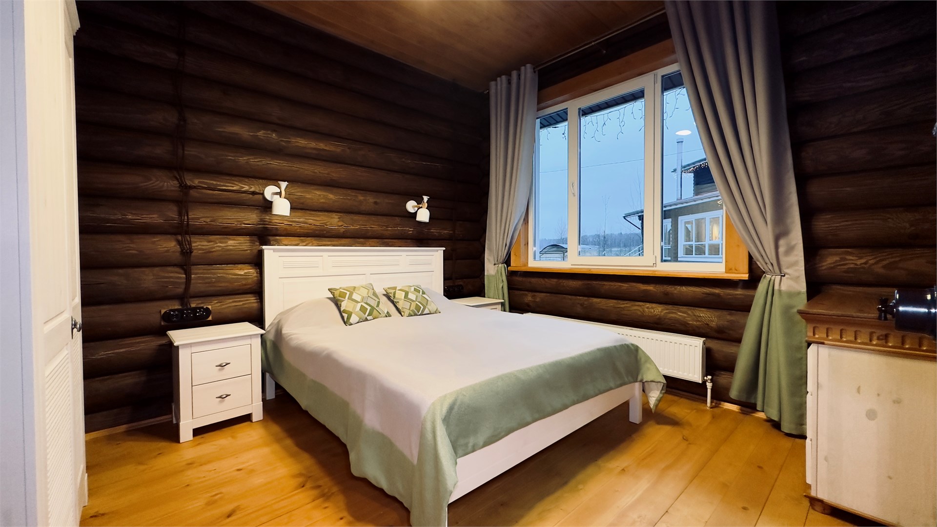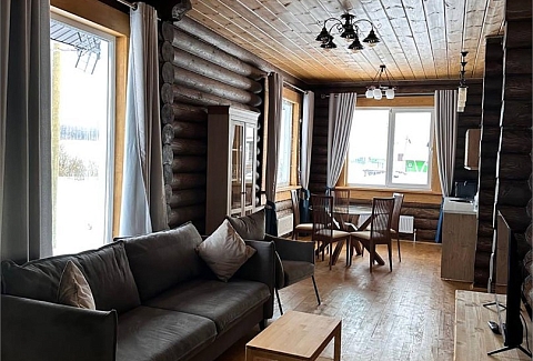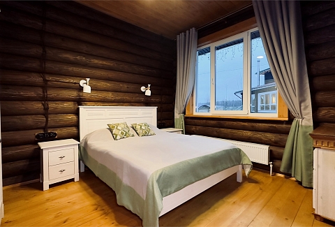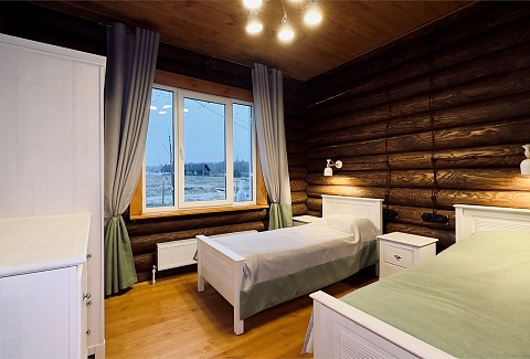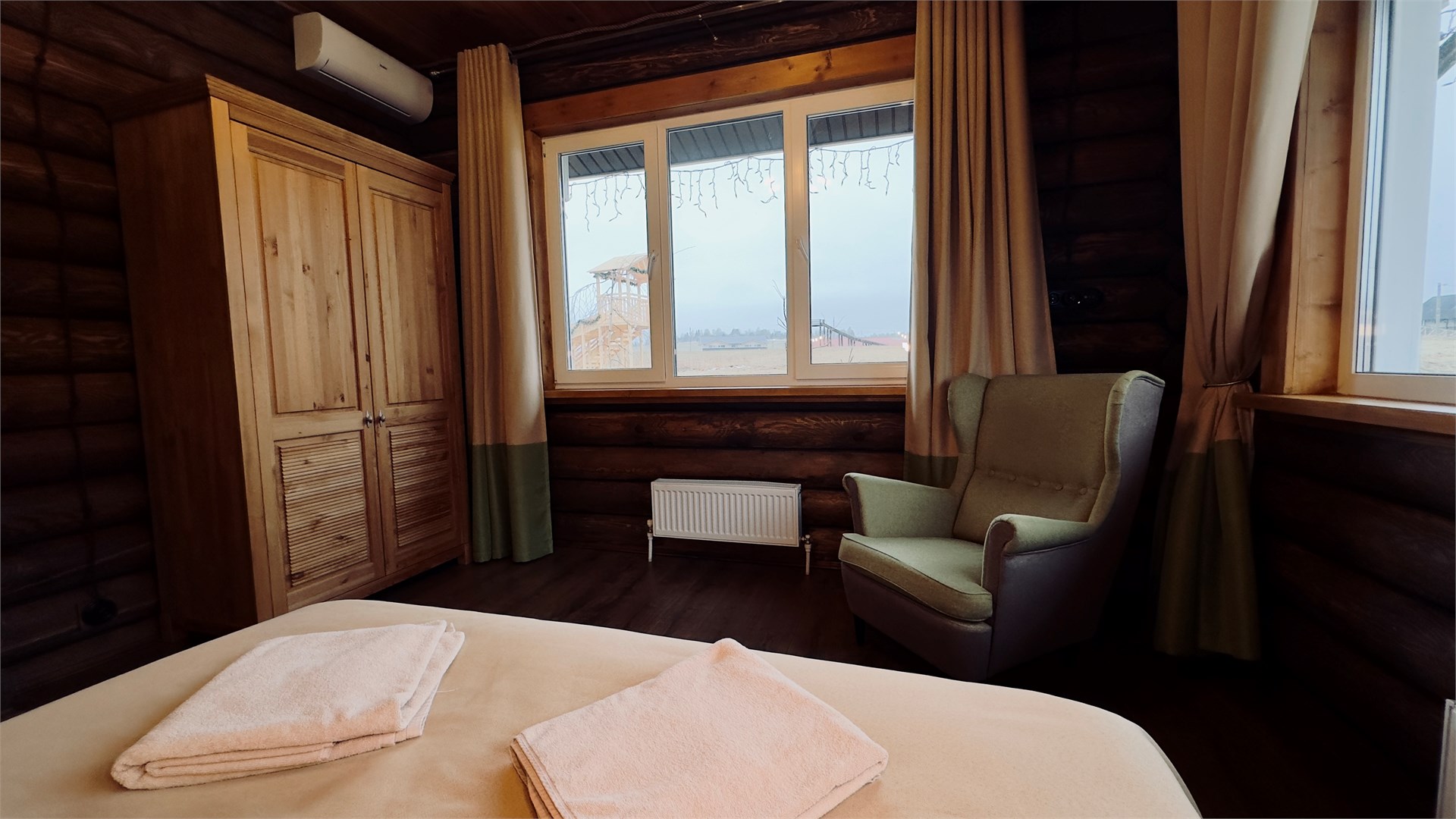 В номере: диван, зеркало, кровати односпальные, кровать двуспальная, прикроватные тумбочки, стол, стулья, шкаф, камин, микроволновая печь, набор посуды, плита электрическая, стиральная машина, телевизор ЖК, холодильник, чайный набор посуды, электрочайник