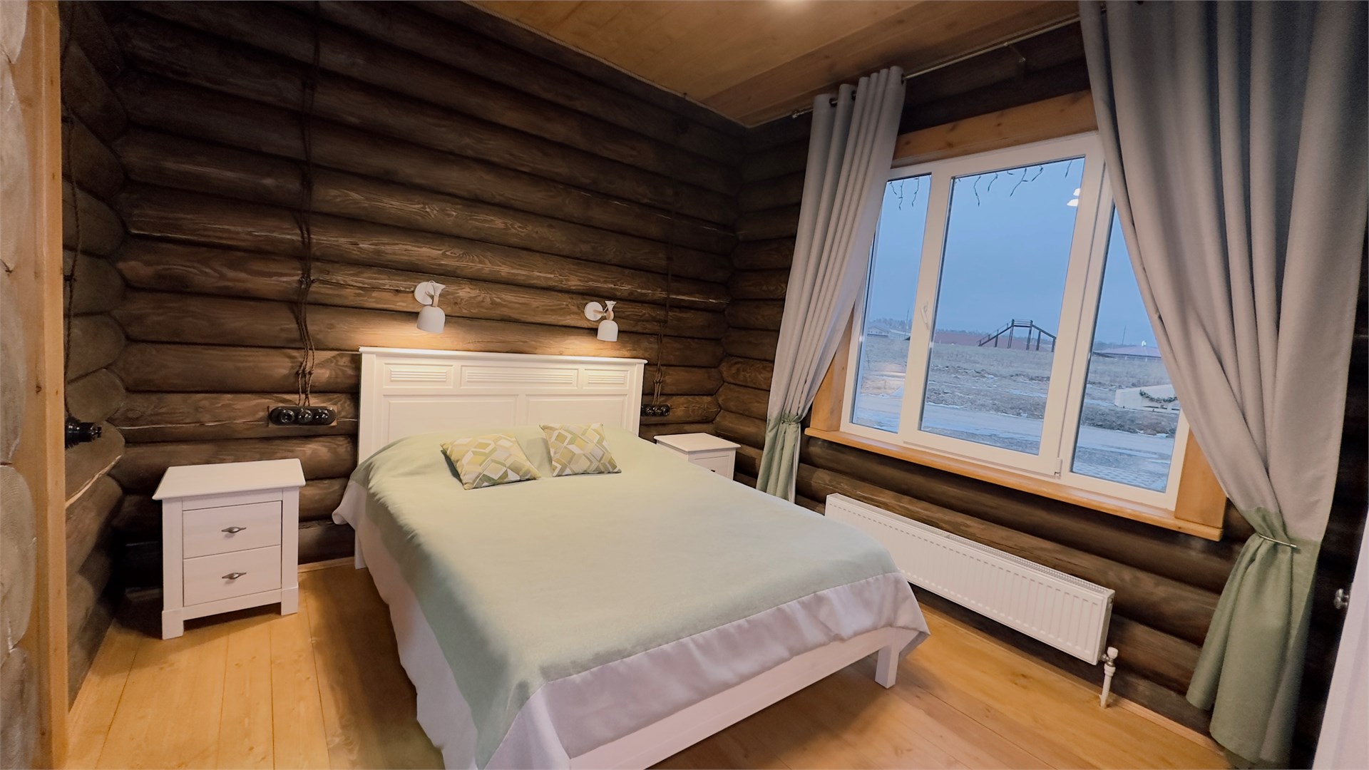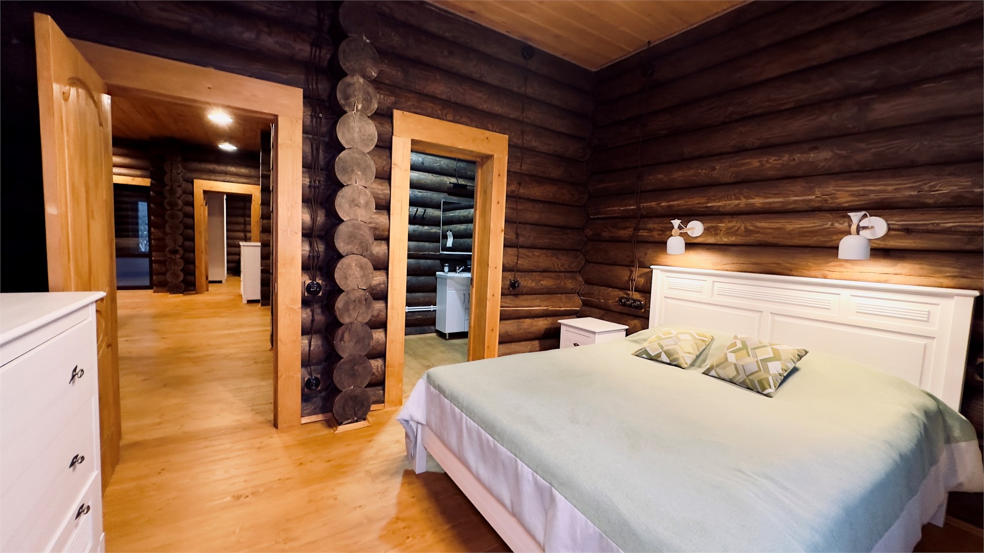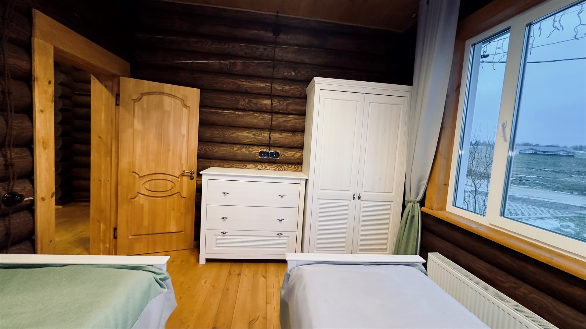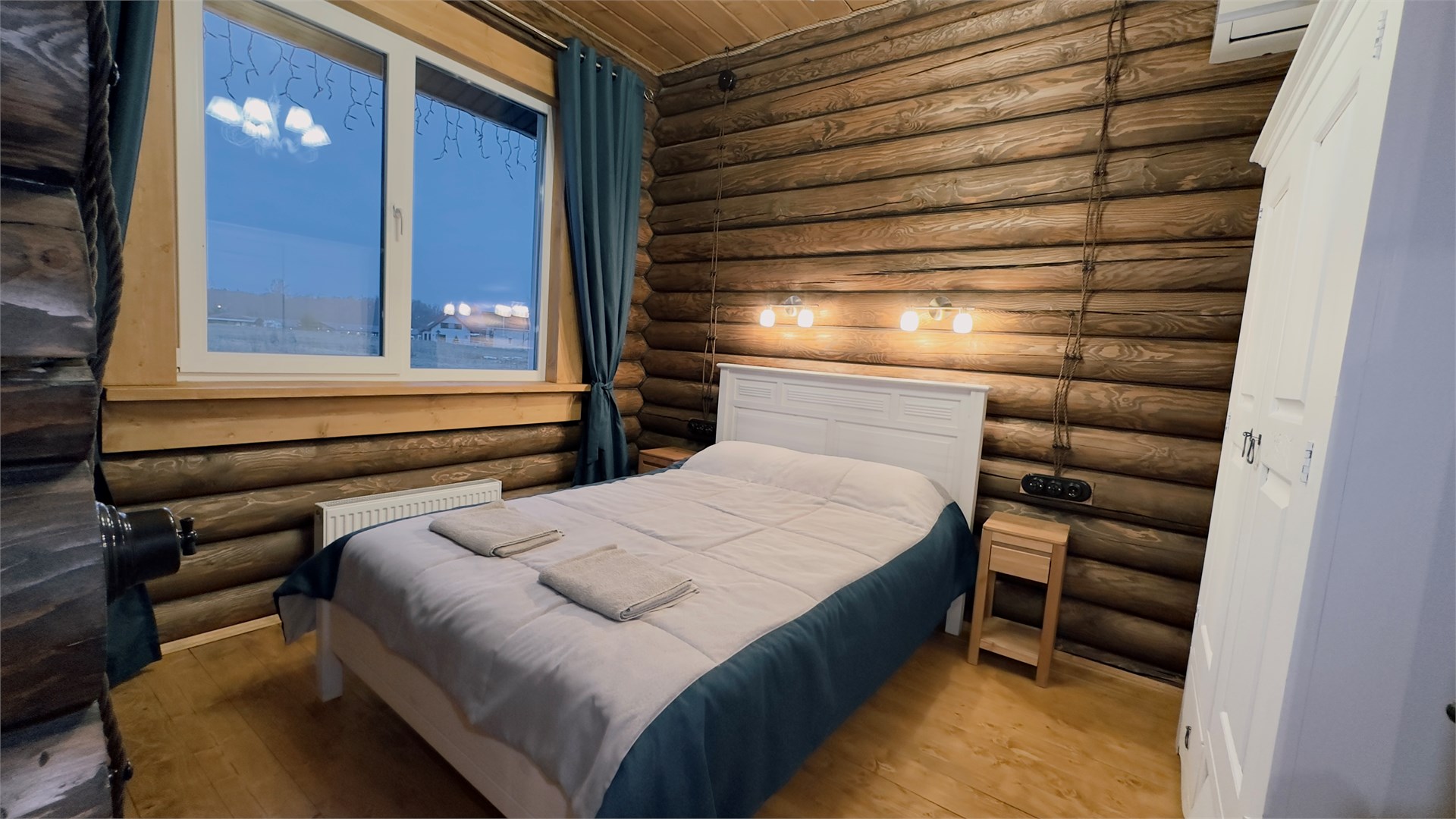 В номере: диван, зеркало, кровати односпальные, кровать двуспальная, прикроватные тумбочки, стол, стулья, шкаф, камин, микроволновая печь, набор посуды, плита электрическая, стиральная машина, телевизор ЖК, холодильник, чайный набор посуды, электрочайник
