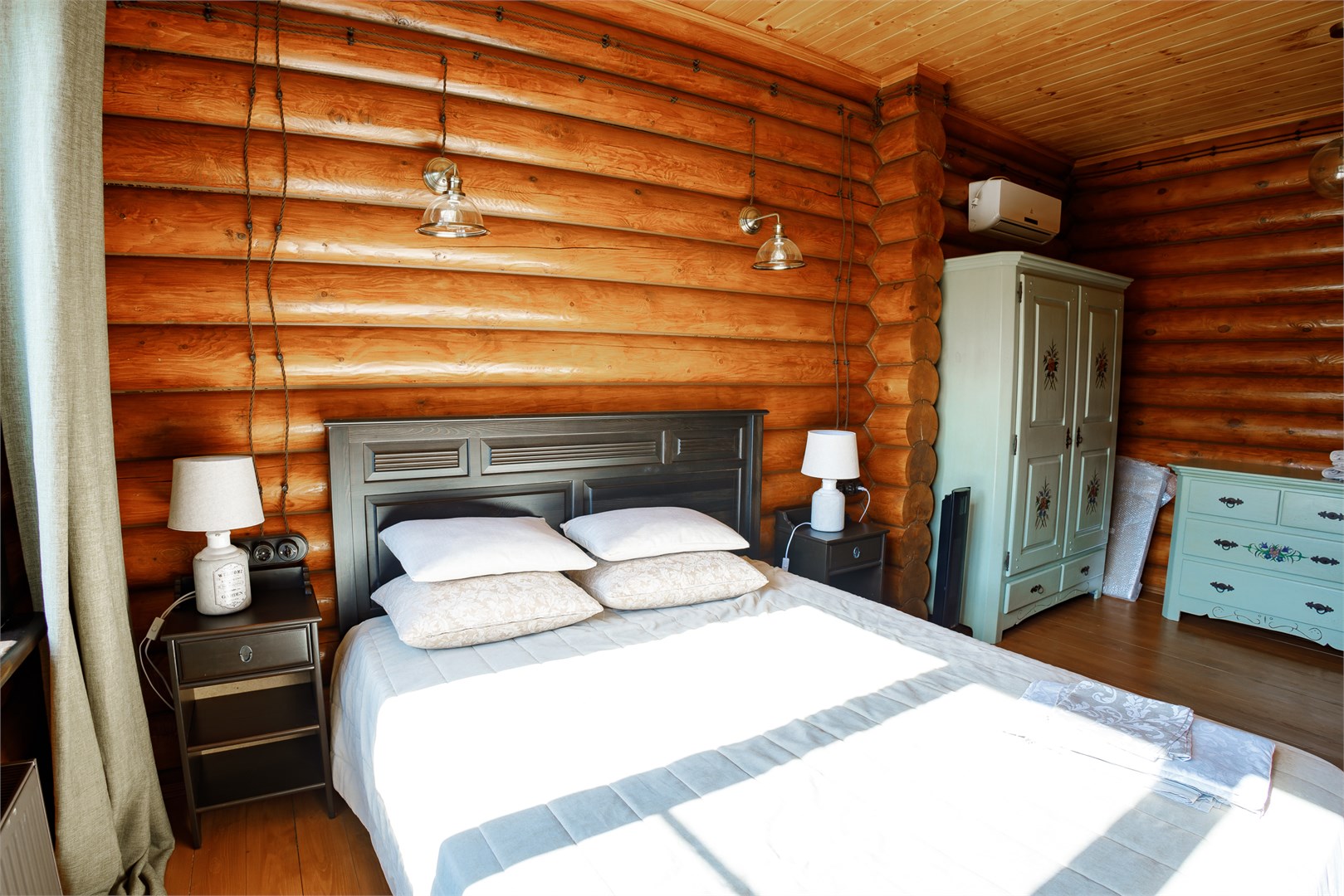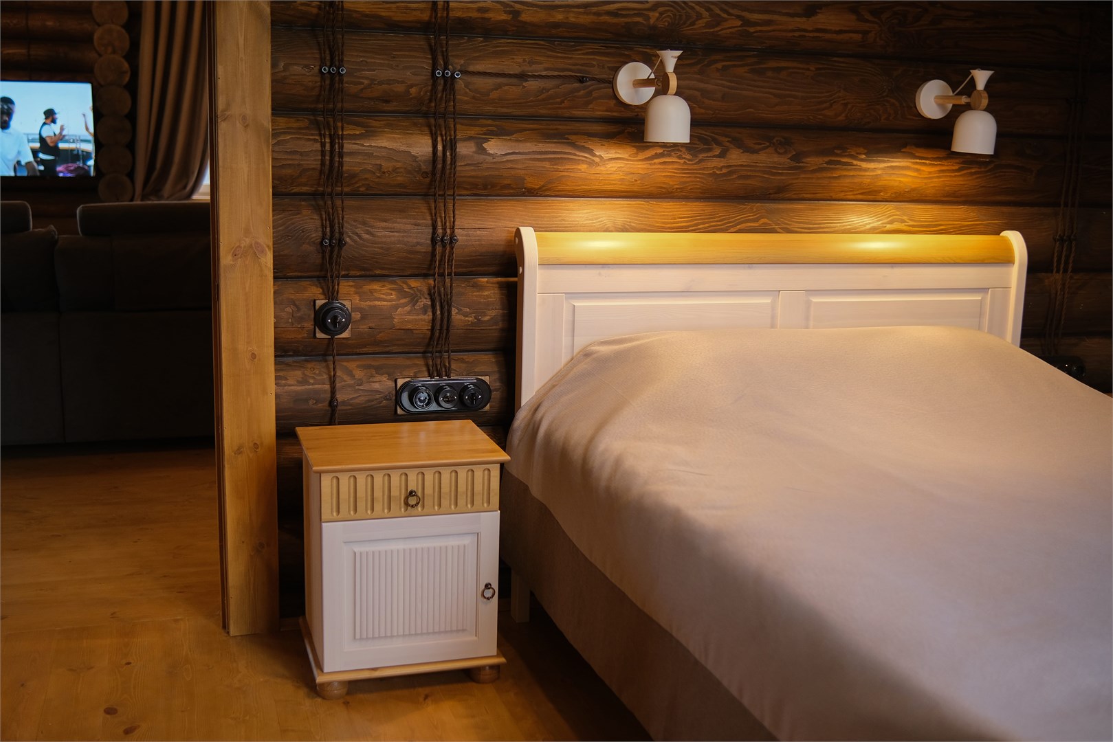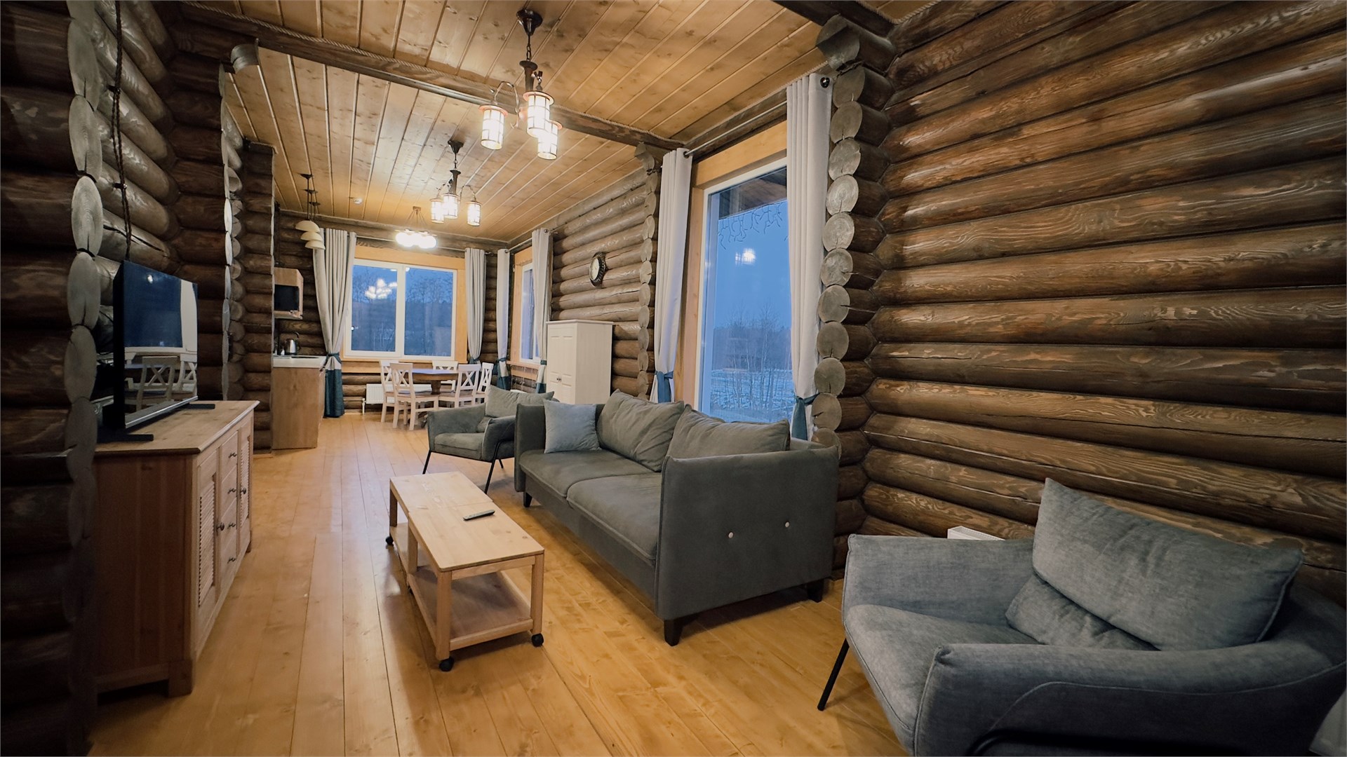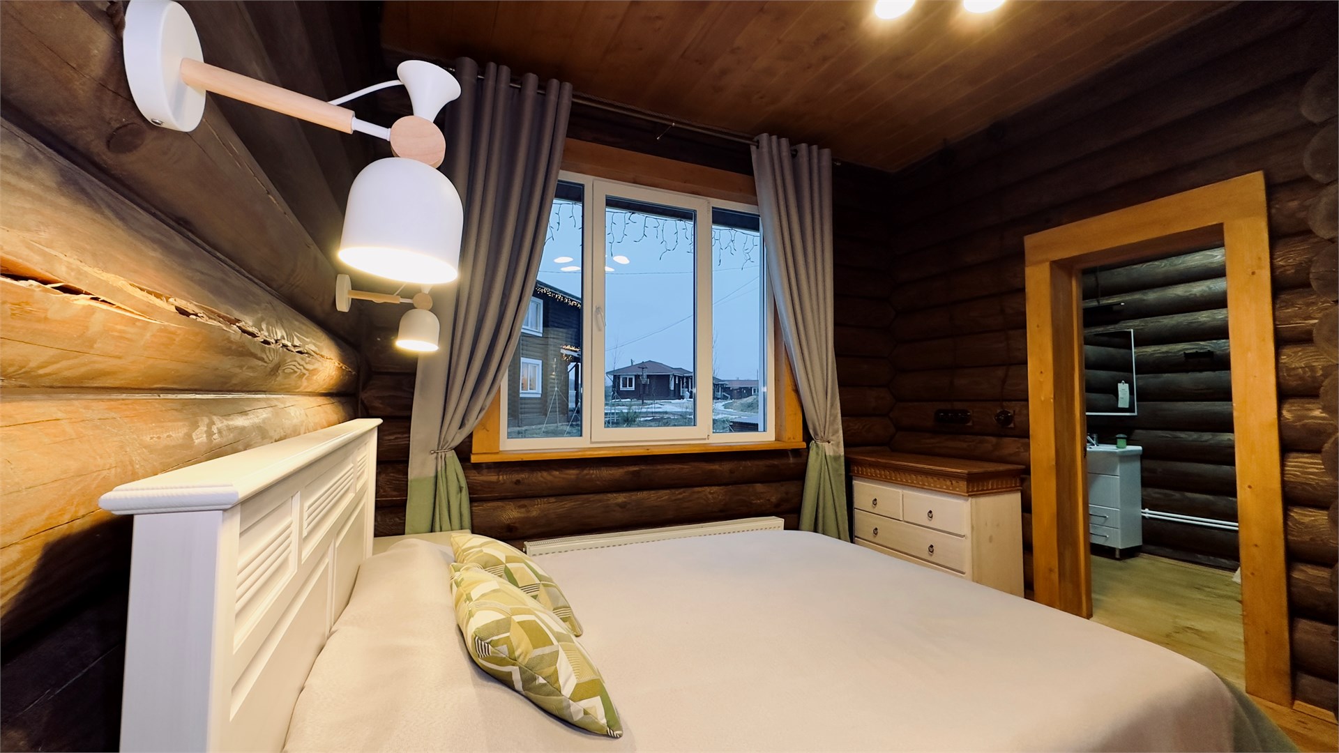 В номере: диван, зеркало, кровати односпальные, кровать двуспальная, прикроватные тумбочки, стол, стулья, шкаф, камин, микроволновая печь, набор посуды, плита электрическая, стиральная машина, телевизор ЖК, холодильник, чайный набор посуды, электрочайник
