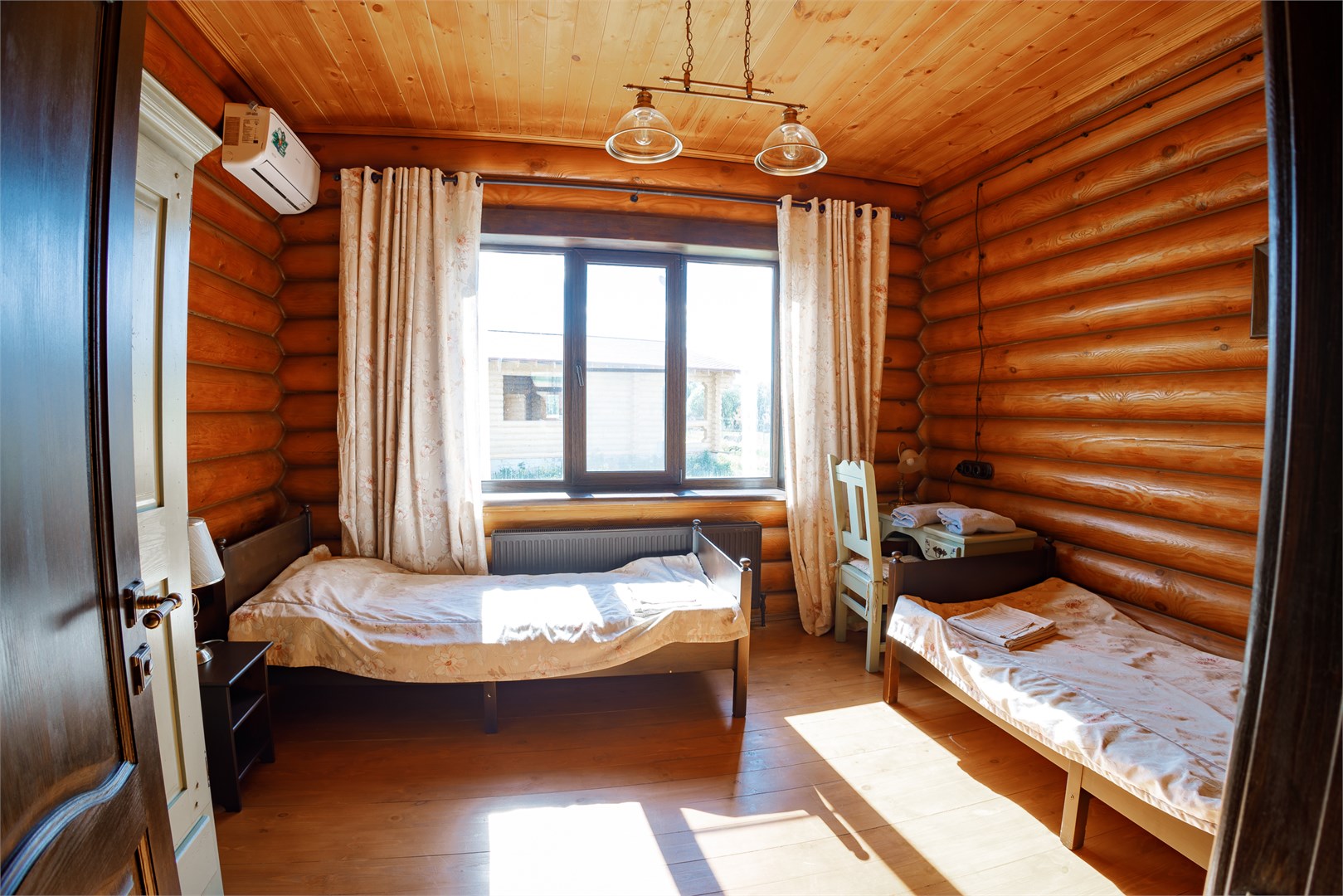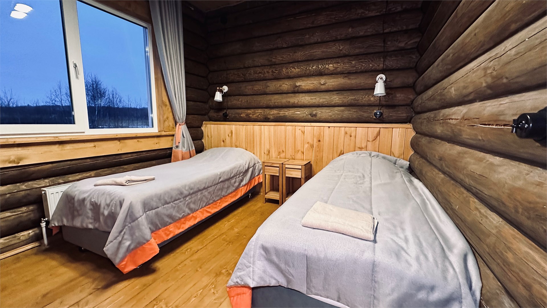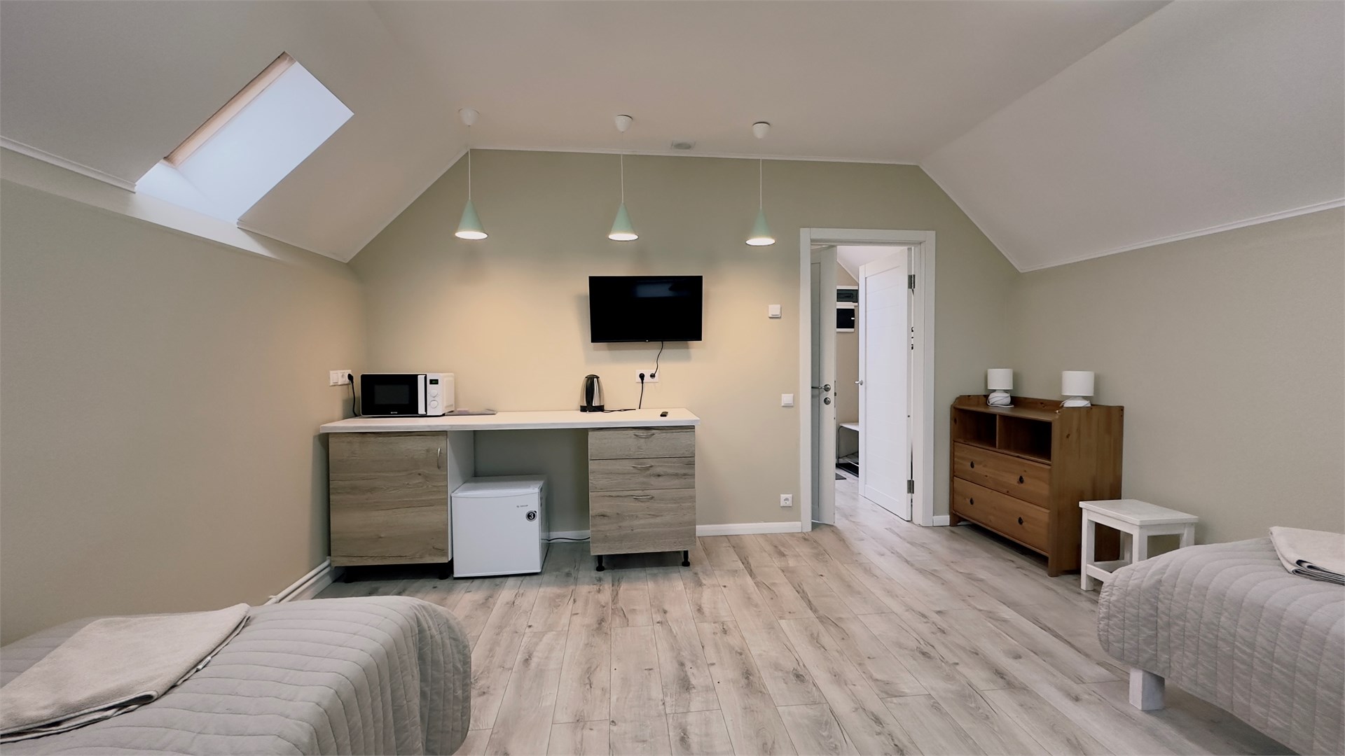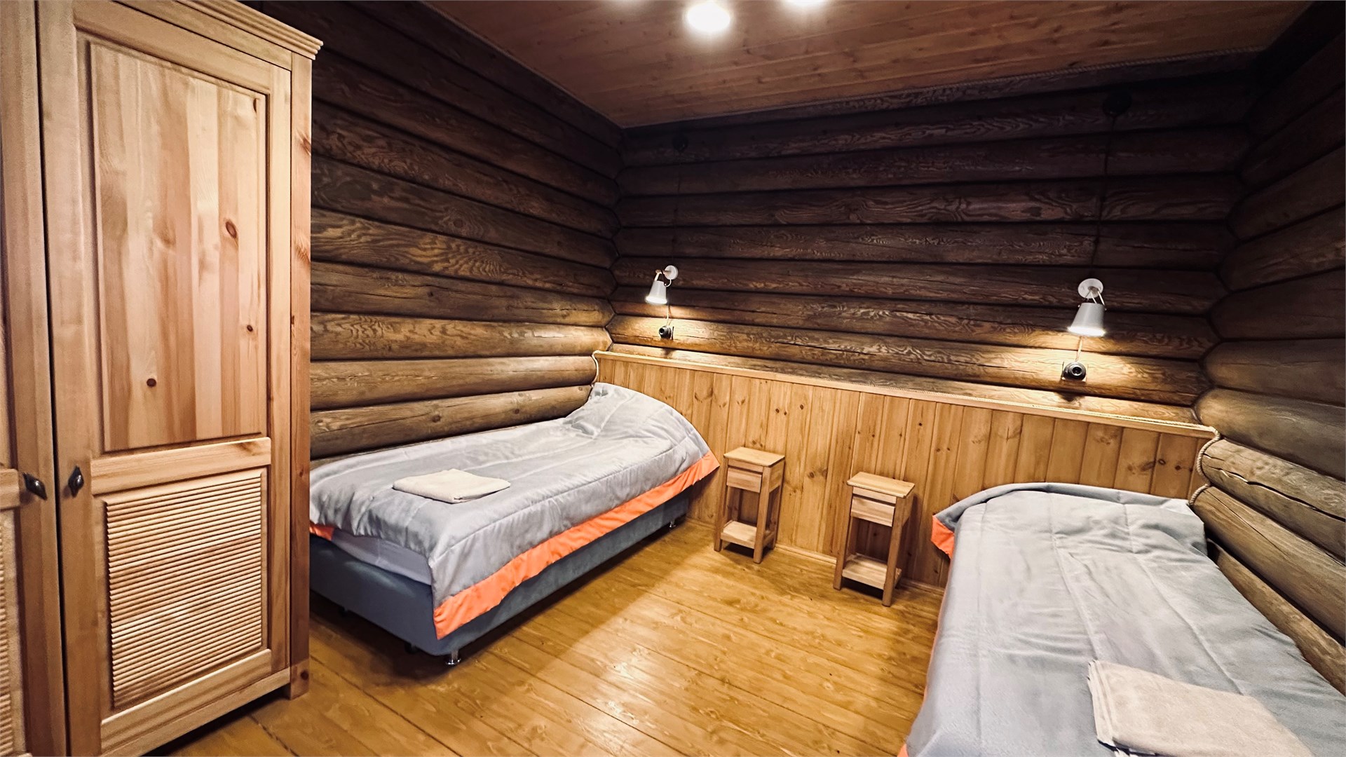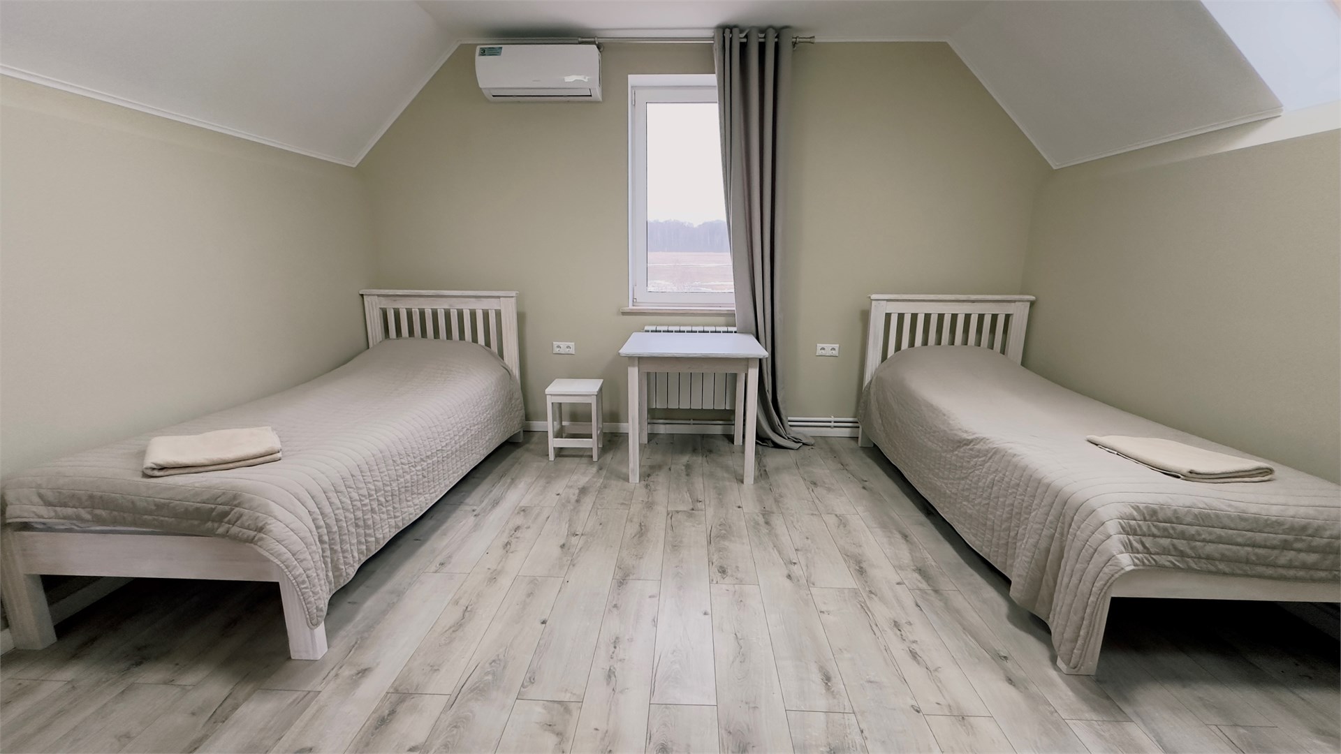 В номере: вешалка, зеркало, кровати односпальные, прикроватные тумбочки, стол, стулья, шкаф, микроволновая печь, мини-холодильник, телевизор ЖК, чайный набор посуды, электрочайник