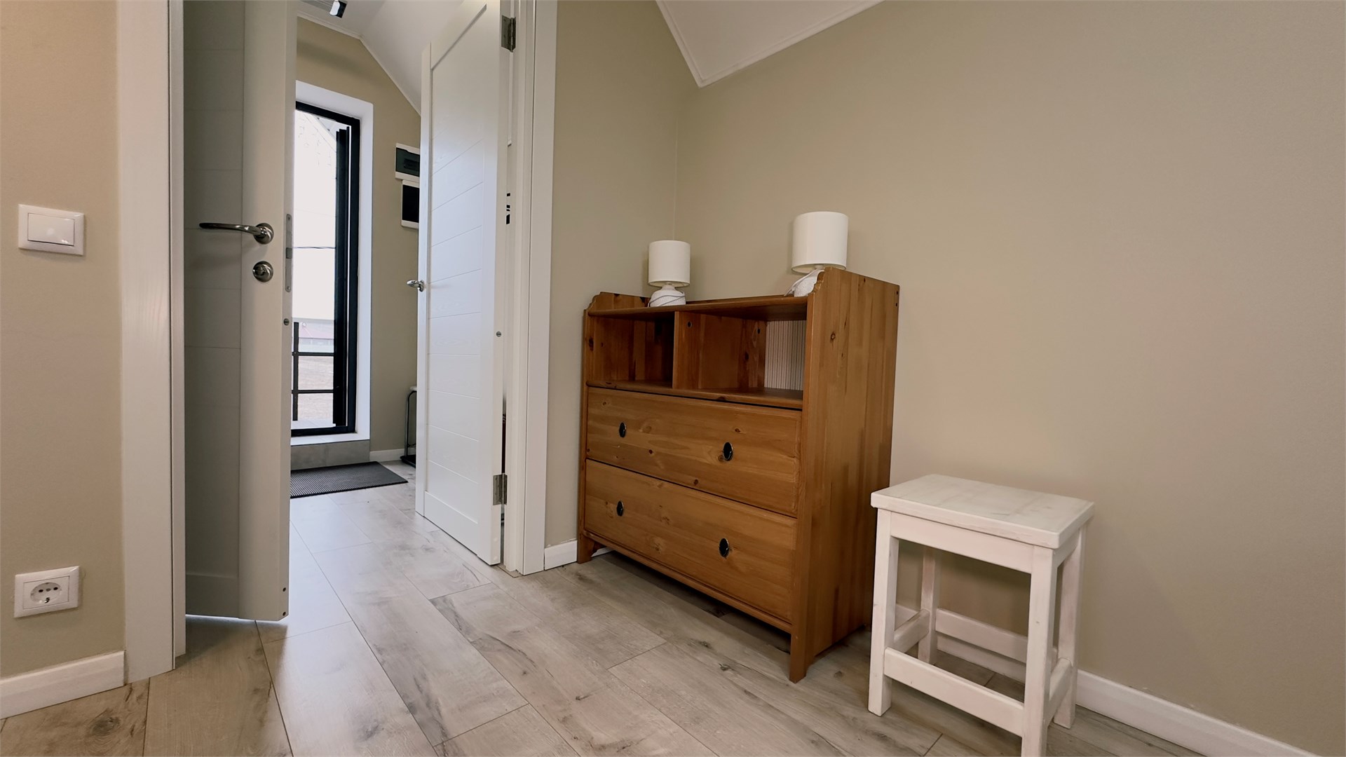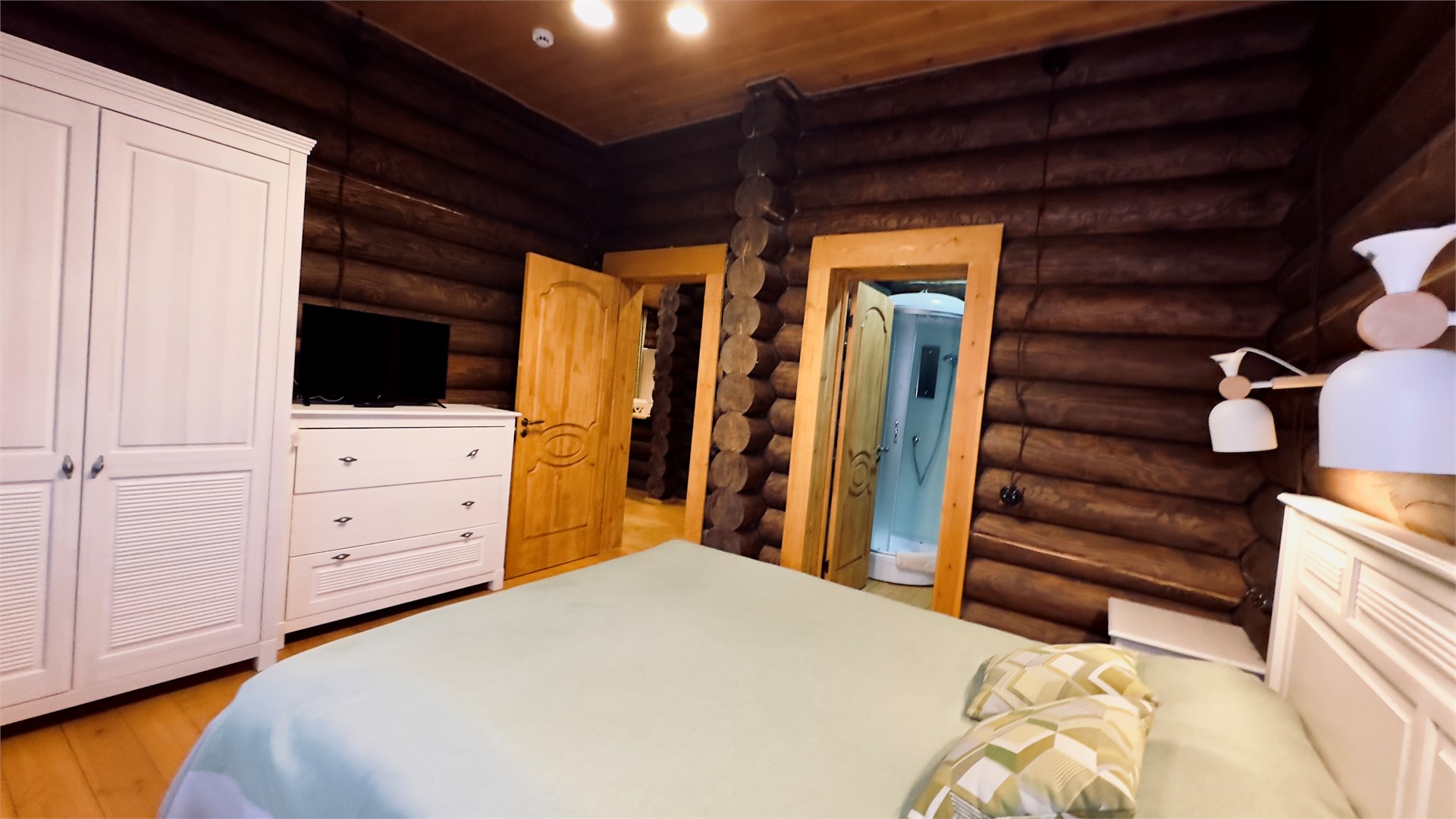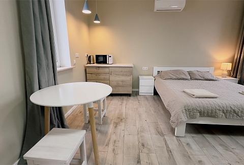 В номере: диван, зеркало, кровать двуспальная, прикроватные тумбочки, стол, стулья, шкаф, микроволновая печь, набор посуды, стиральная машина, телевизор ЖК, холодильник, чайный набор посуды, электрочайник