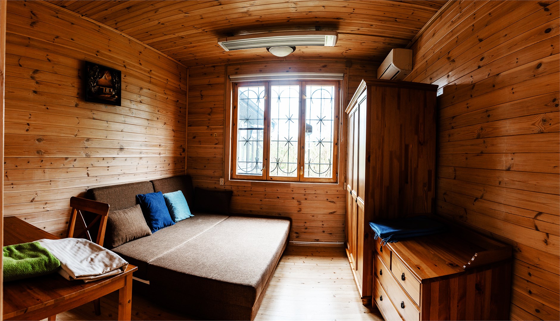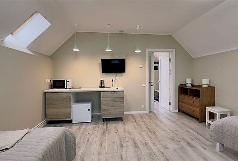 В номере: диван, зеркало, кровати односпальные, кровать двуспальная, прикроватные тумбочки, стол, стулья, шкаф, микроволновая печь, набор посуды, плита электрическая, стиральная машина, телевизор ЖК, холодильник, чайный набор посуды, электрочайник