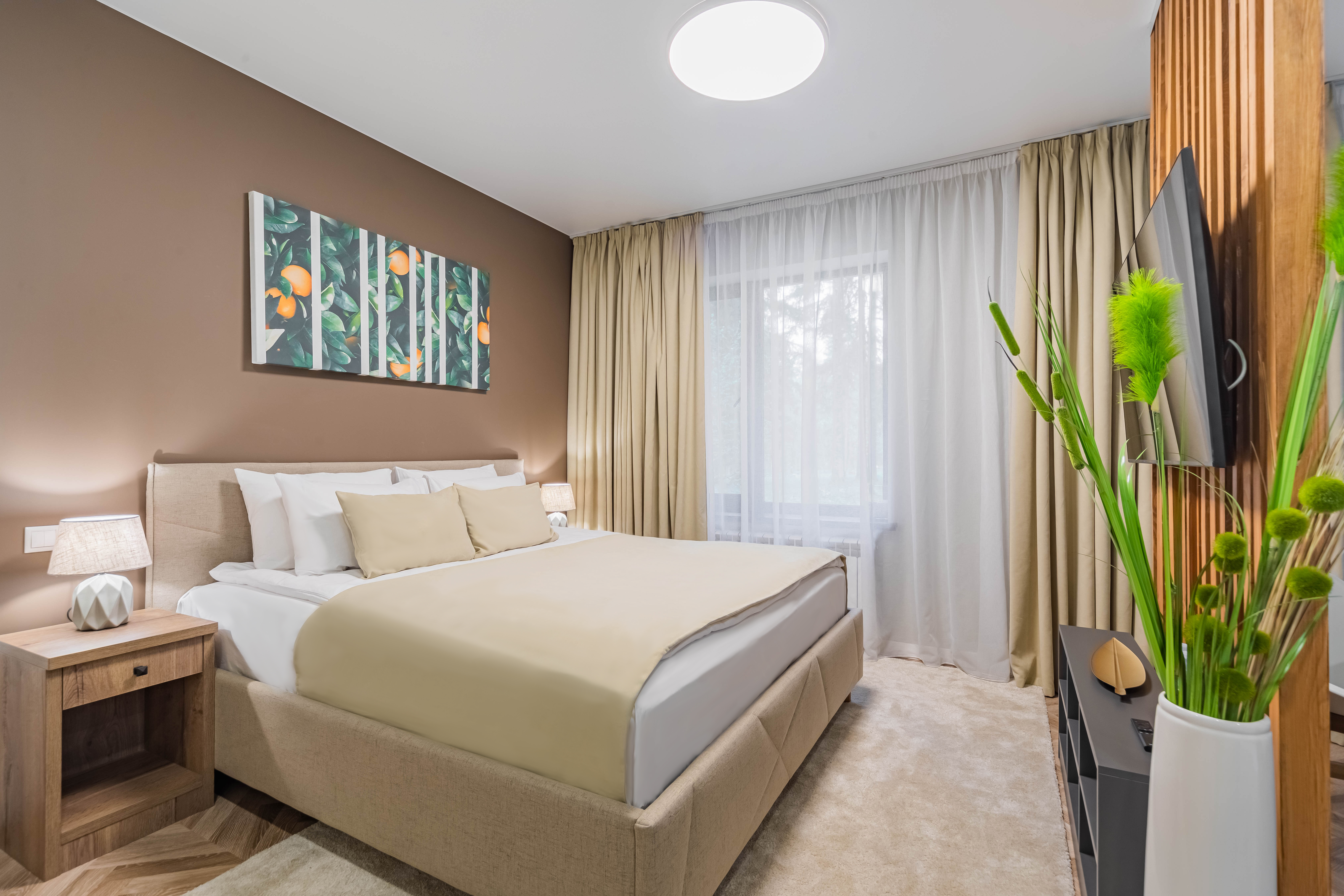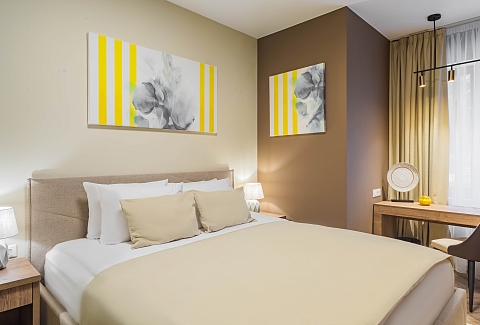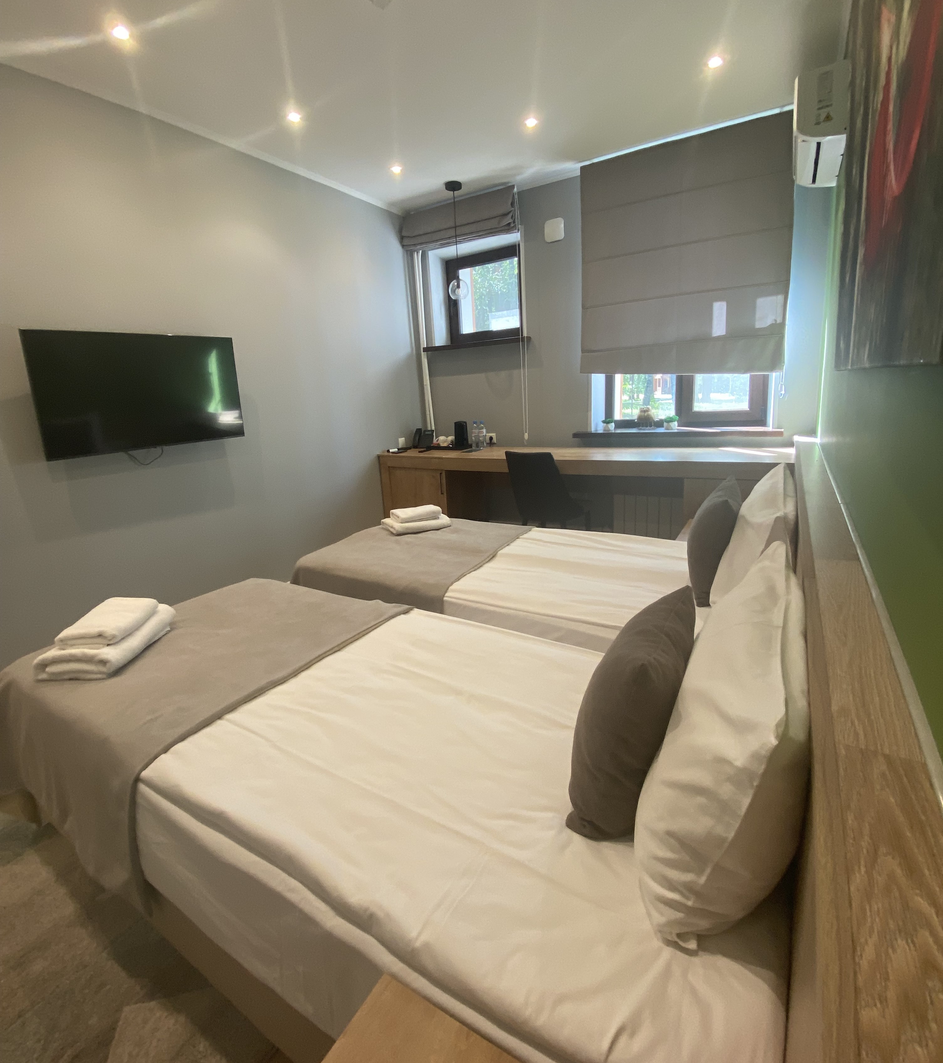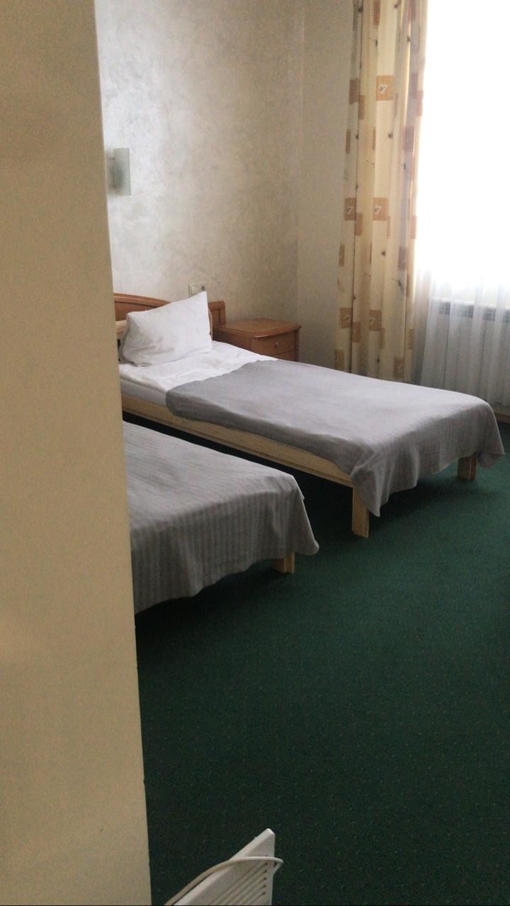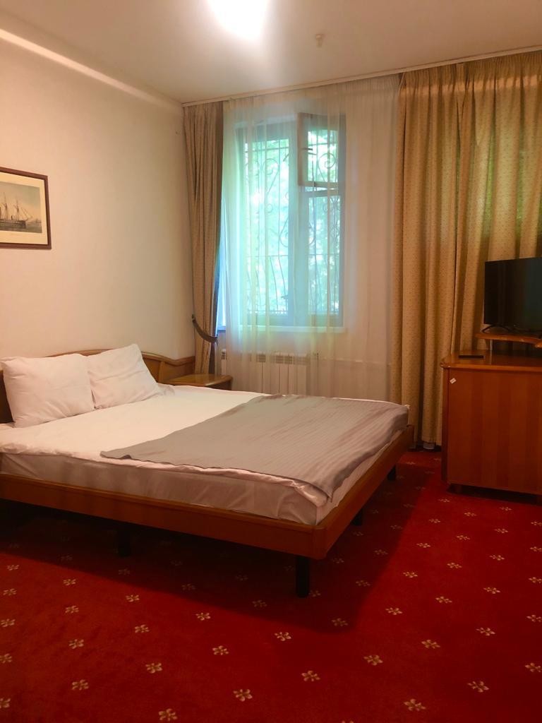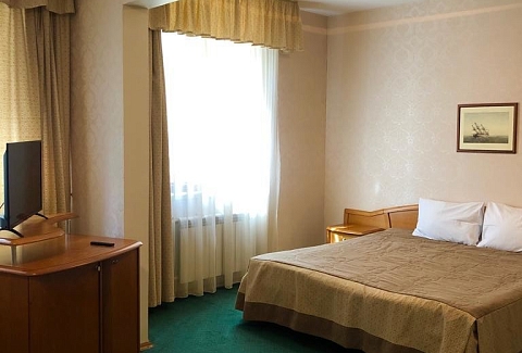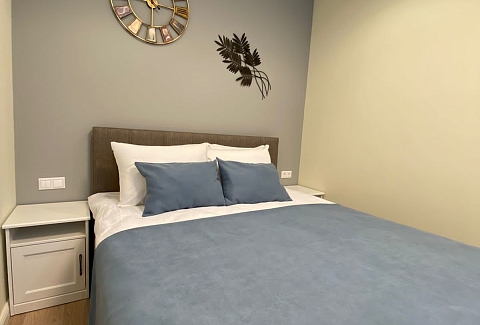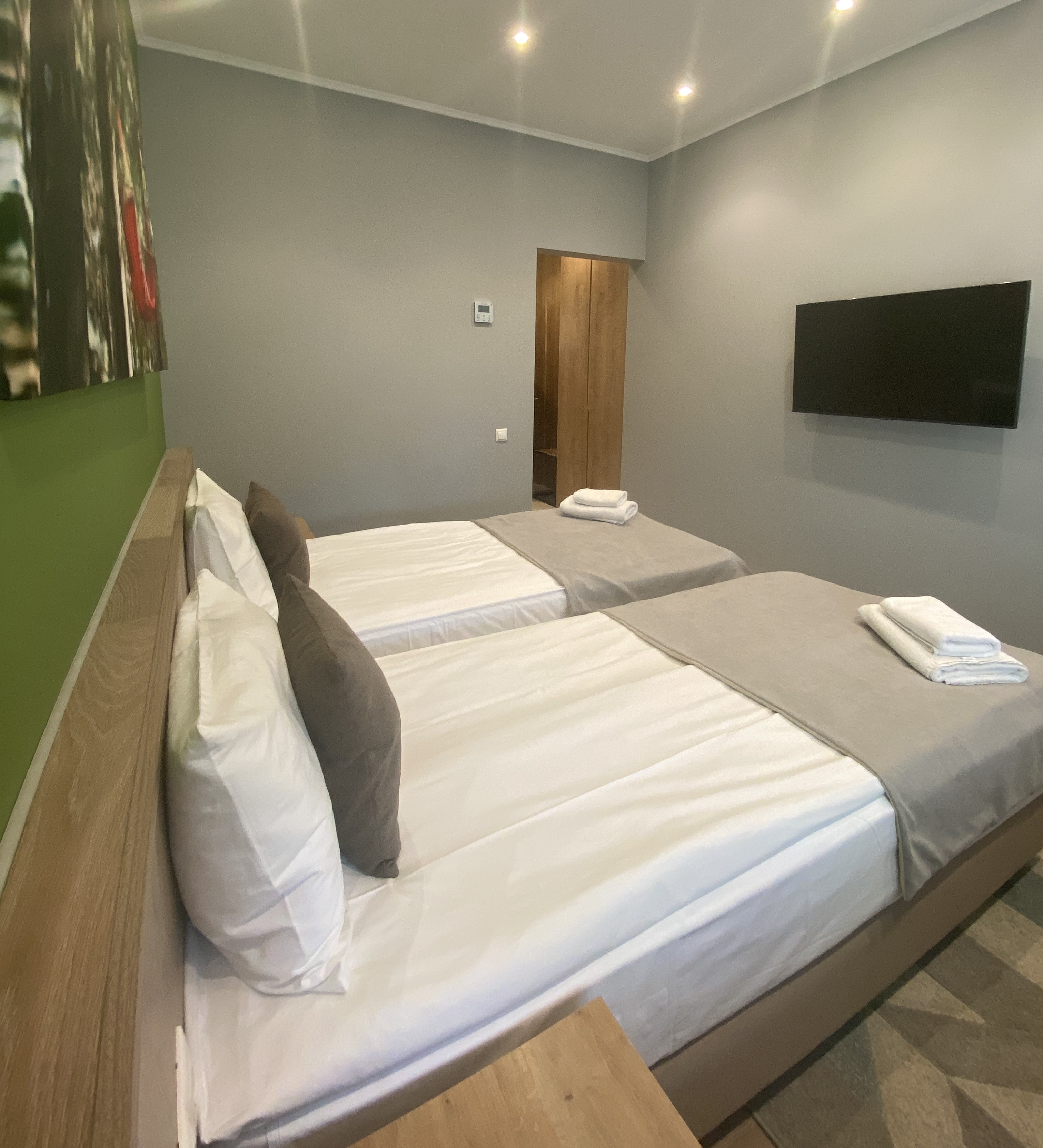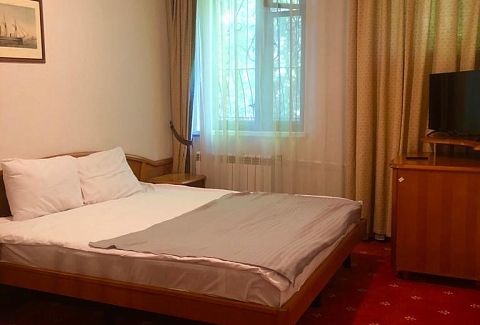 В номере: зеркало, кровать двуспальная, прикроватные тумбочки, тумба под телевизор, шкаф, телевизор ЖК, холодильник, электрочайник