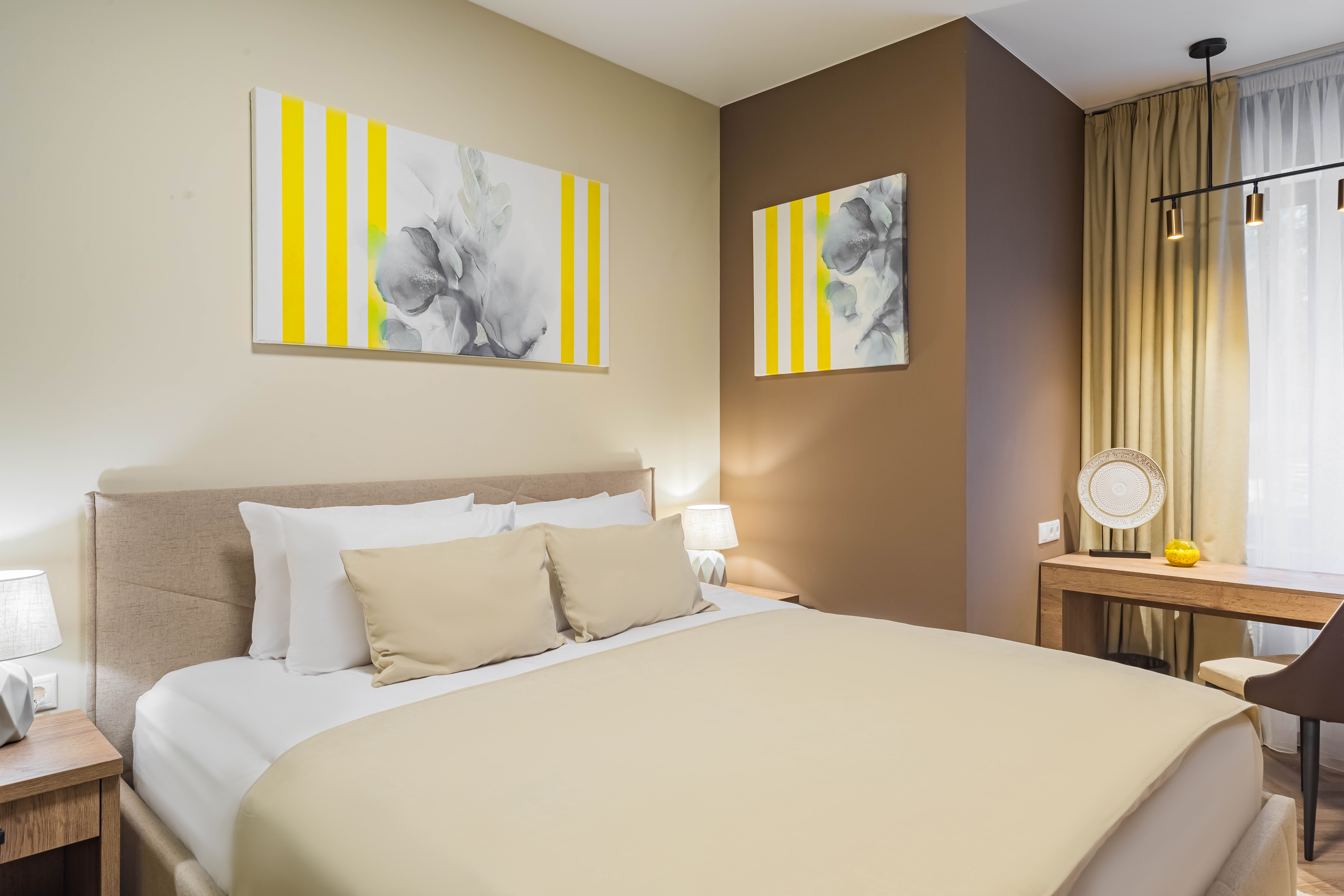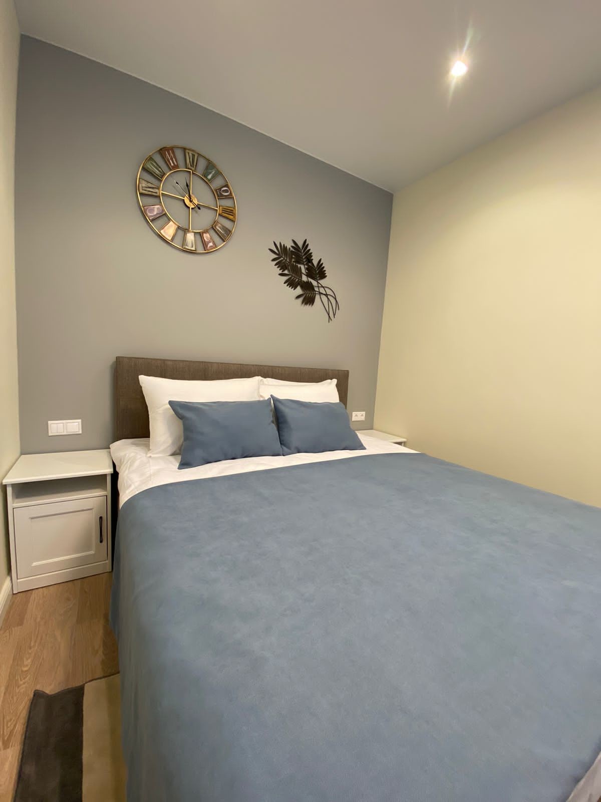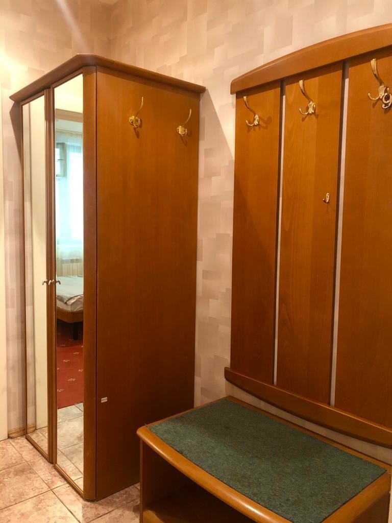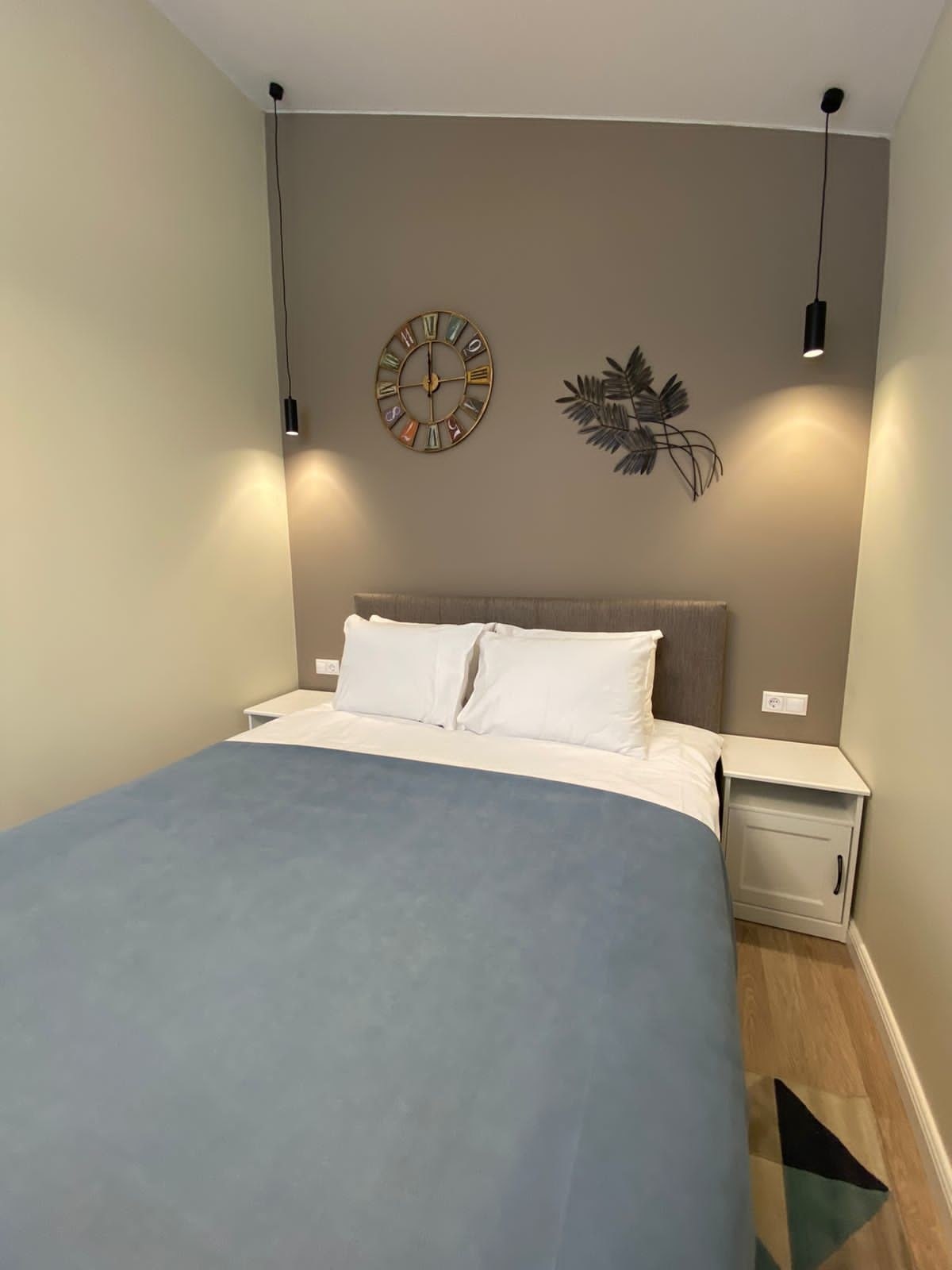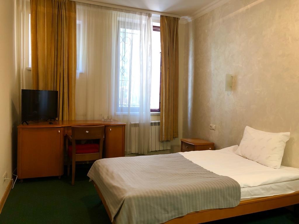 В номере: зеркало, кровать двуспальная, прикроватные тумбочки, тумба под телевизор, шкаф, телевизор ЖК, холодильник, электрочайник