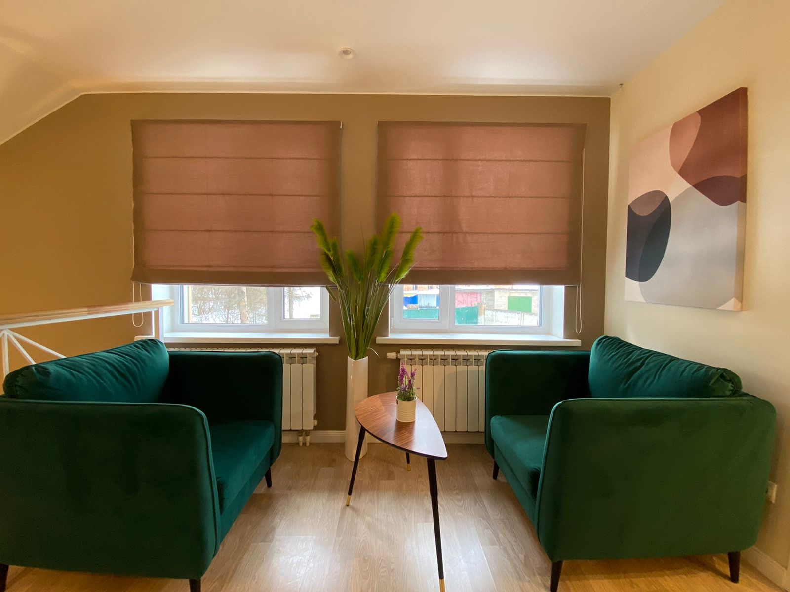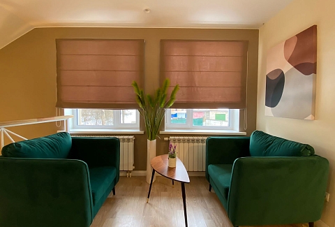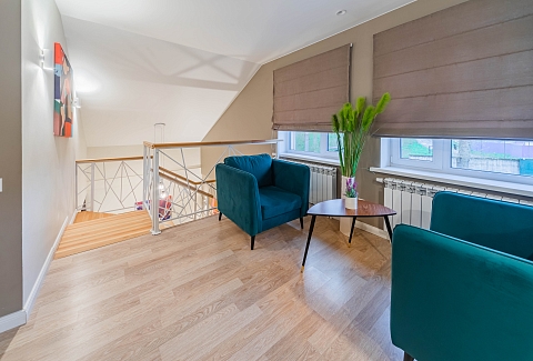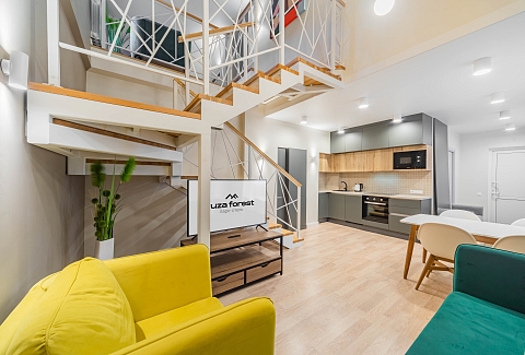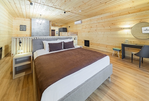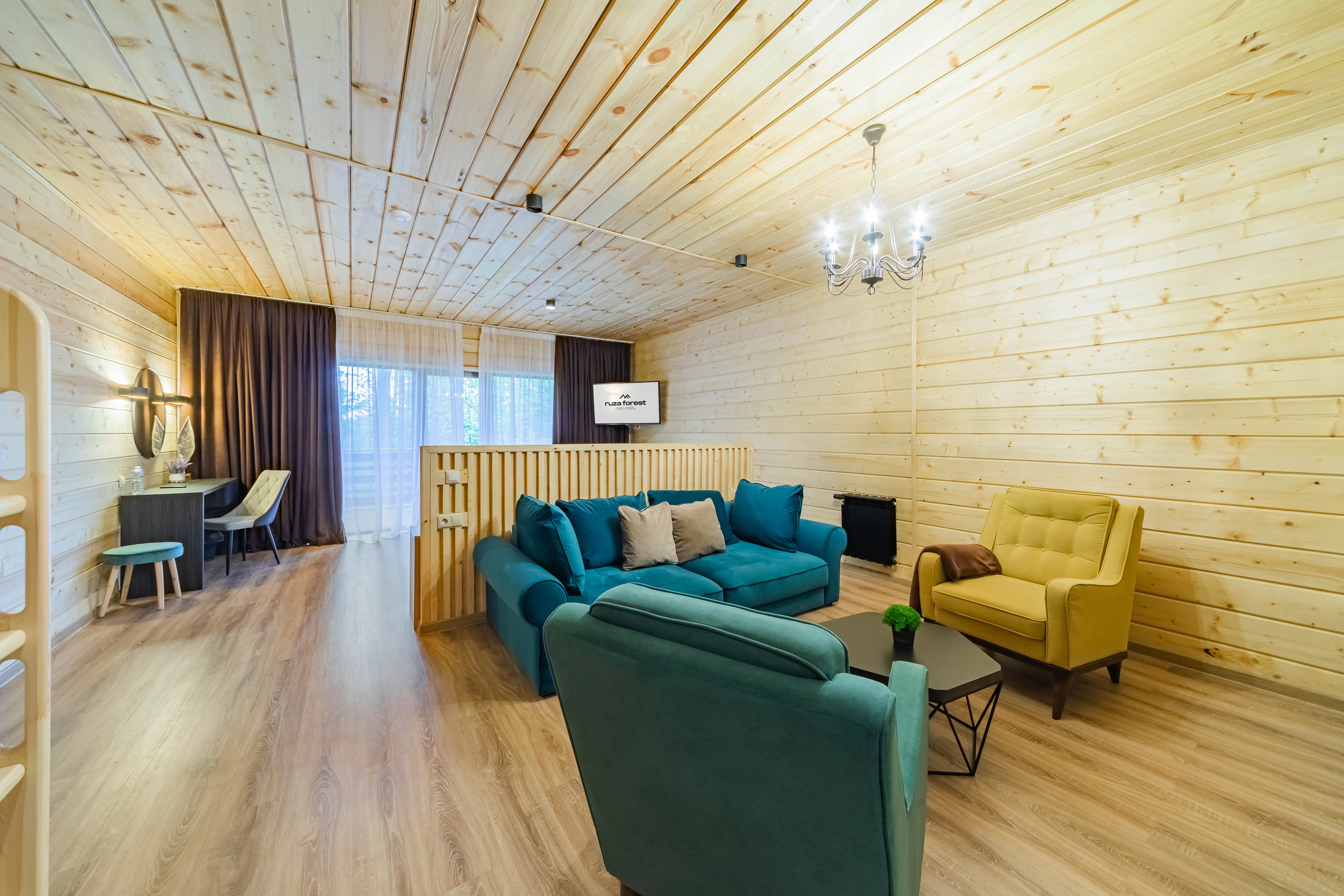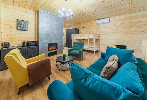 В номере: вешалка, диван раскладной, зеркало, кресла, кровать двуспальная, кровать двухъярусная, набор мягкой мебели, стол, столик журнальный, стулья, тумба, шкаф, камин, кондиционер, кофемашина, микроволновая печь, мини-холодильник, набор посуды, телевизор ЖК