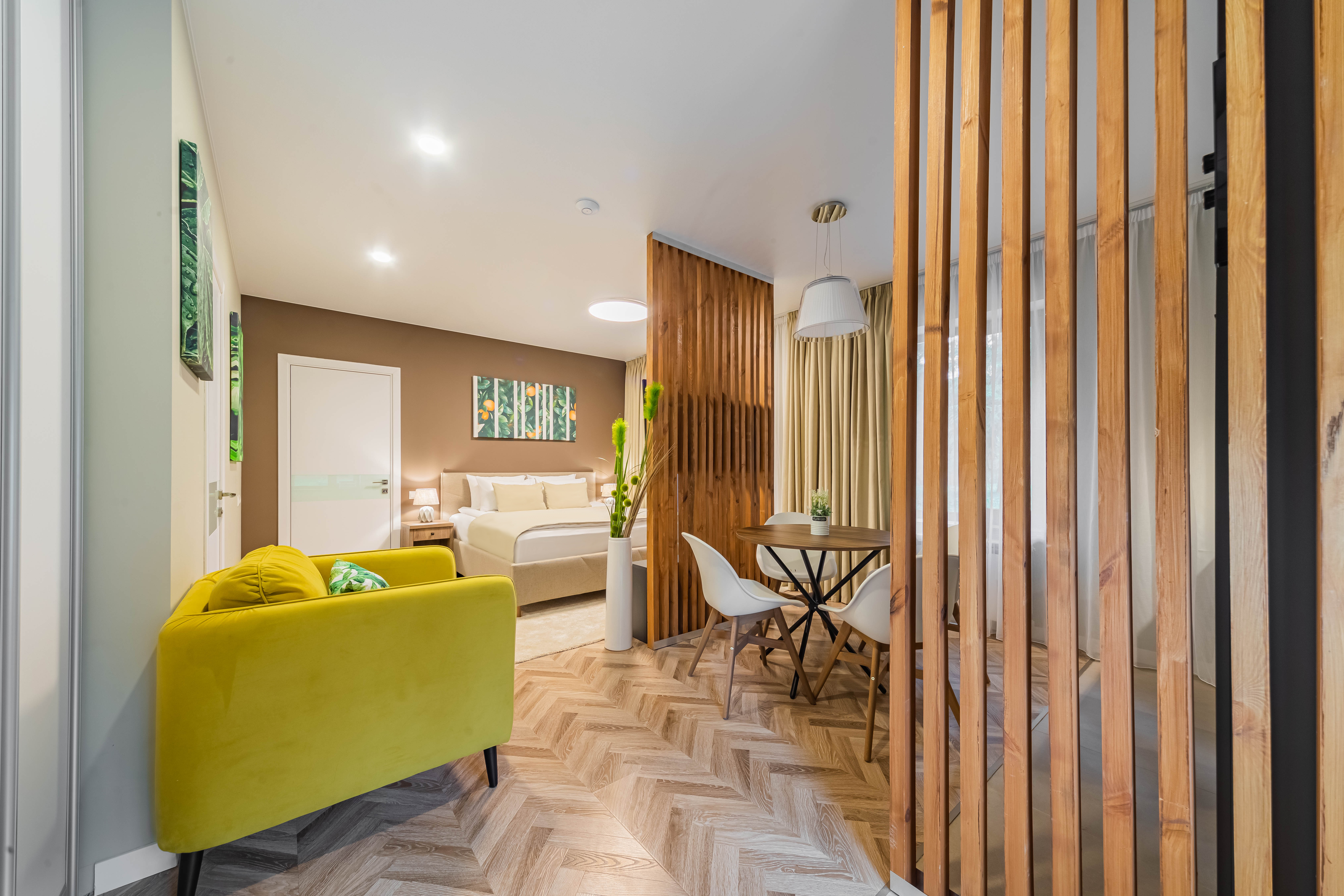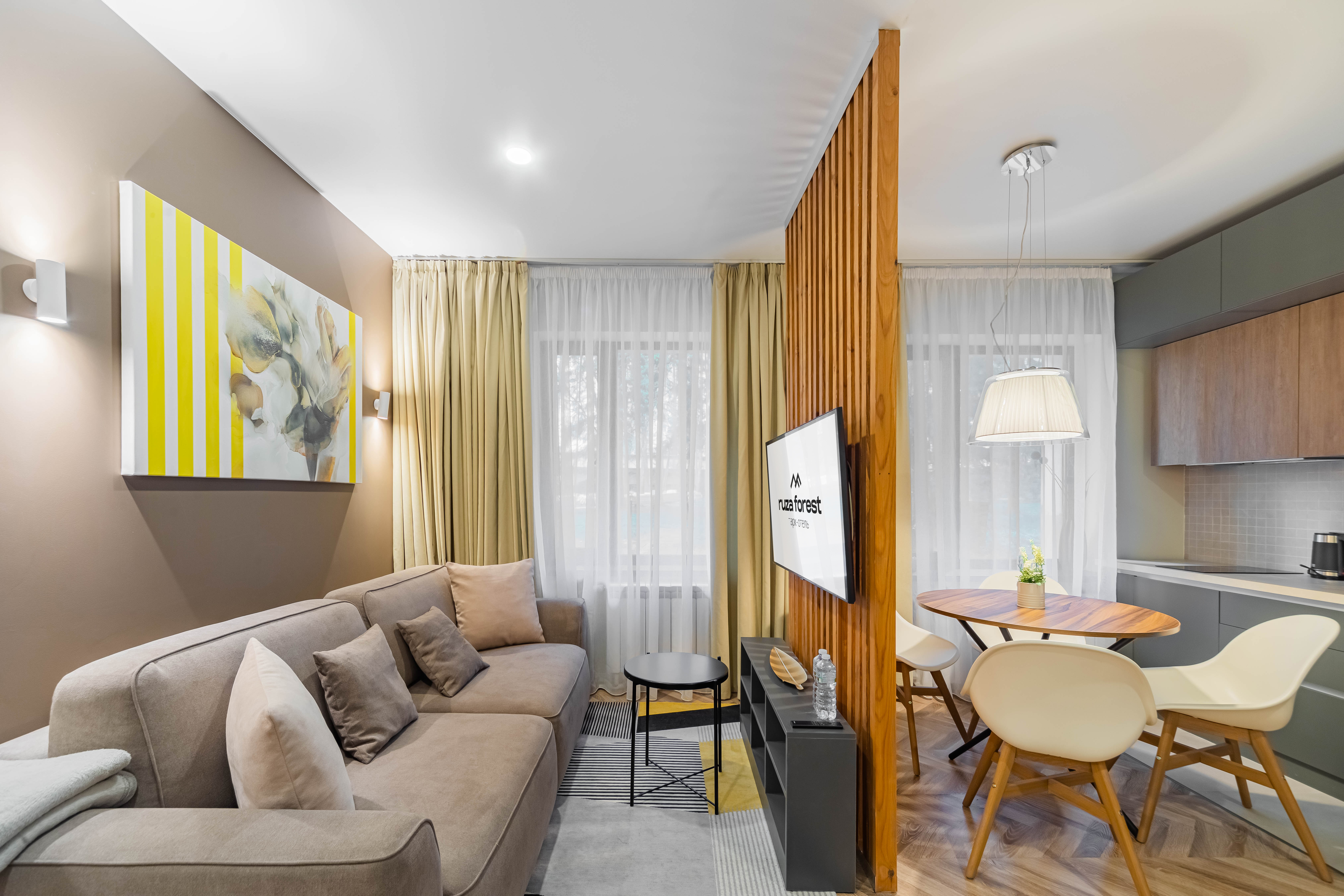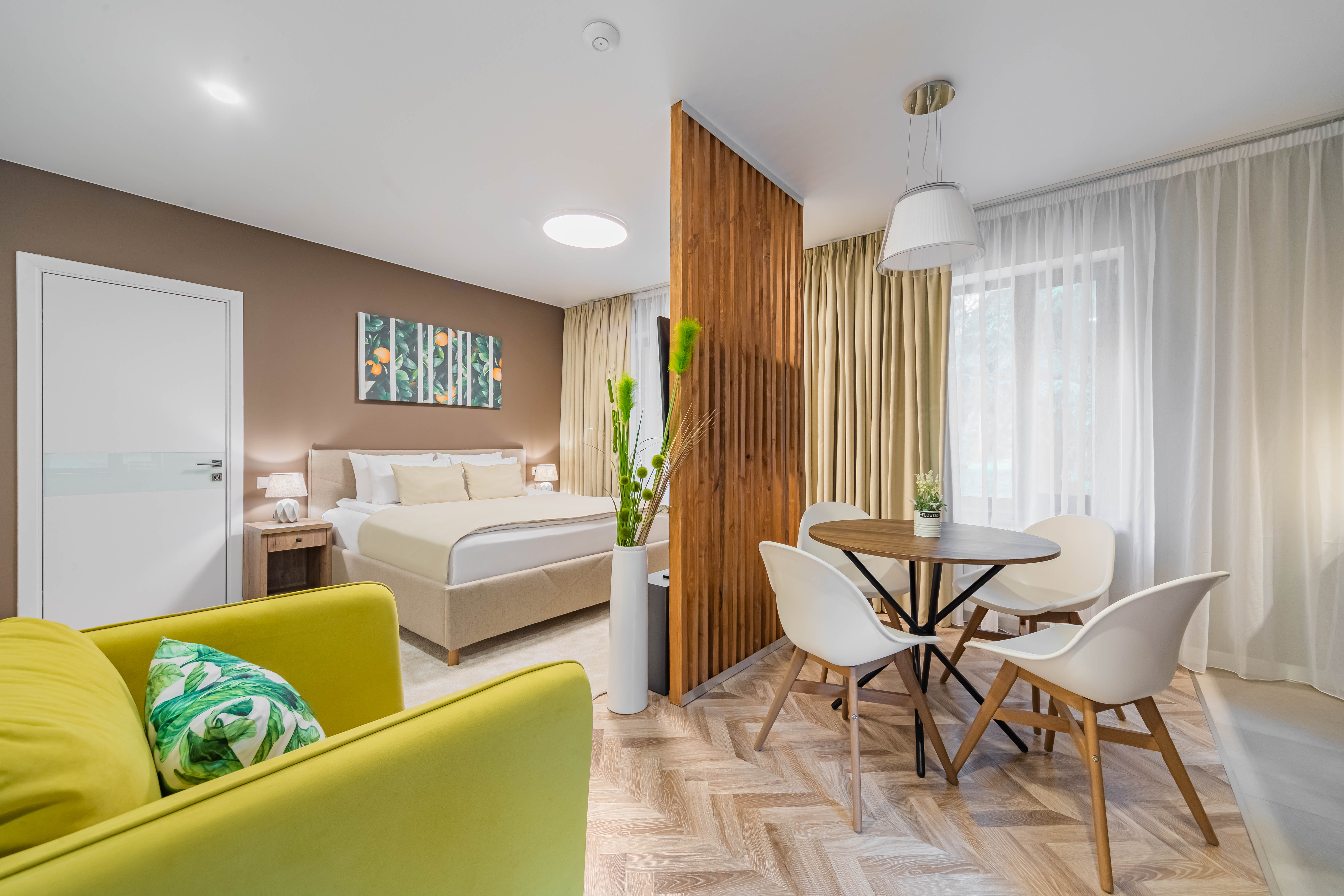 В номере: вешалка, диван раскладной, зеркало, кресла, кровать двуспальная, кухонная мебель, набор мягкой мебели, прикроватные тумбочки, стол, столик туалетный, стулья, шкаф, кондиционер, микроволновая печь, набор посуды, плита электрическая, телевизор ЖК, холодильник