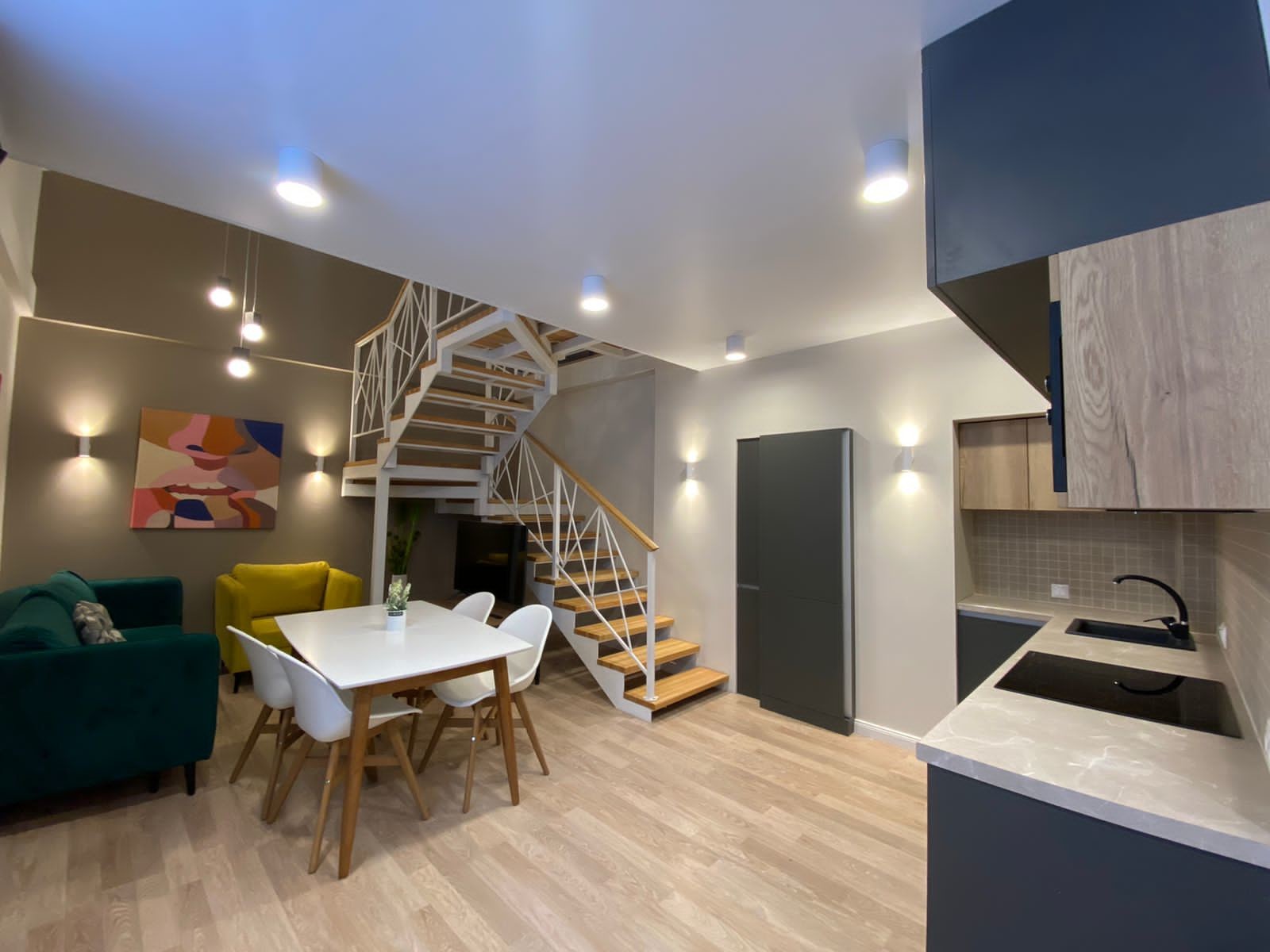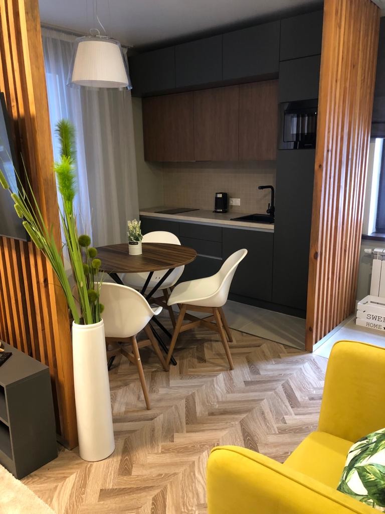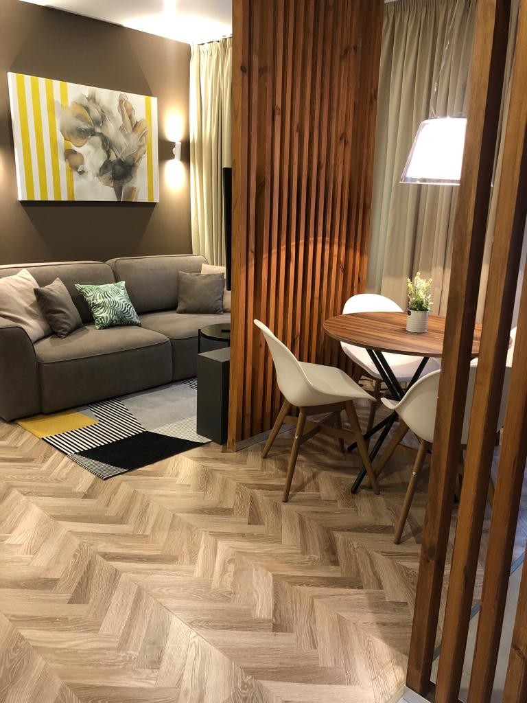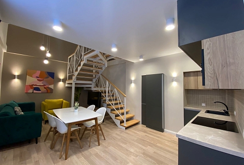 В номере: вешалка, диван раскладной, зеркало, кресла, кровать двуспальная, кухонная мебель, набор мягкой мебели, прикроватные тумбочки, стол, столик туалетный, стулья, шкаф, кондиционер, микроволновая печь, набор посуды, плита электрическая, телевизор ЖК, холодильник
