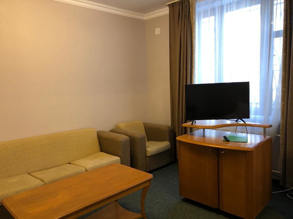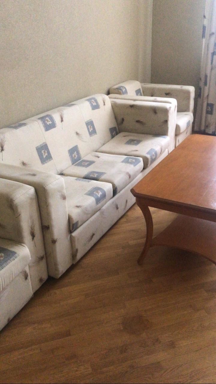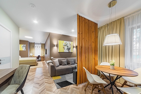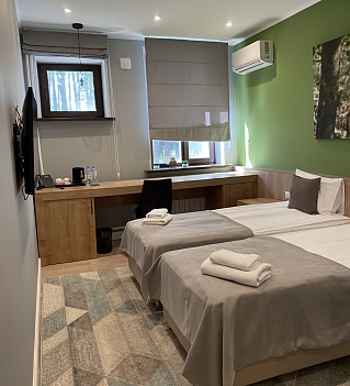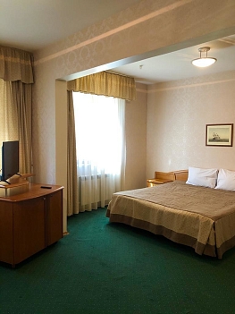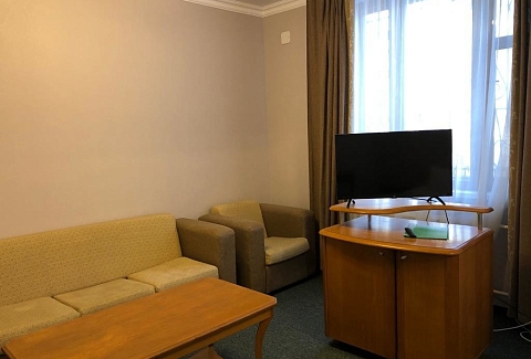 В номере: вешалка, диван, зеркало, кровать двуспальная, кровать односпальная, прикроватные тумбочки, столик туалетный, стулья, тумба под телевизор, шкаф, телевизор ЖК, холодильник, электрочайник