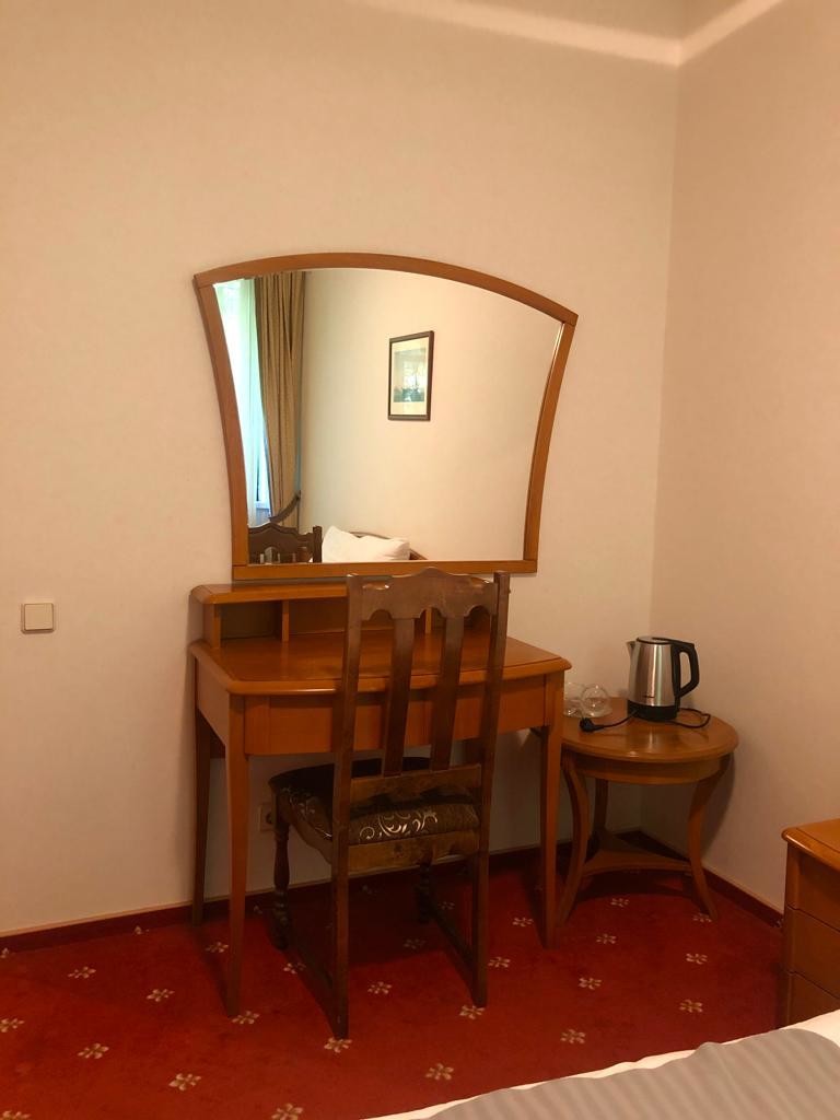 В номере: вешалка, зеркало, кровать двуспальная, прикроватные тумбочки, стол, стулья, шкаф, телевизор ЖК, электрочайник