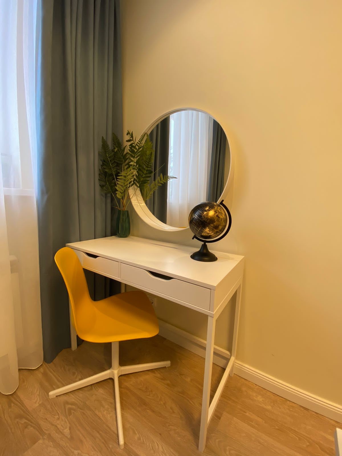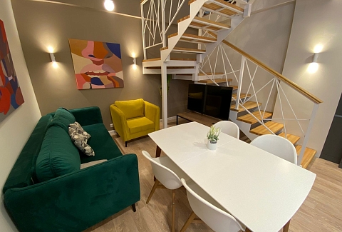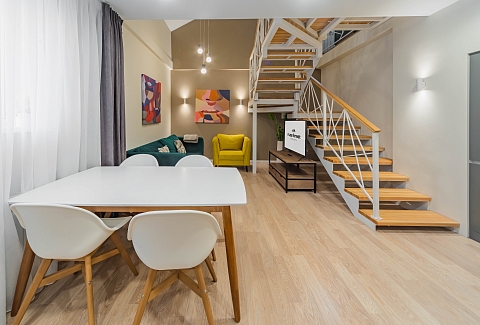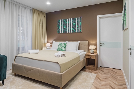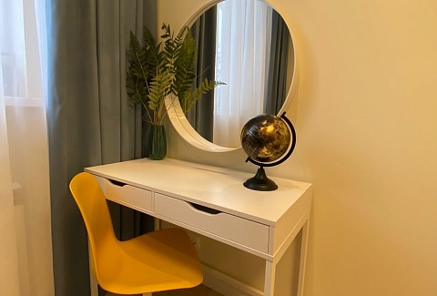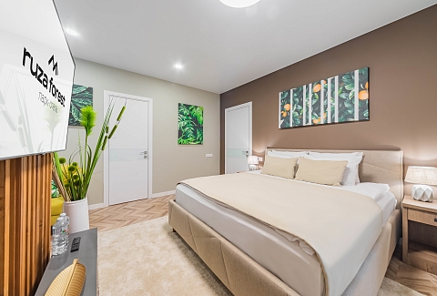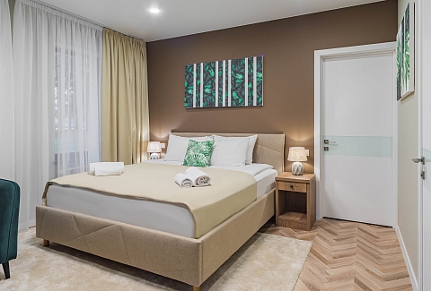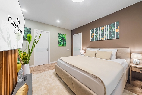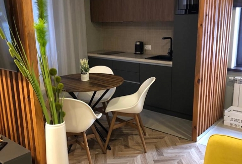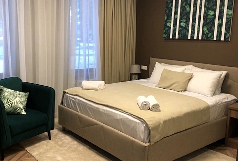 В номере: вешалка, зеркало, кровать двуспальная, кухонная мебель, прикроватные тумбочки, стол, столик журнальный, стулья, шкаф, духовой шкаф, кондиционер, микроволновая печь, набор посуды, плита электрическая, телевизор ЖК, холодильник, электрочайник