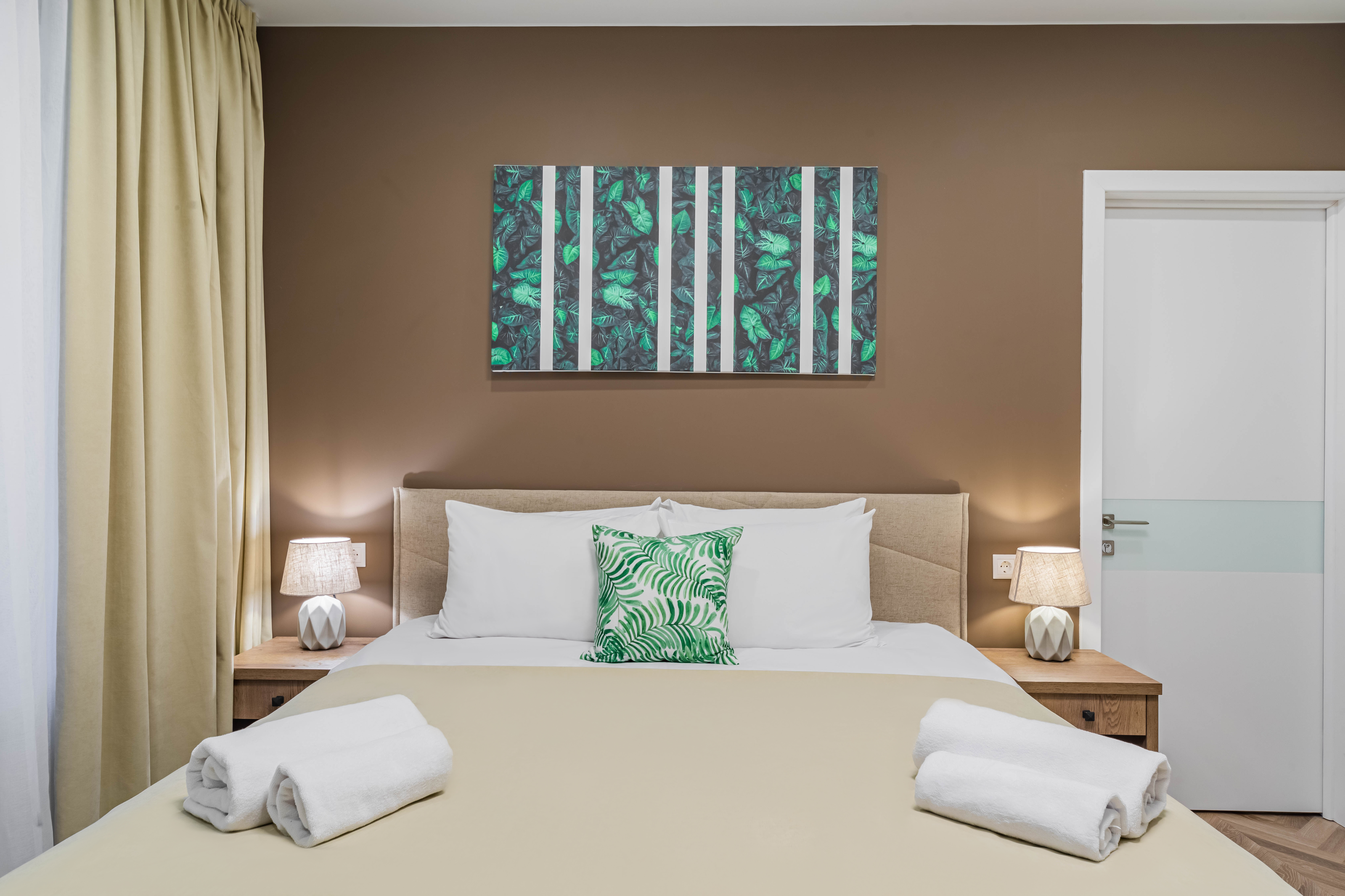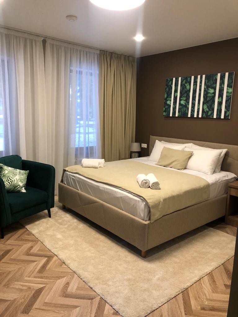 В номере: вешалка, диван раскладной, зеркало, кресла, кровать двуспальная, кухонная мебель, прикроватные тумбочки, стол, стулья, шкаф, кондиционер, микроволновая печь, набор посуды, плита электрическая, телевизор ЖК, холодильник, электрочайник