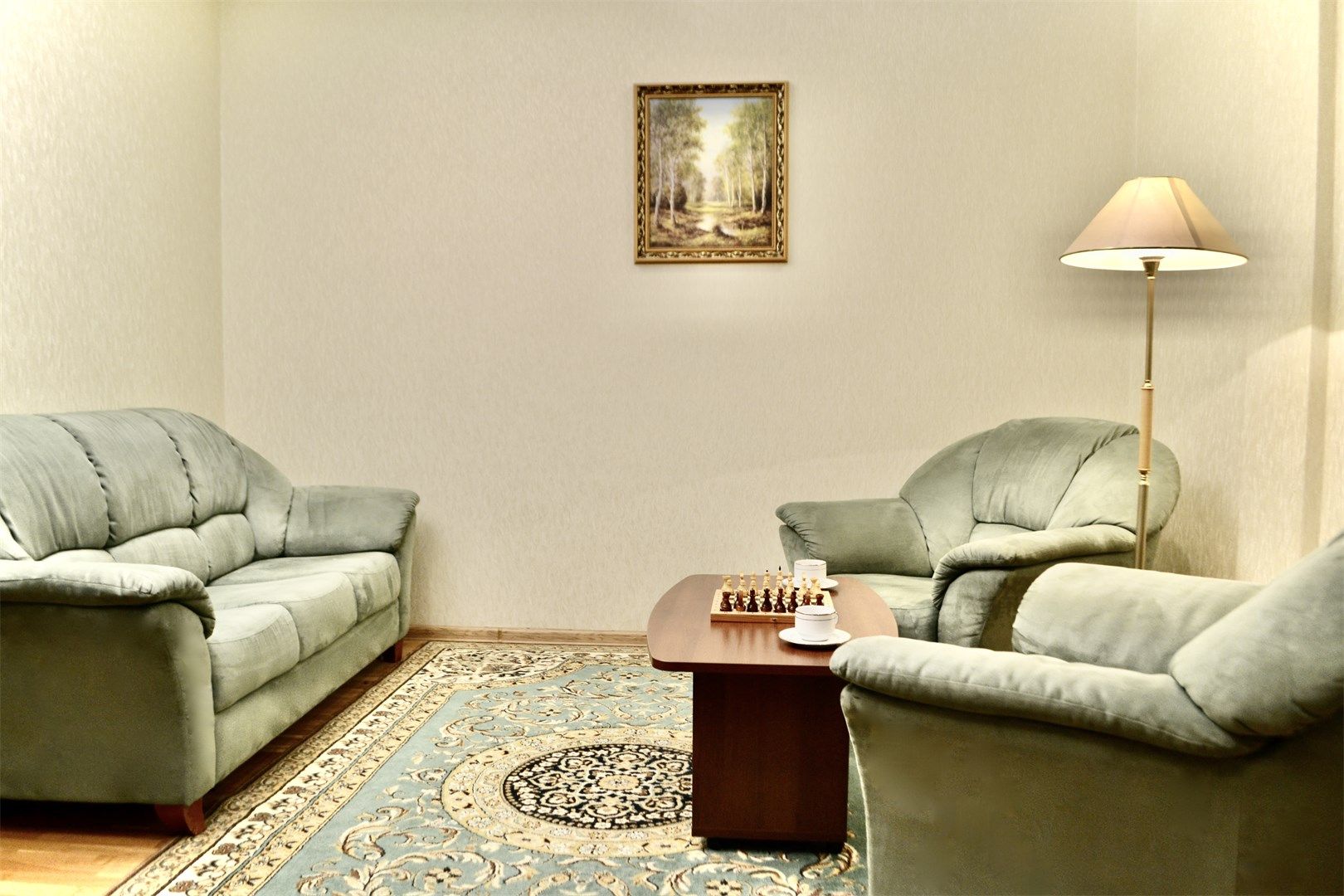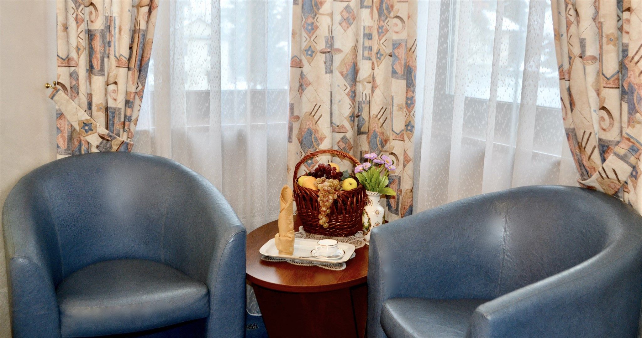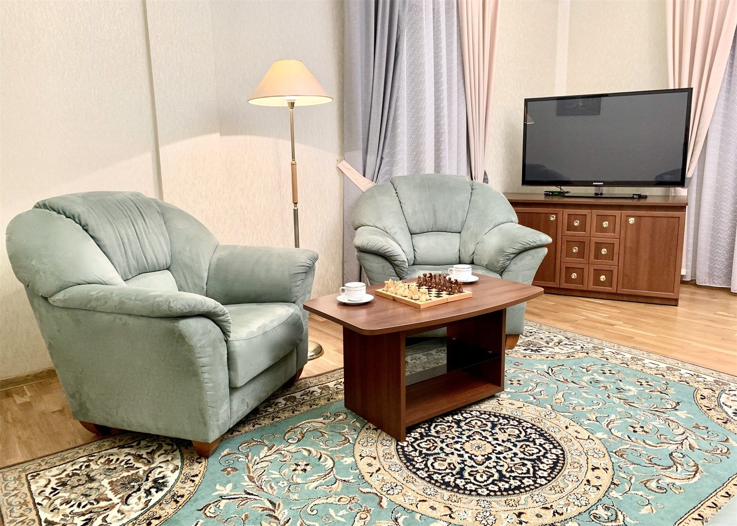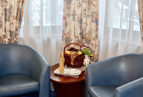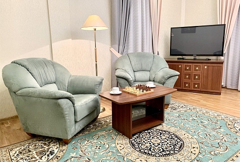 В номере: вешалка, диван, зеркало, кровать двуспальная, прикроватные тумбочки, стол, стулья, шкаф, кондиционер, микроволновая печь, мини-холодильник, набор посуды, сейф, телевизор, телефон