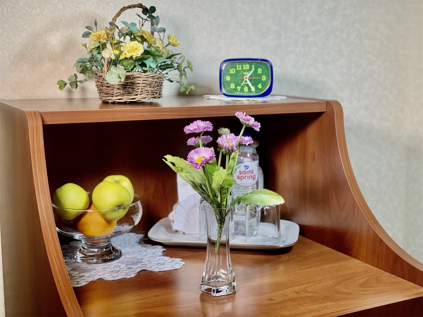 В номере: вешалка, диван, зеркало, кровать двуспальная, прикроватные тумбочки, стол, стулья, шкаф, микроволновая печь, набор посуды, плита электрическая, телевизор, телефон, холодильник, чайный набор посуды, электрочайник