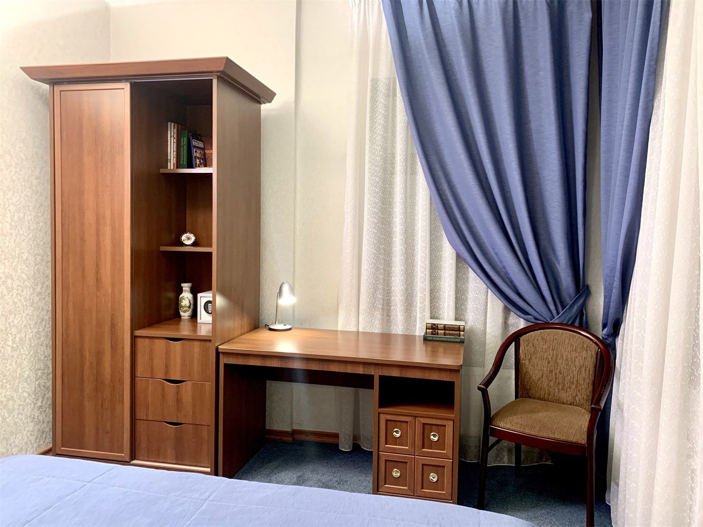 В номере: вешалка, зеркало, кровати односпальные, прикроватная тумбочка, стол, стул, шкаф, кондиционер, мини-холодильник, телевизор, телефон