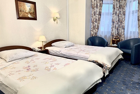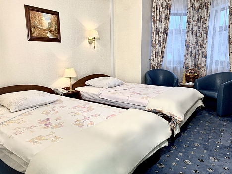 В номере: вешалка, зеркало, кровати односпальные, прикроватные тумбочки, стол, стулья, шкаф, кондиционер, мини-холодильник, телевизор, телефон