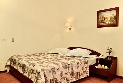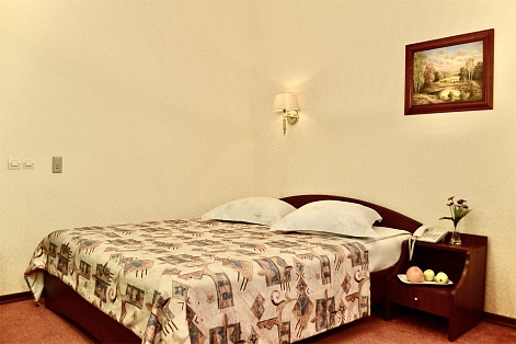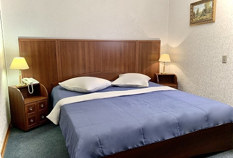 В номере: вешалка, диван, зеркало, кровать двуспальная, прикроватные тумбочки, стол, стулья, шкаф, кондиционер, мини-холодильник, телевизор, телефон