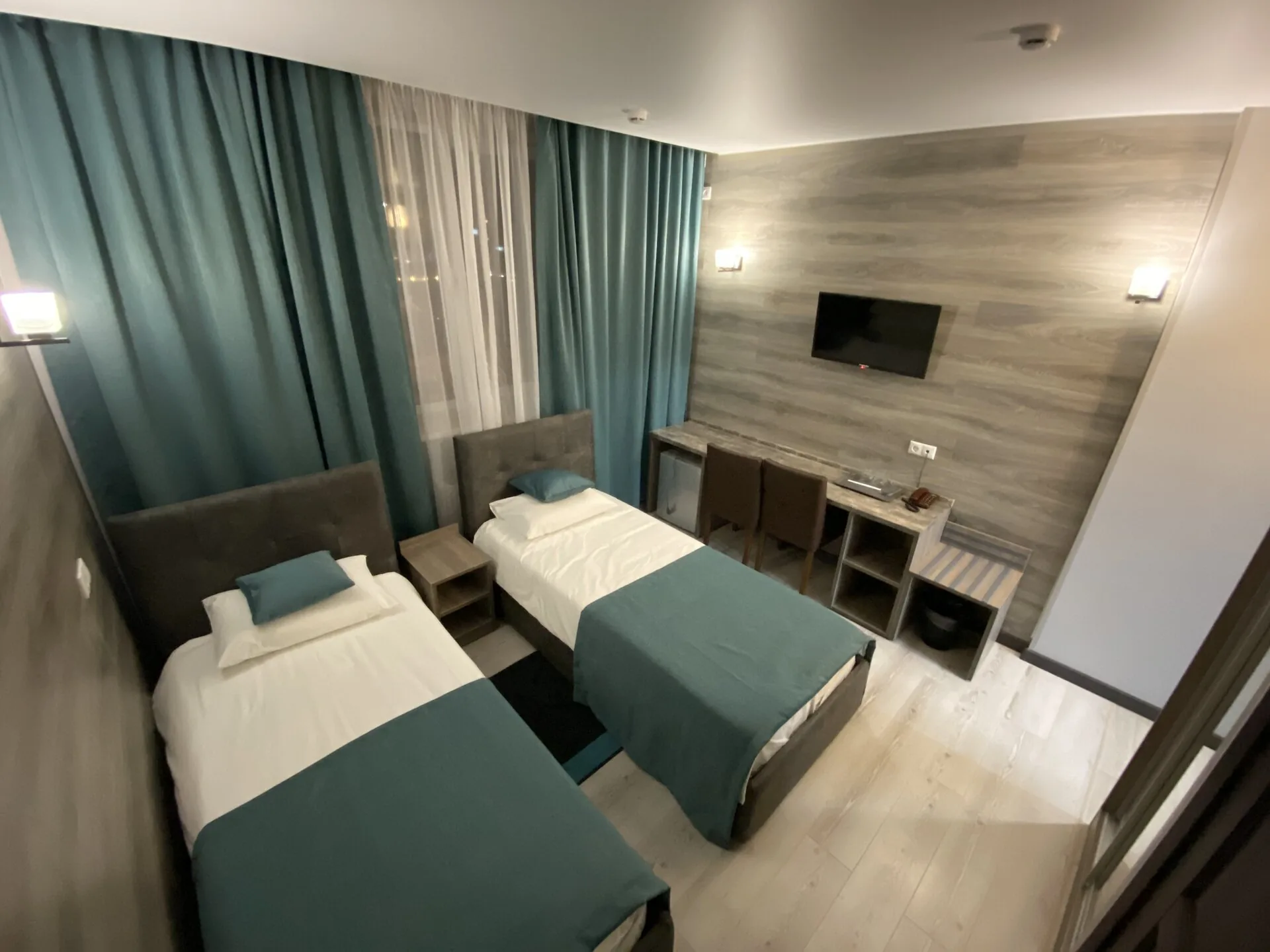 В номере: зеркало, кровати односпальные, прикроватные тумбочки, стол, стул, шкаф, кондиционер, мини-холодильник, телевизор ЖК, электрочайник