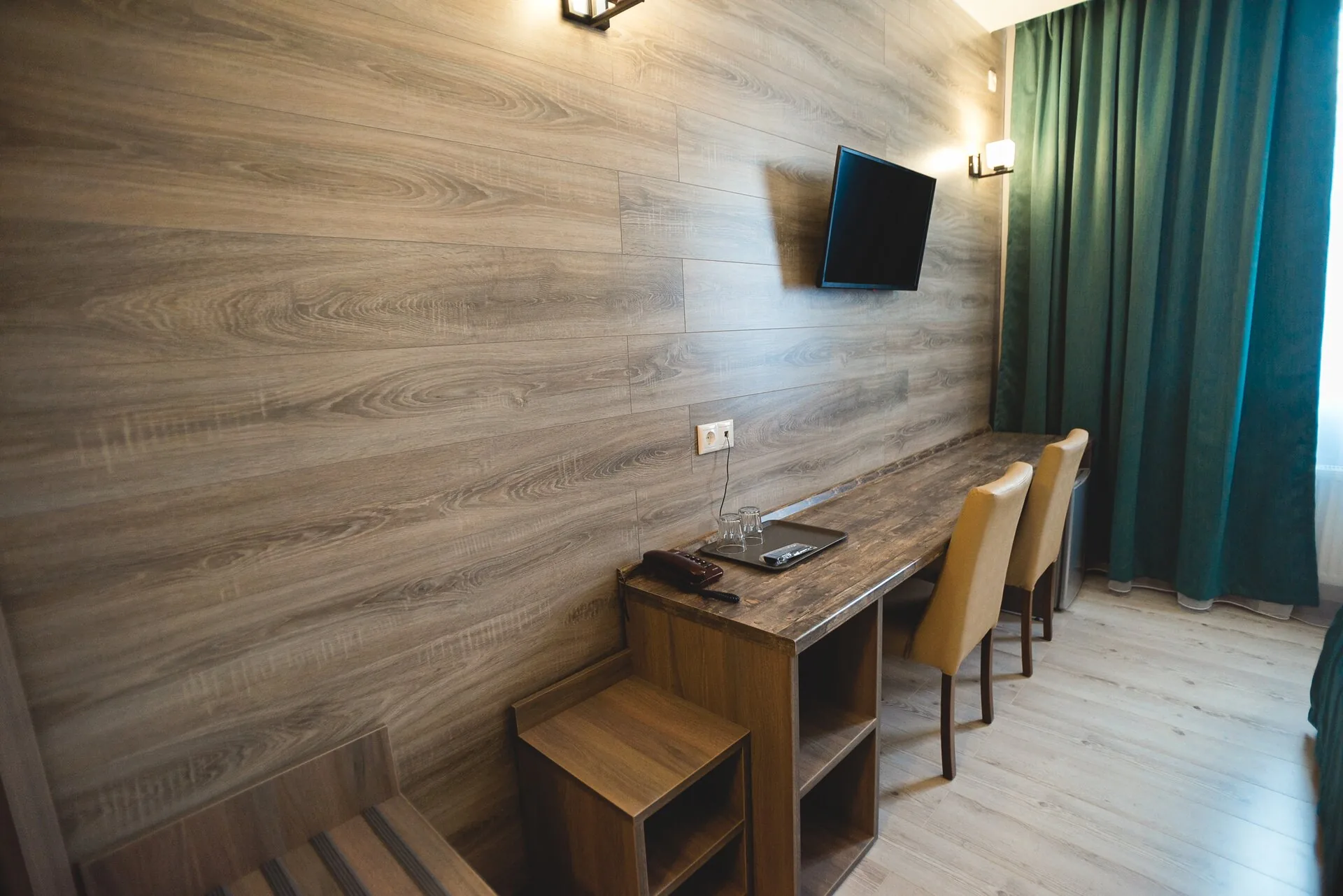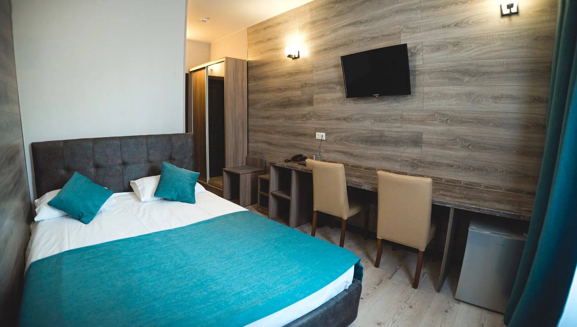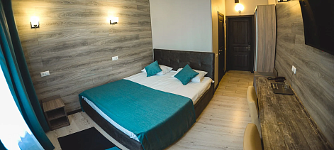 В номере: зеркало, кровать двуспальная, прикроватные тумбочки, стол, стул, шкаф, кондиционер, мини-холодильник, телевизор ЖК, электрочайник