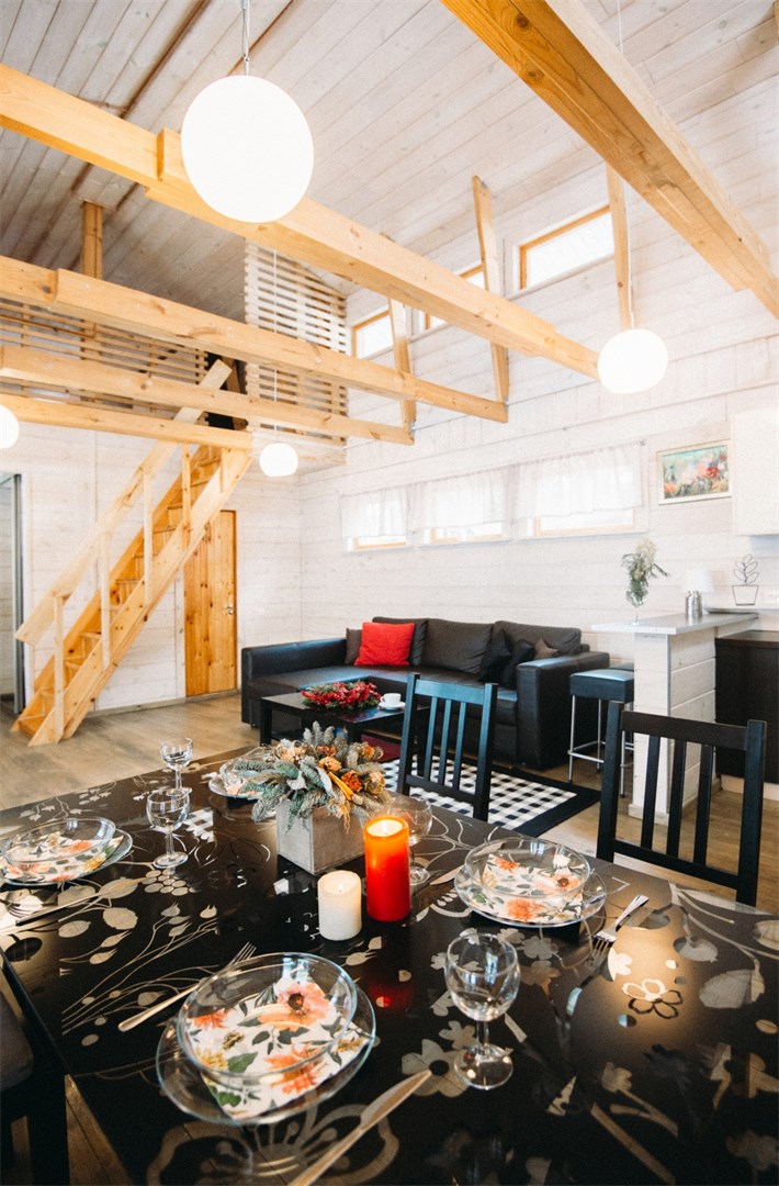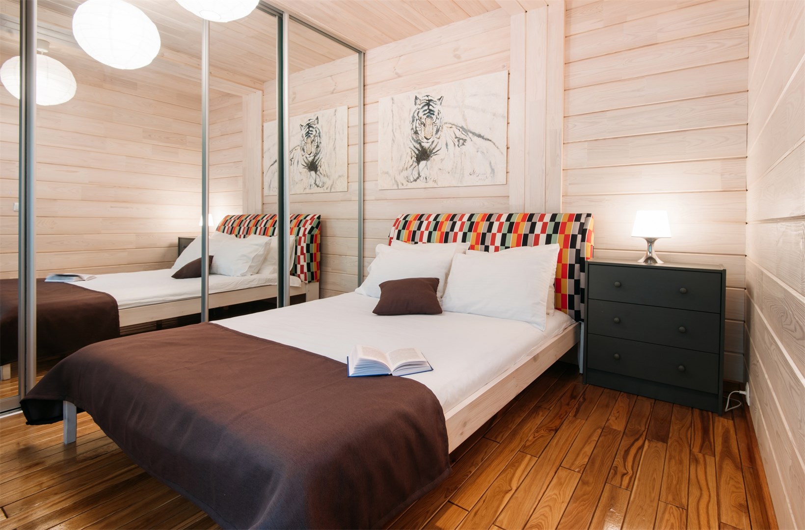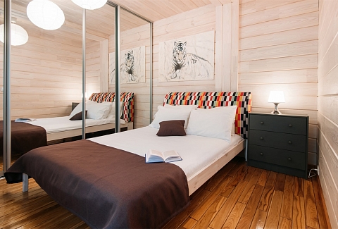 В номере: вешалка, гардеробная, зеркало, кровати односпальные /одна двуспальная кровать, кровать двуспальная, кухонная мебель, прикроватные тумбочки, стол обеденный, стулья, шкаф, микроволновая печь, набор посуды, плита электрическая, телевизор ЖК, холодильник
