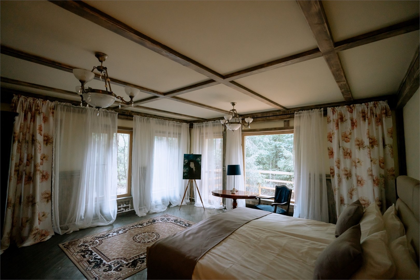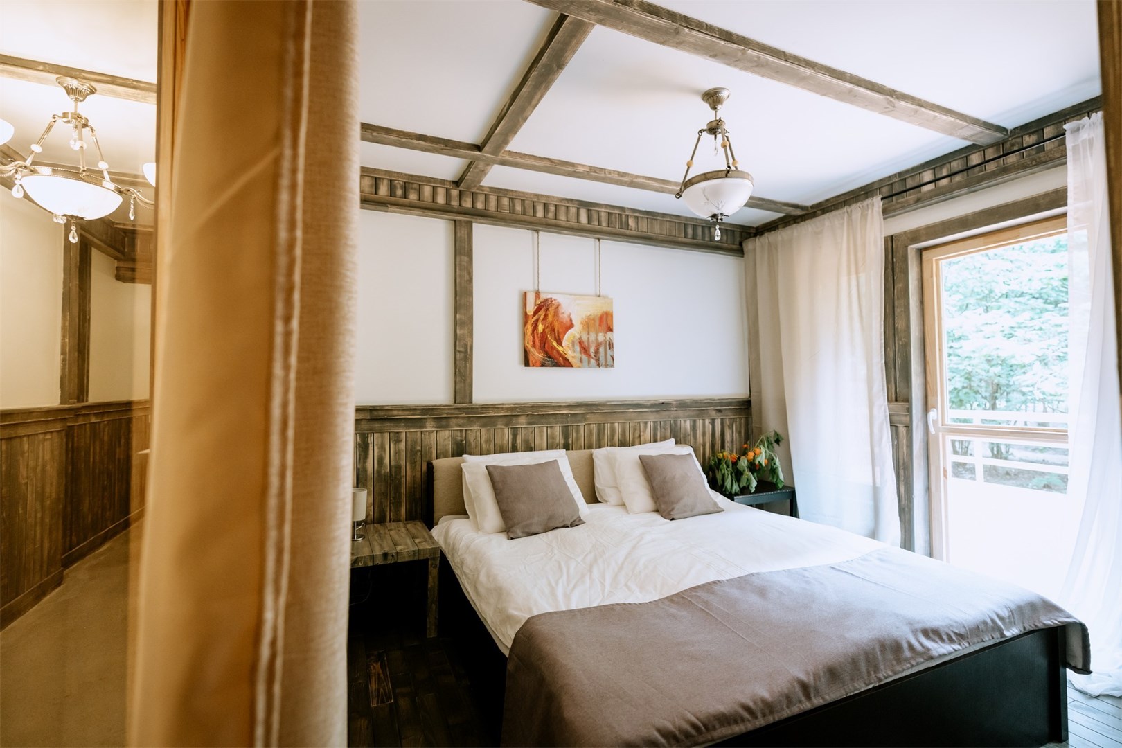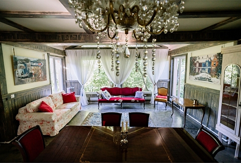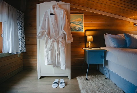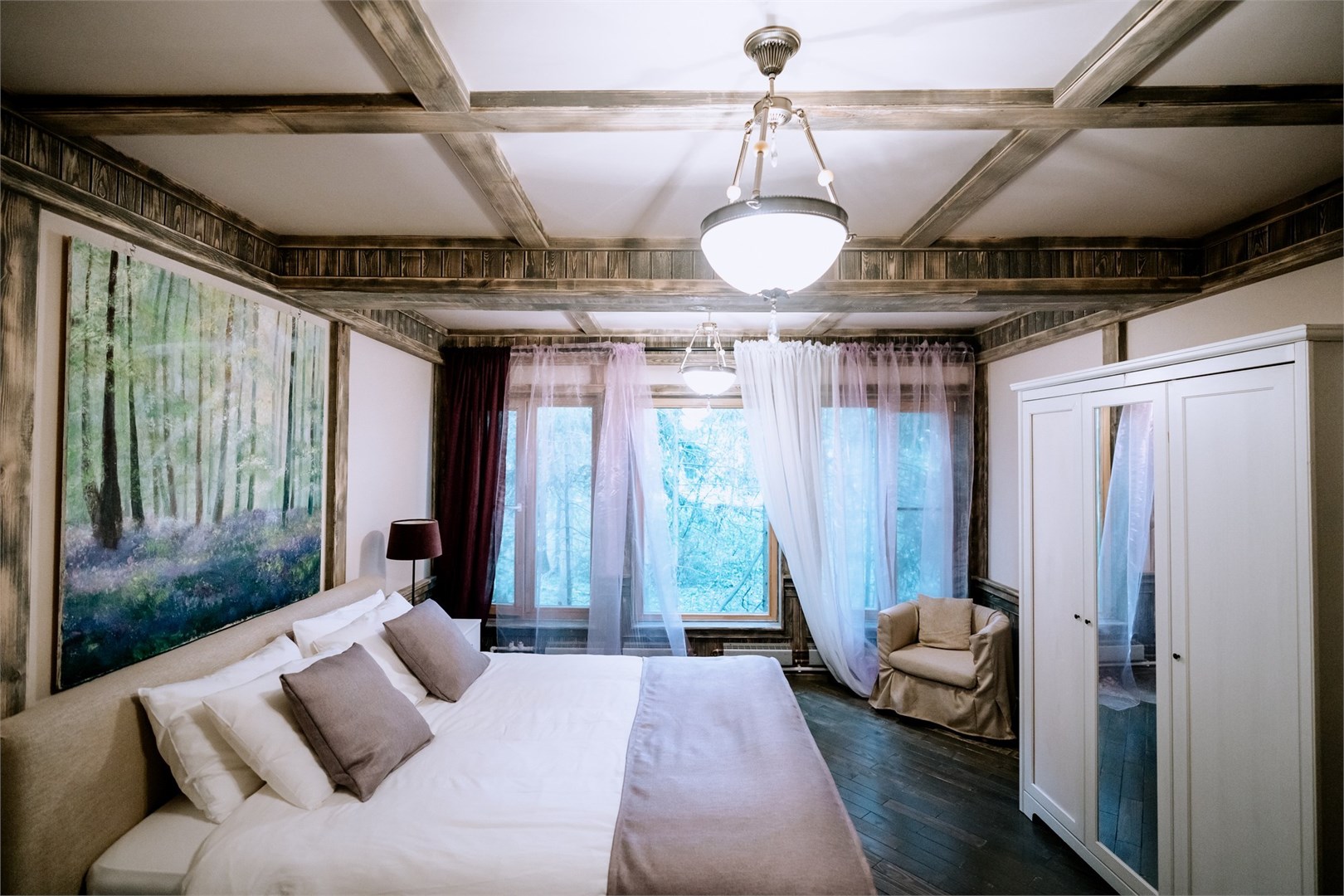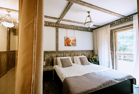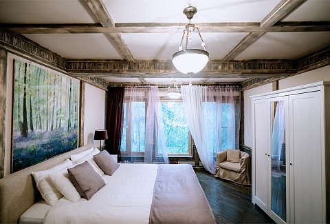 В номере: вешалка, диван, зеркало, кресла, кровать двуспальная, кровать односпальная, прикроватные тумбочки, стол, стулья, шкаф, микроволновая печь, набор посуды, телевизор, холодильник, чайный набор посуды, электрочайник